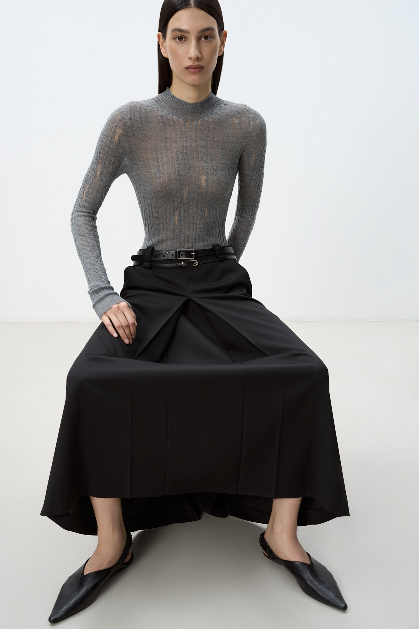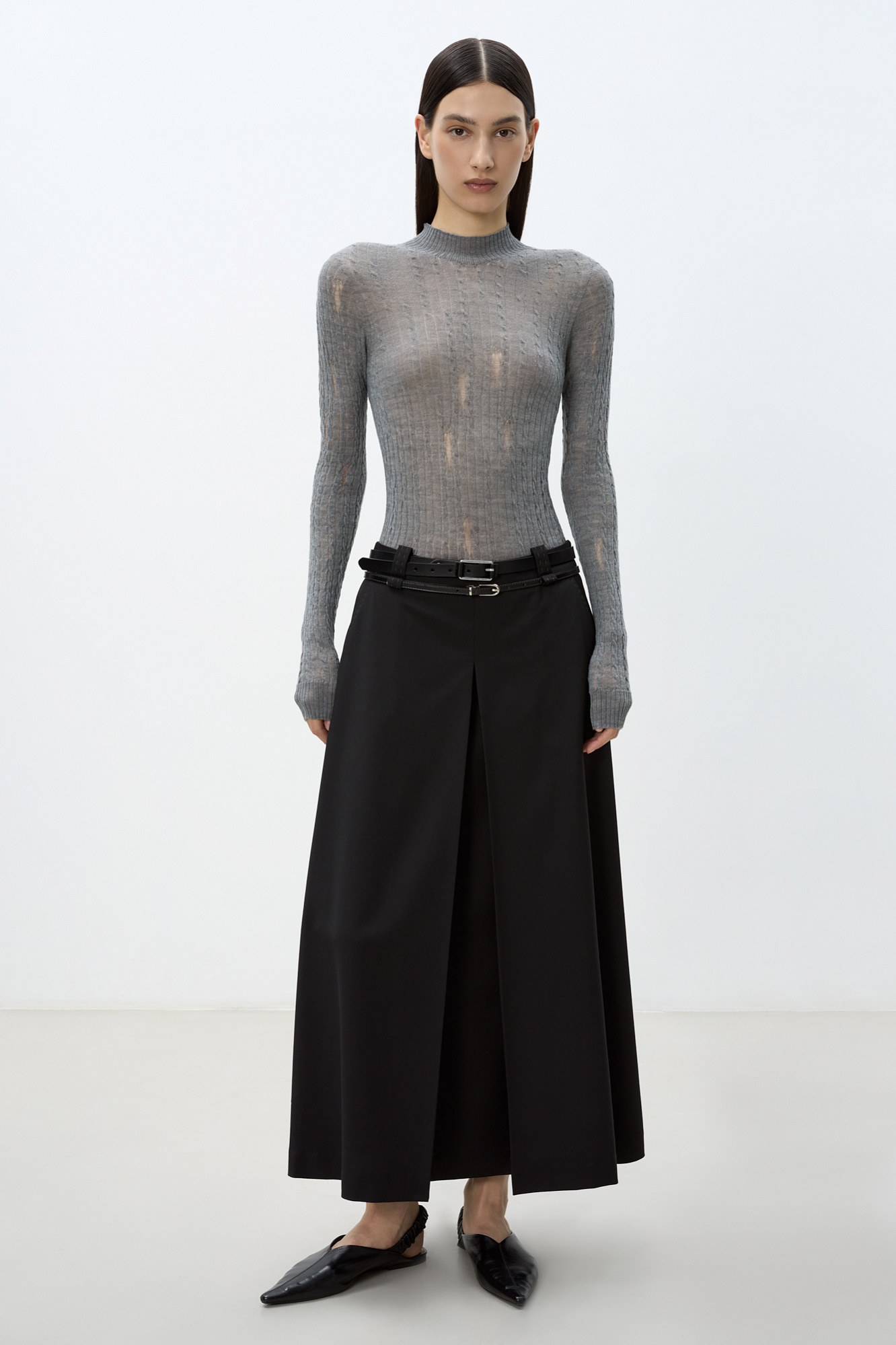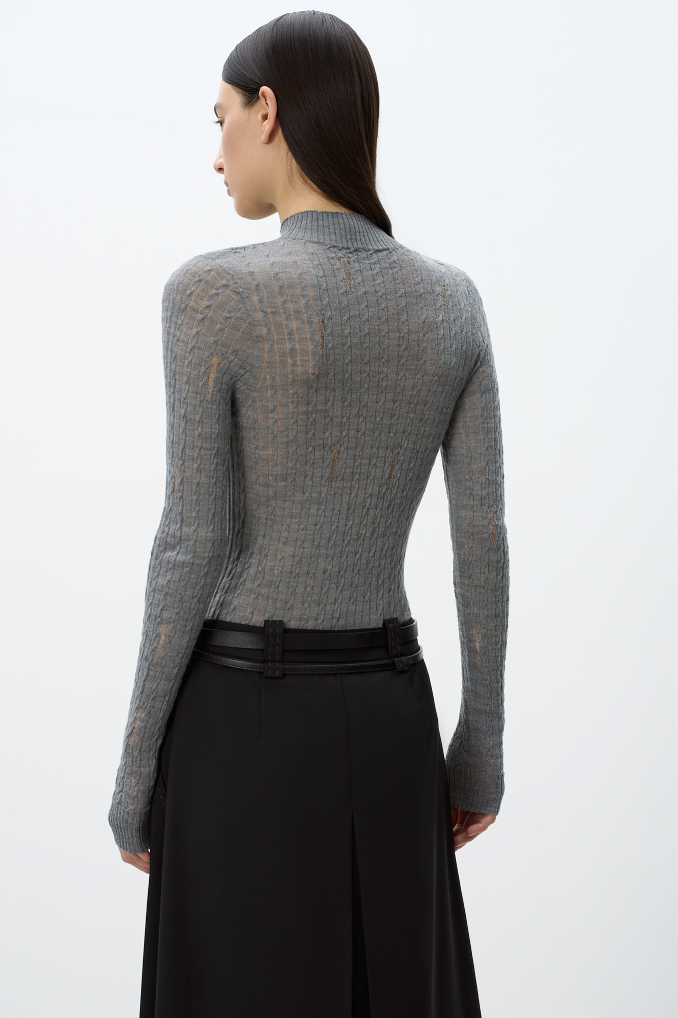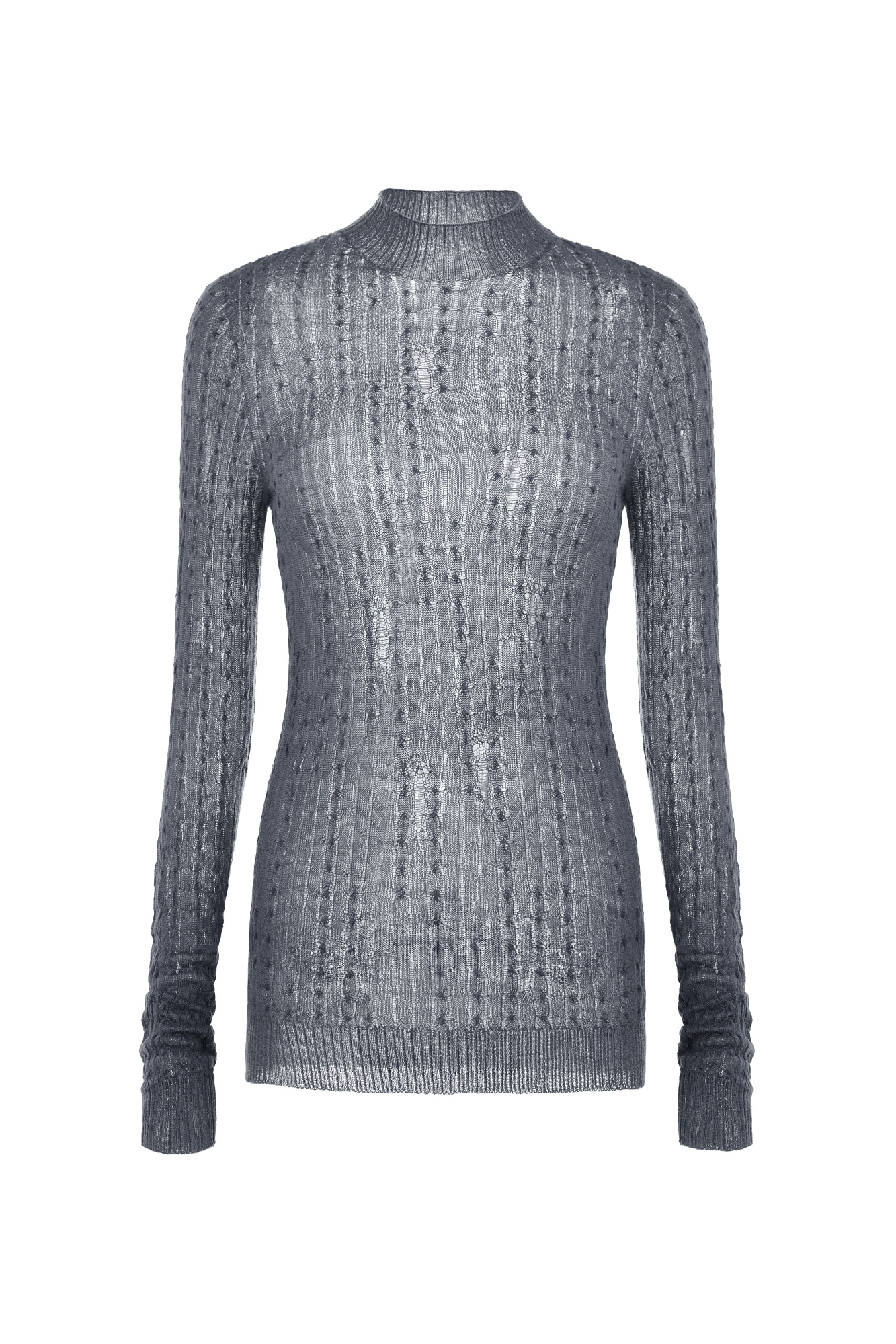 Бесшовная водолазка в стиле гранж из шерсти мериноса экстрафайн. Модель с невысоким воротником-стойкой. Манжеты рукавов, воротник и низ изделия выполнены в рубчик.