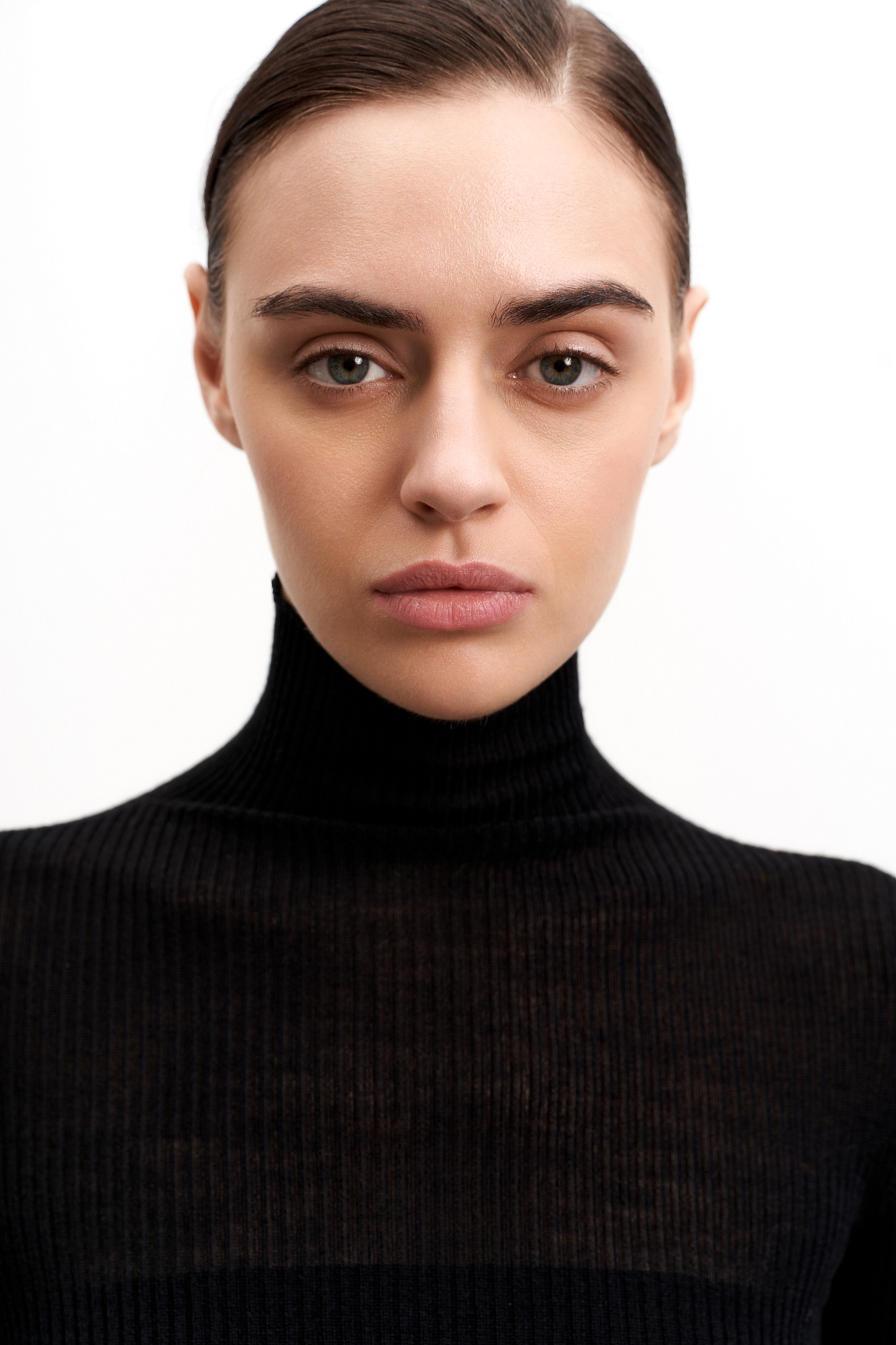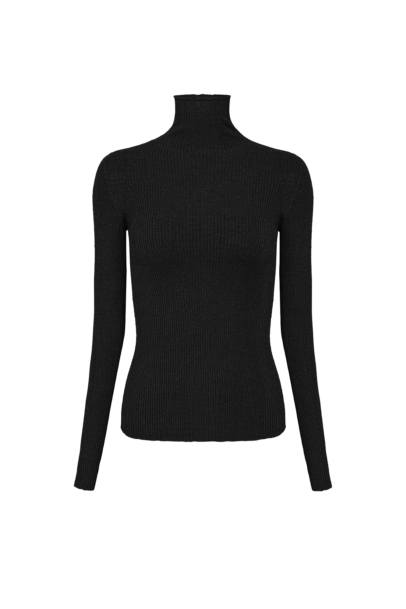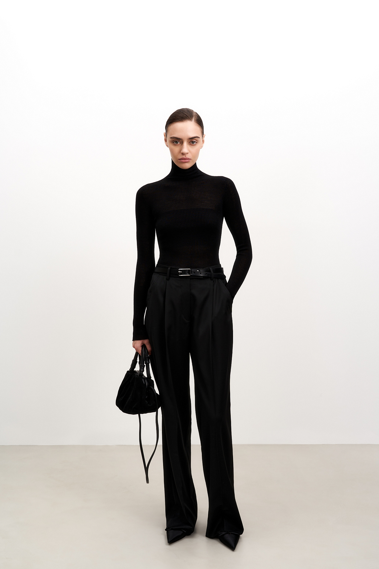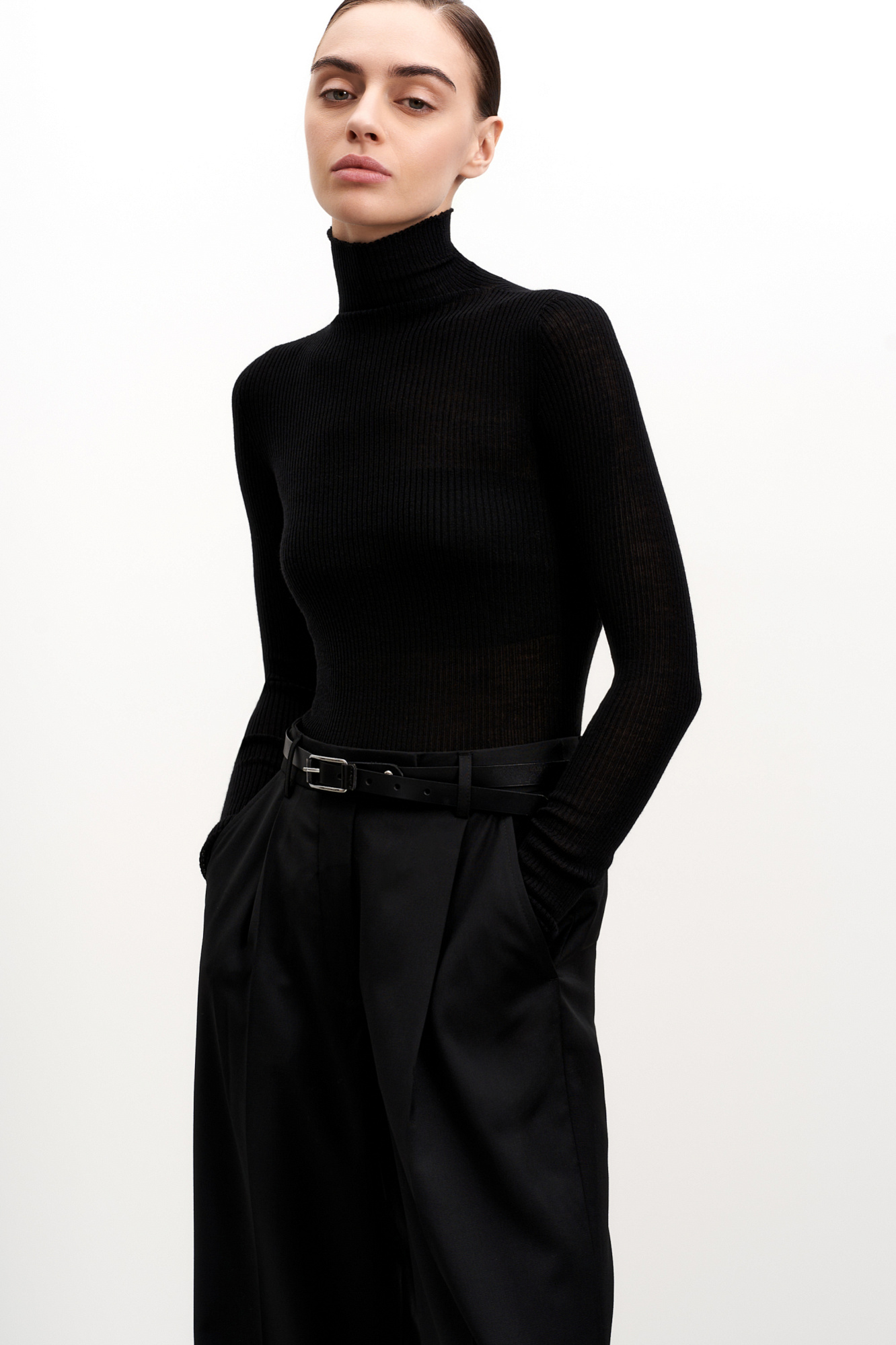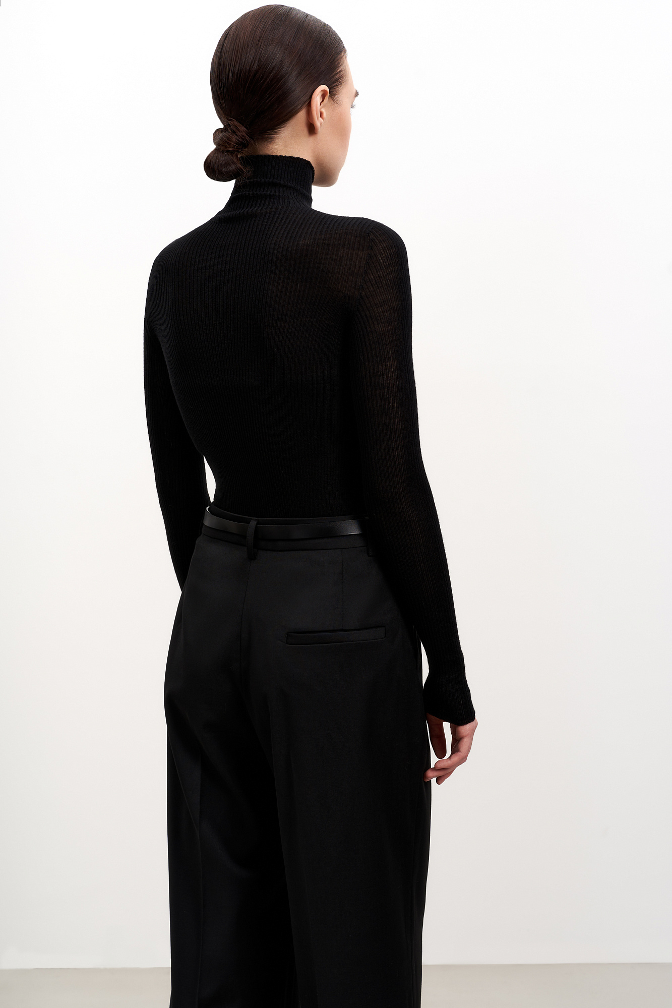 Бесшовная трикотажная водолазка из шерсти мериноса экстрафайн. Модель приталенного силуэта, с длинными рукавами и высоким воротником-стойкой.