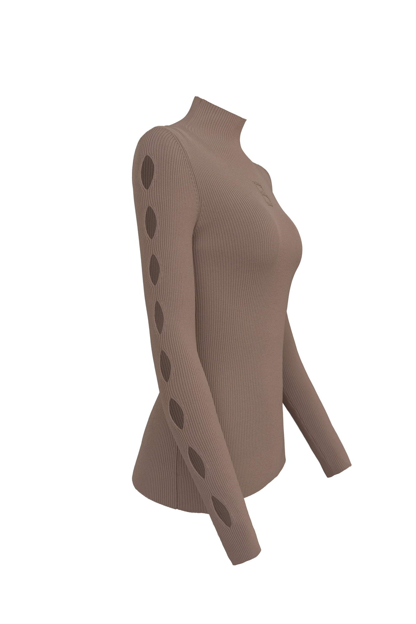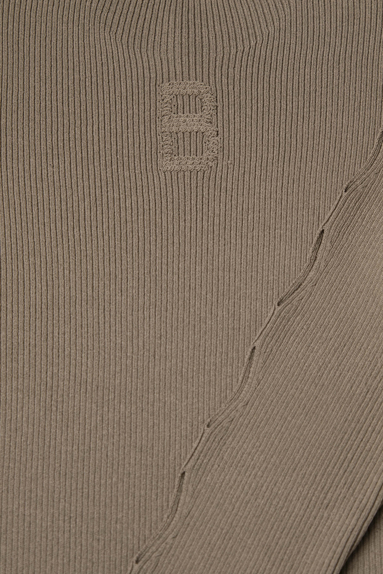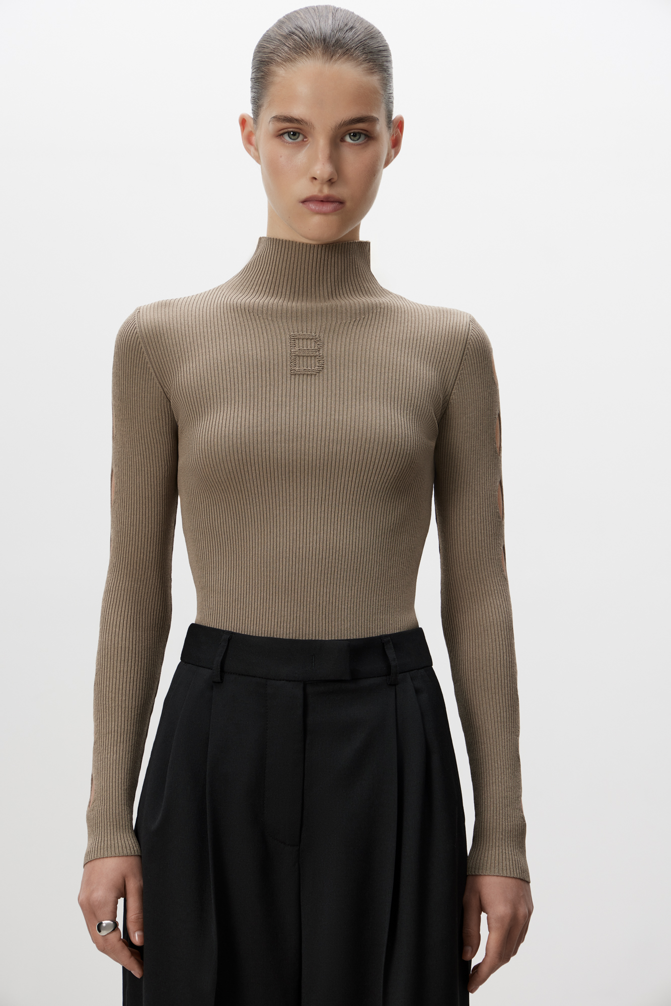Трикотажная водолазка из вискозы. Модель приталенного силуэта, с воротником-стойкой и длинными рукавами реглан. Изделие декорировано вывязанным логотипом на груди и разрезами на внешней стороне рукавов.