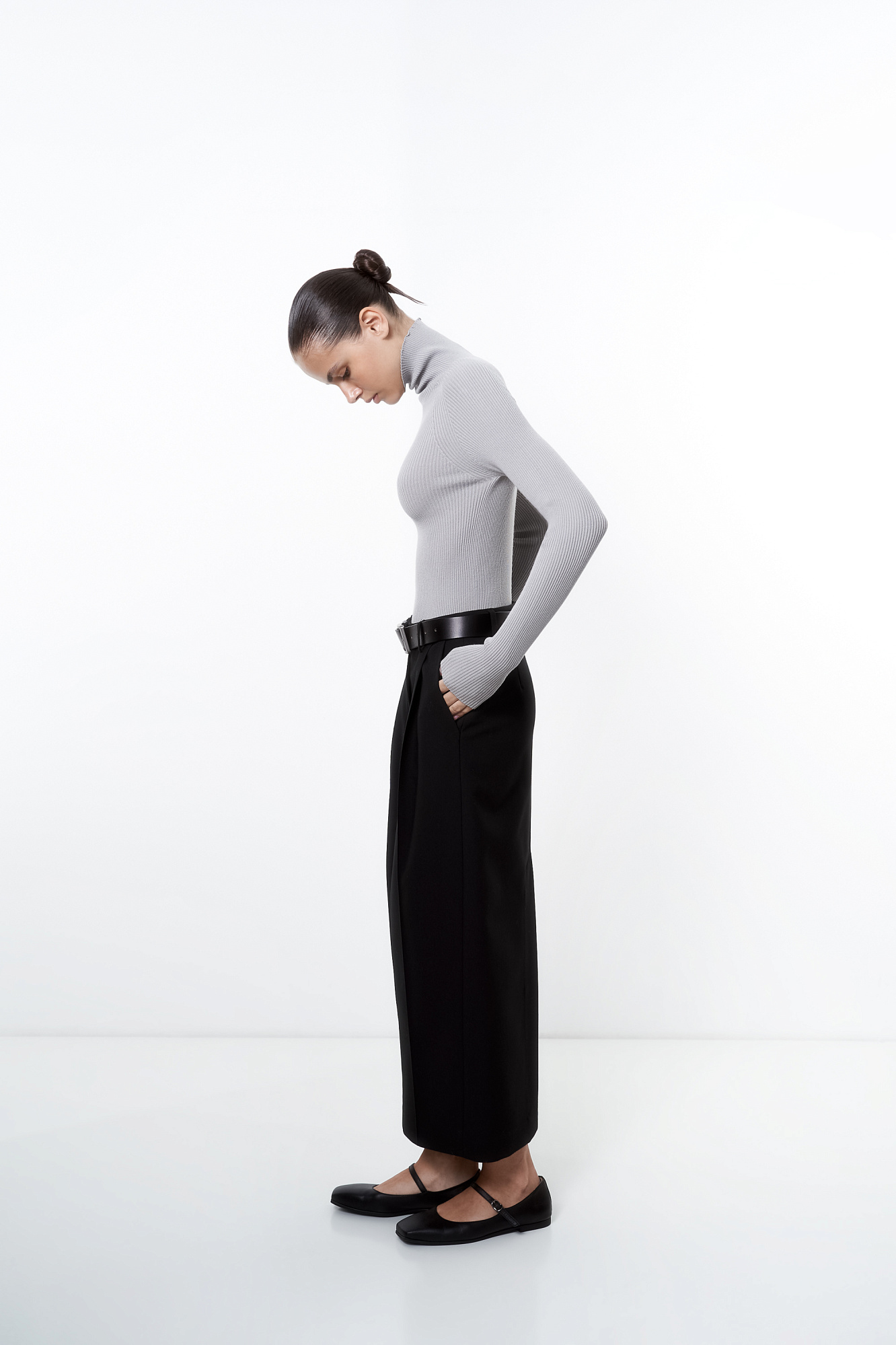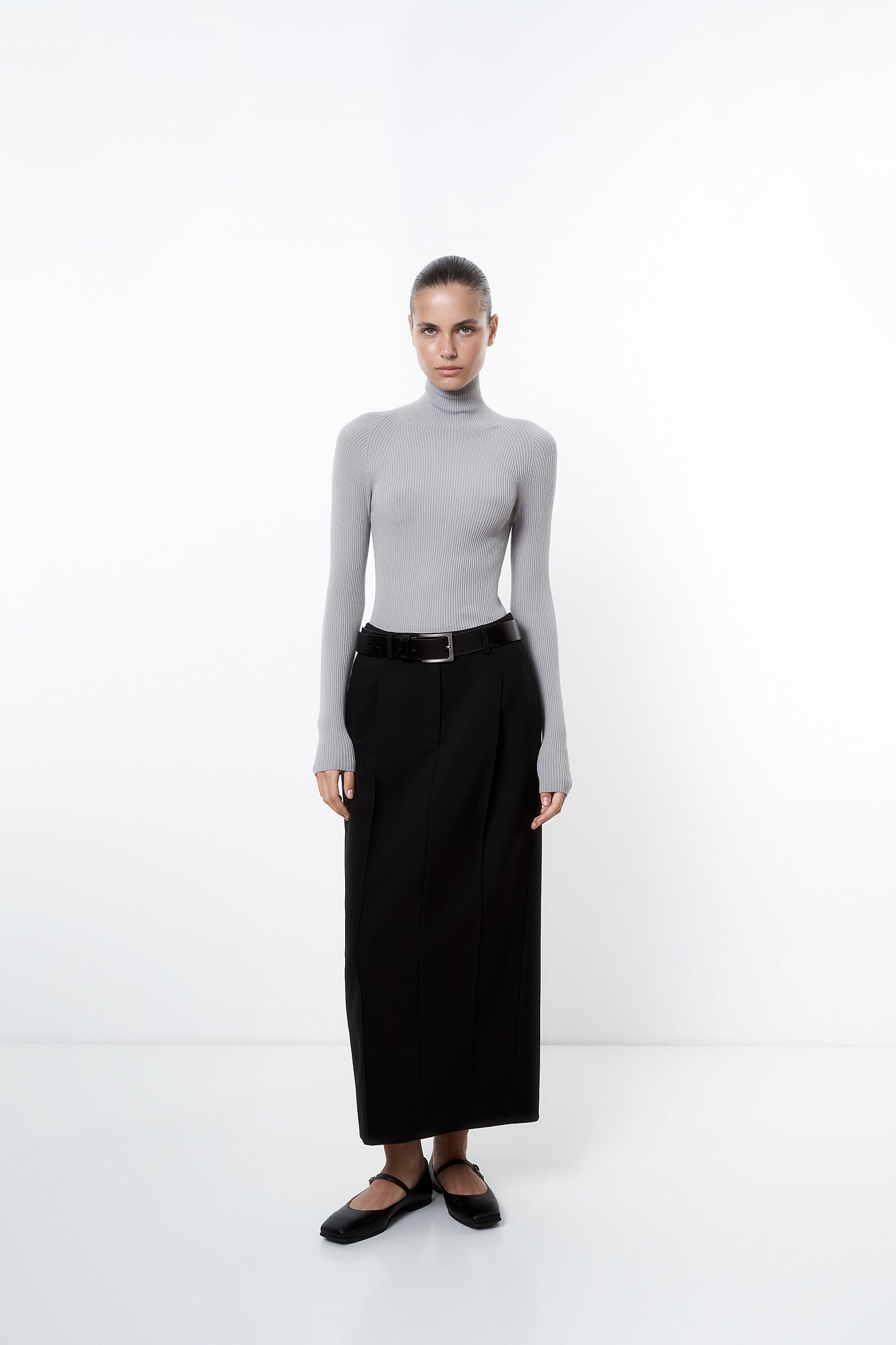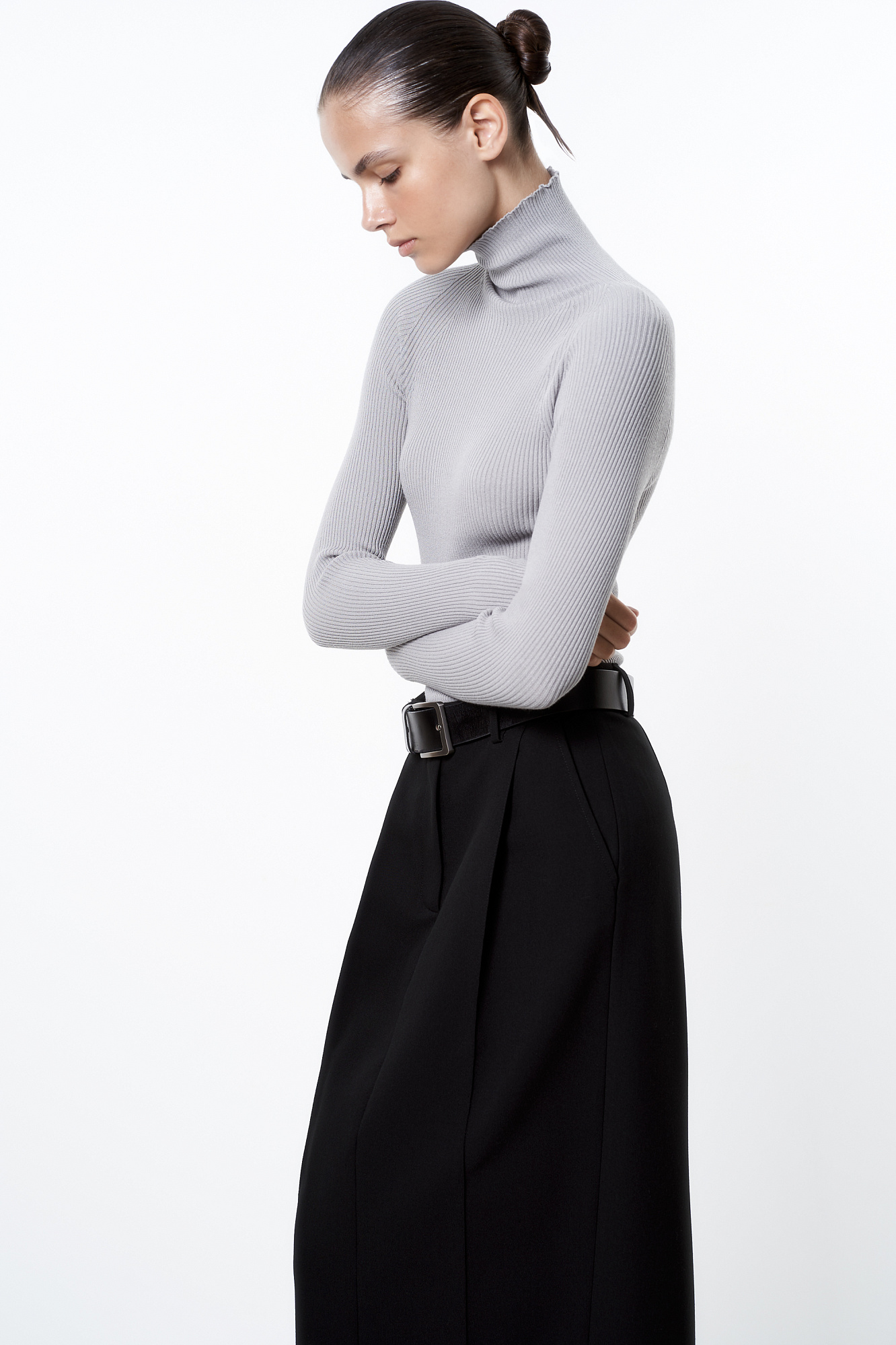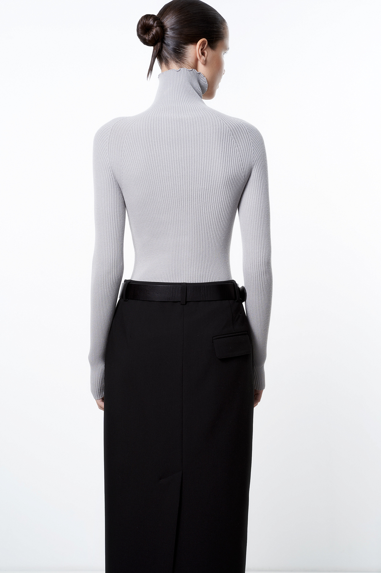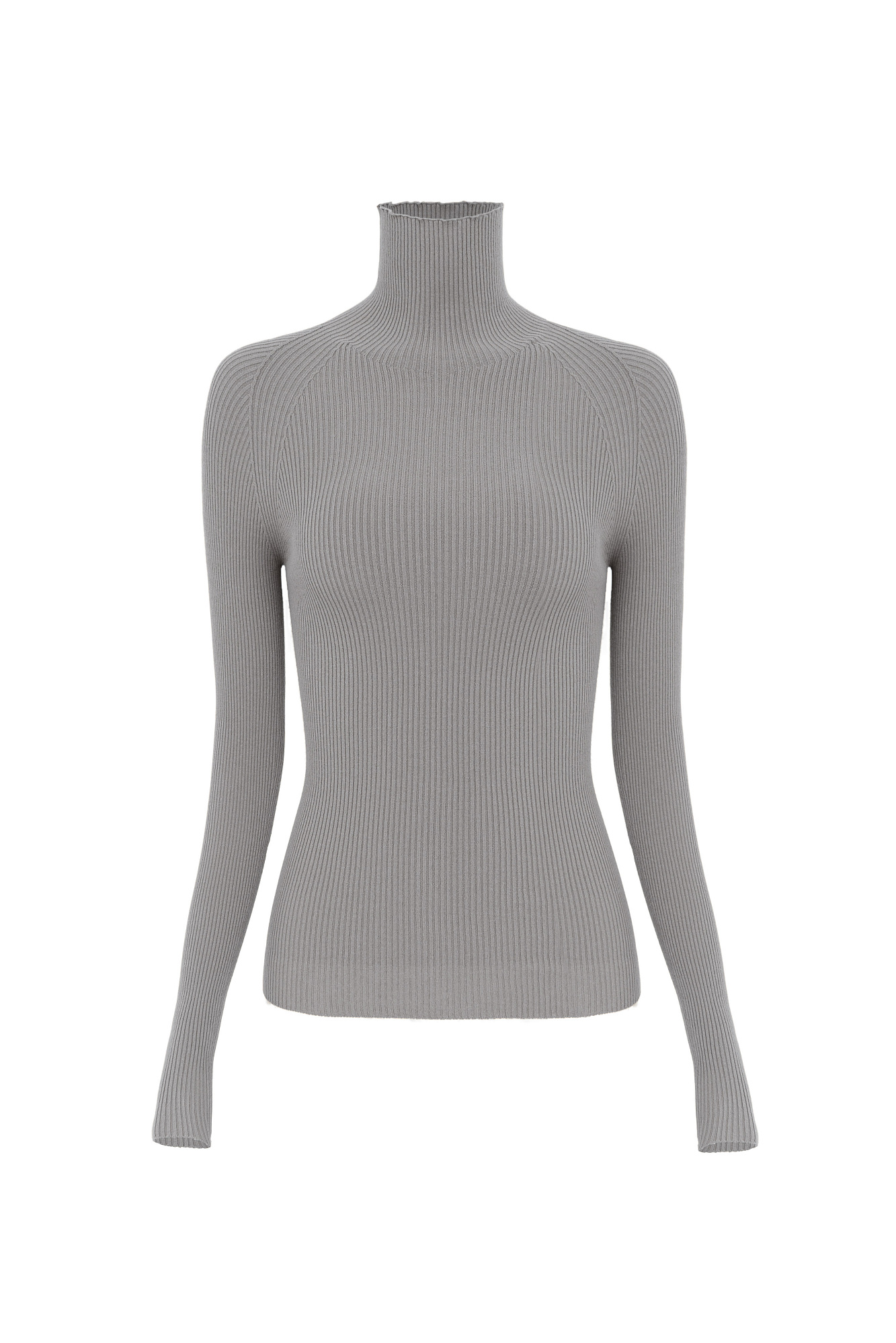 Трикотажная бесшовная водолазка из эластичной вискозы. Модель приталленого силуэта, с высоким воротником-стойкой и длинными рукавами. Изделие выполнено в рубчик.
