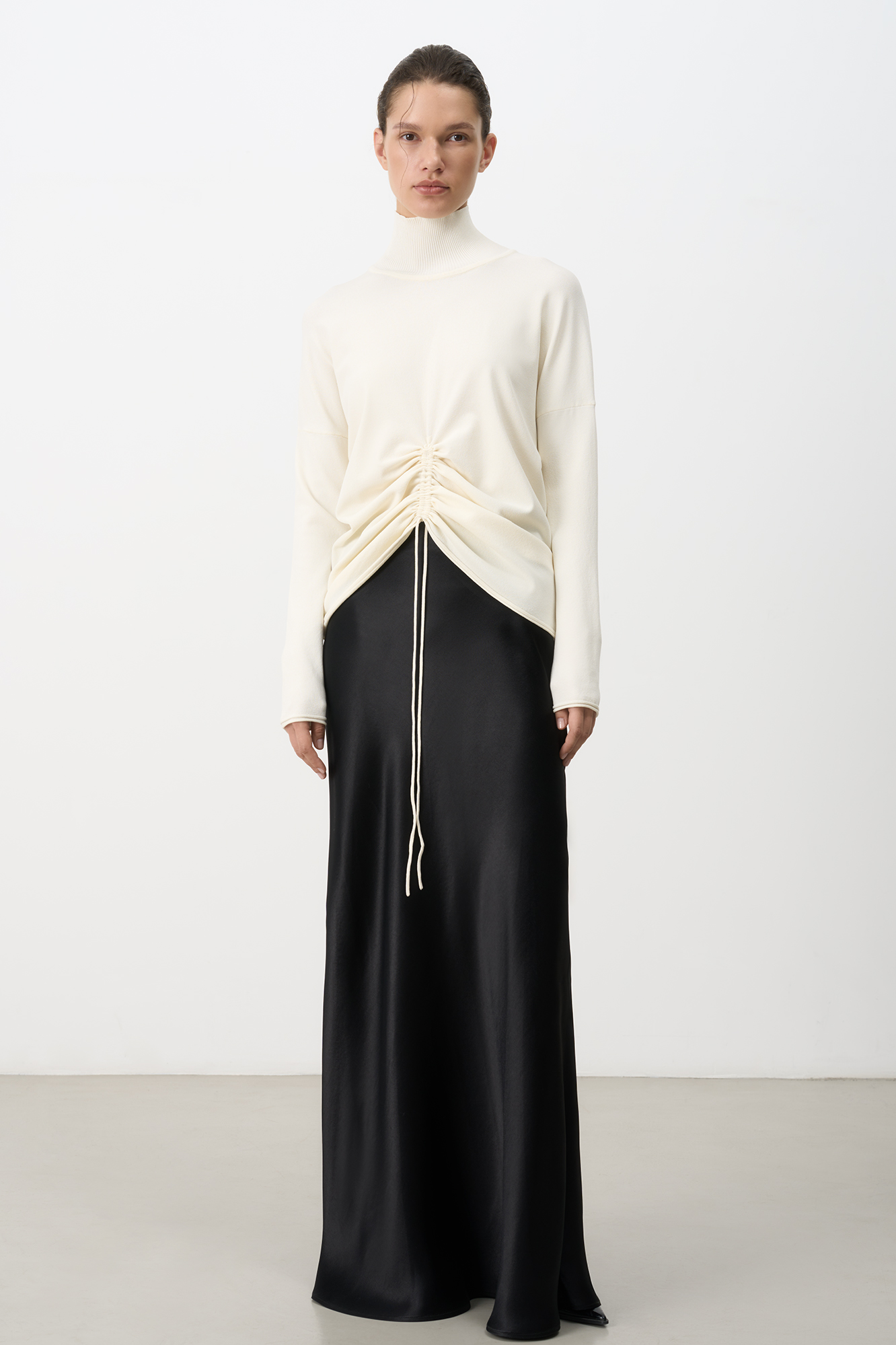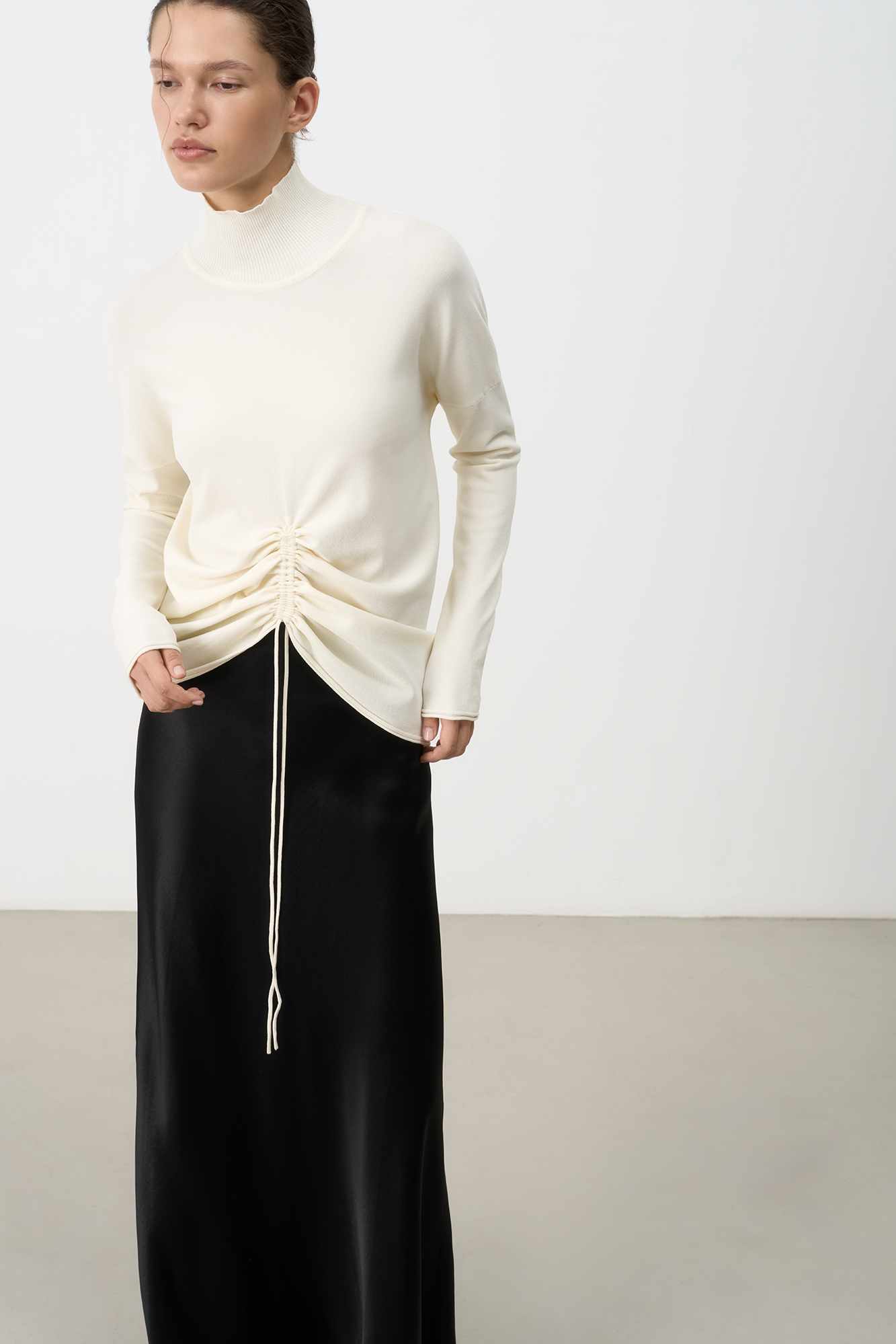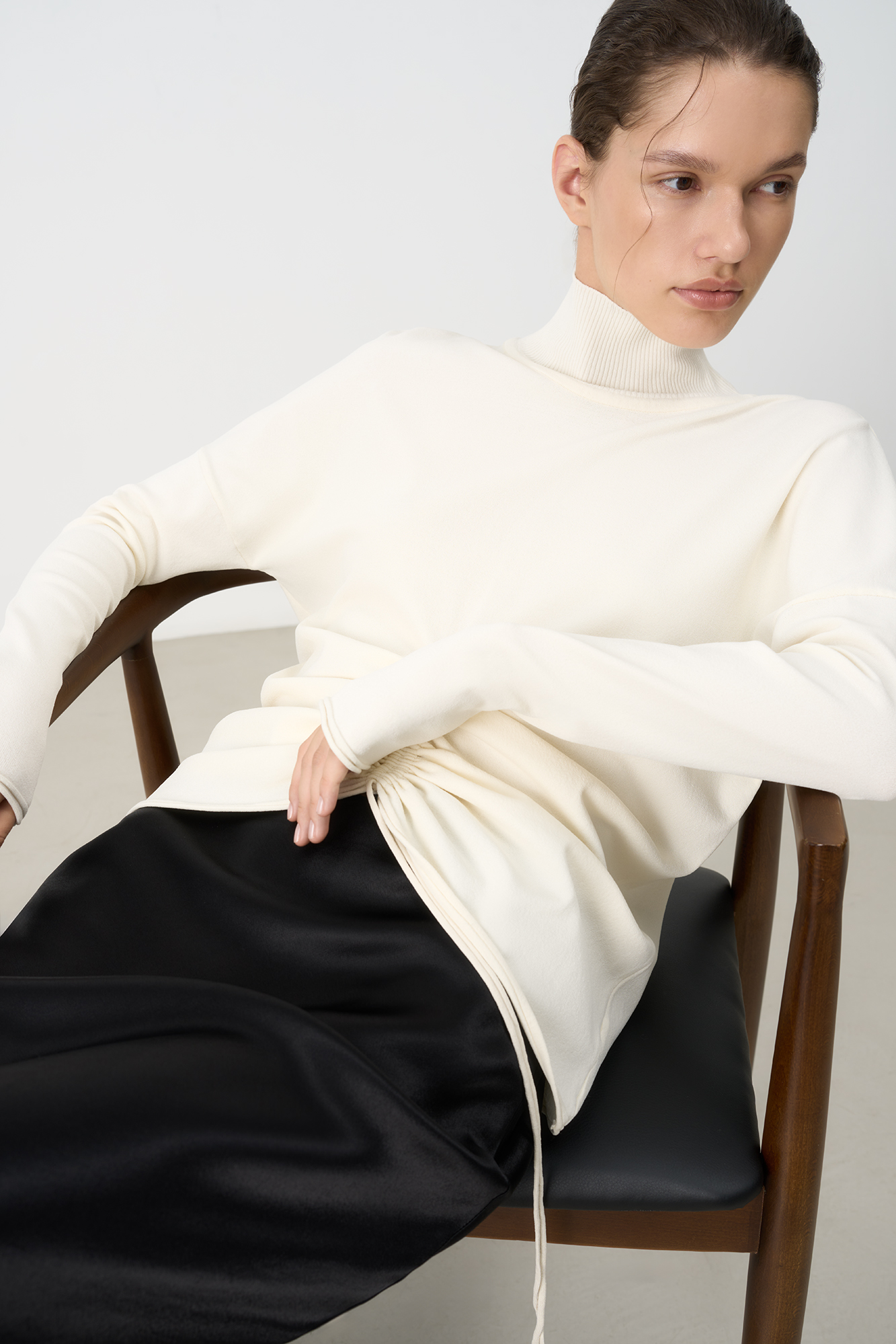 Трикотажная водолазка из вискозы. Модель свободного силуэта, со спущенной линией плеча, длинными рукавами и воротником-гольф в рубчик. Изделие декорировано драпировкой, регулируемой кулиской.