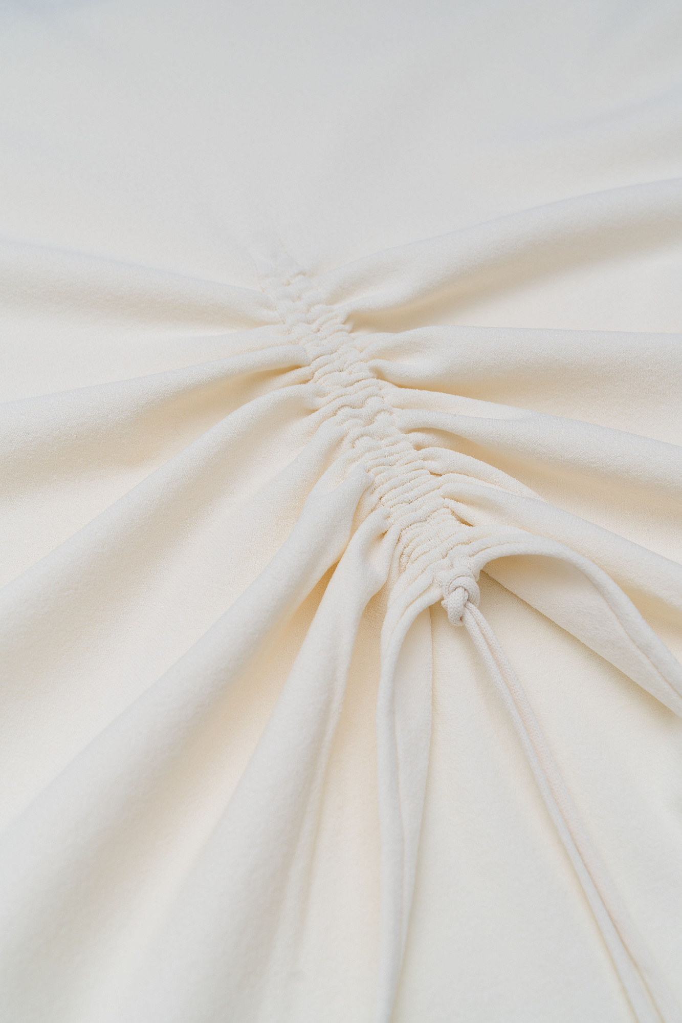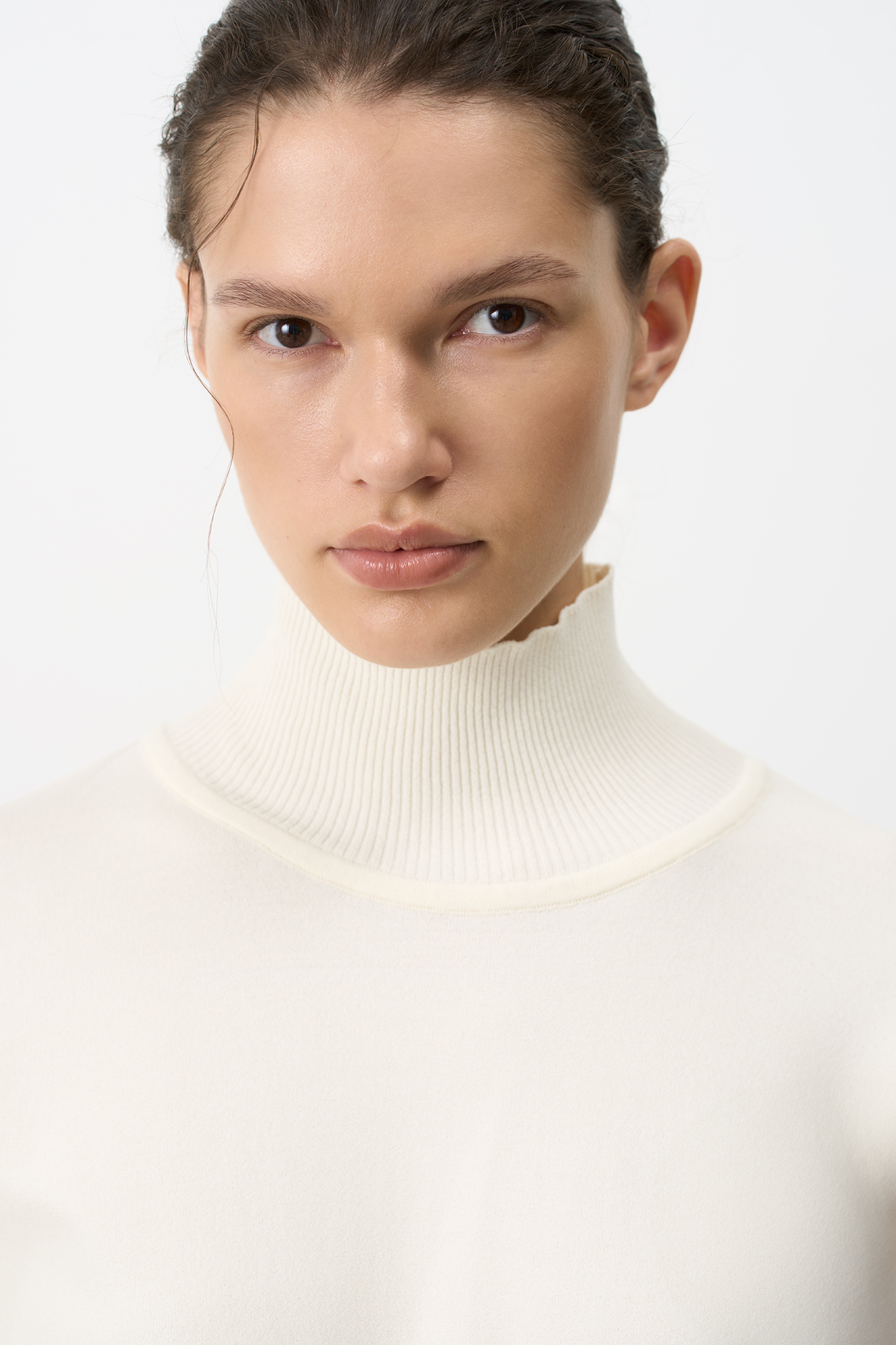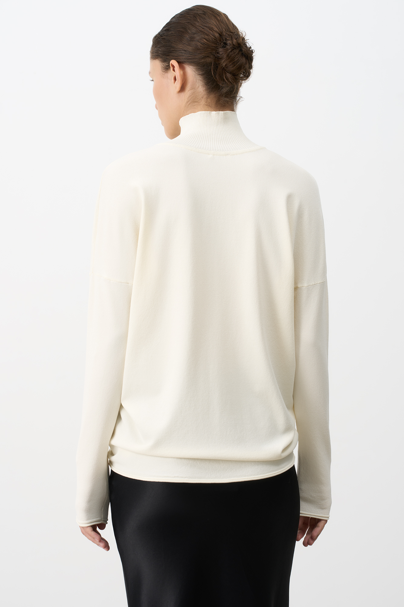 Трикотажная водолазка из вискозы. Модель свободного силуэта, со спущенной линией плеча, длинными рукавами и воротником-гольф в рубчик. Изделие декорировано драпировкой, регулируемой кулиской.