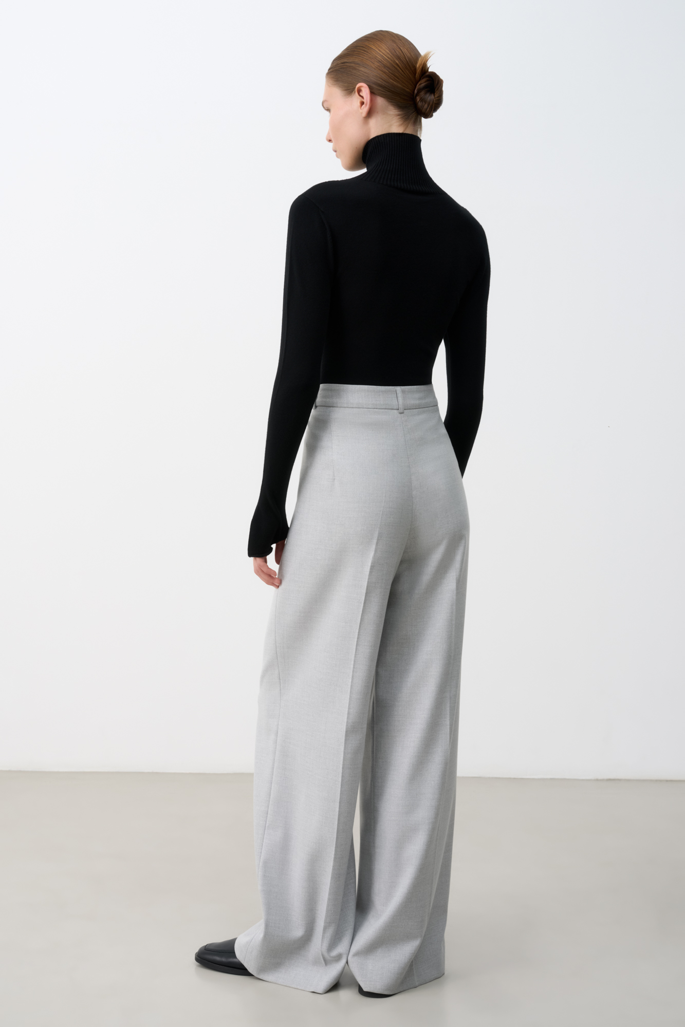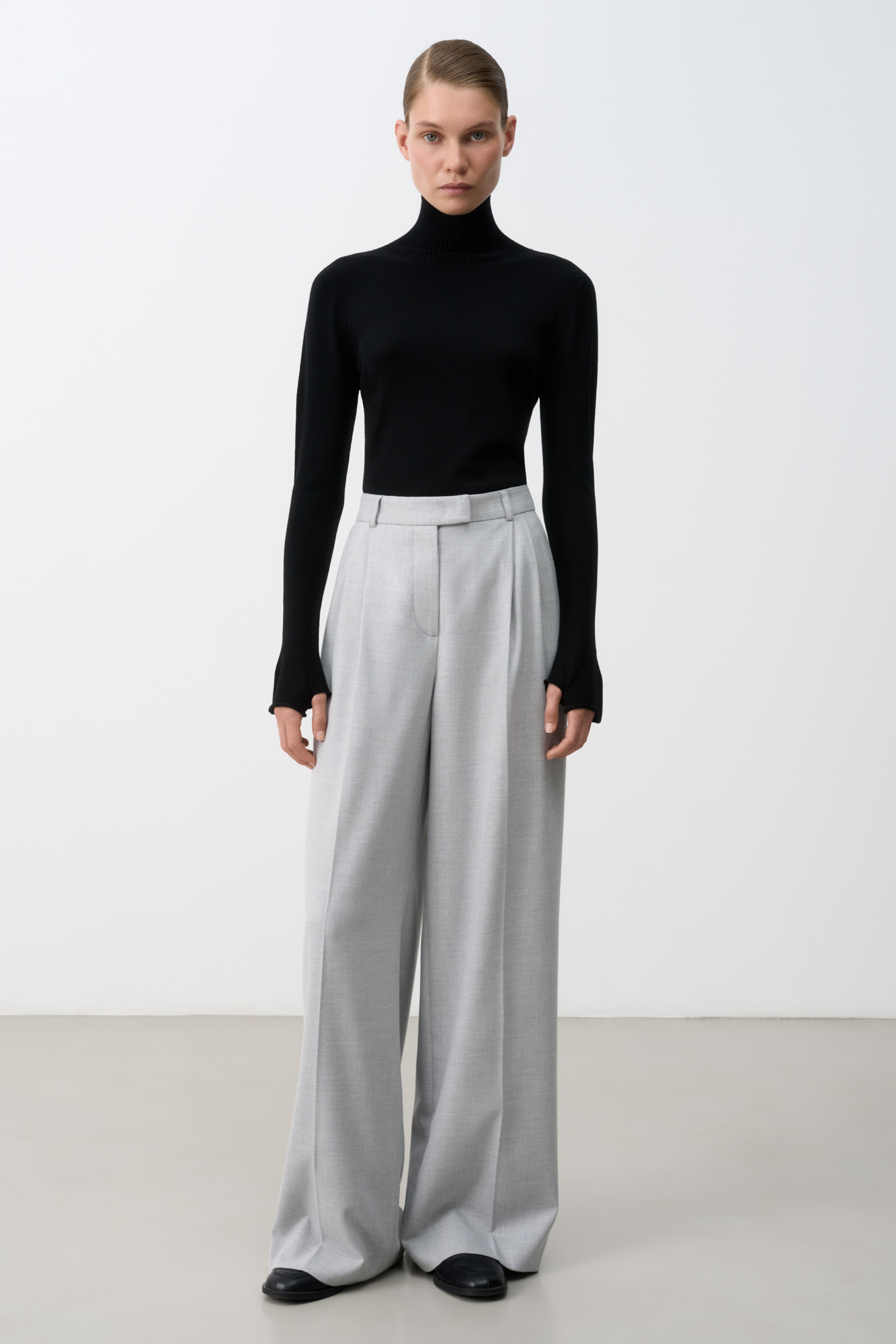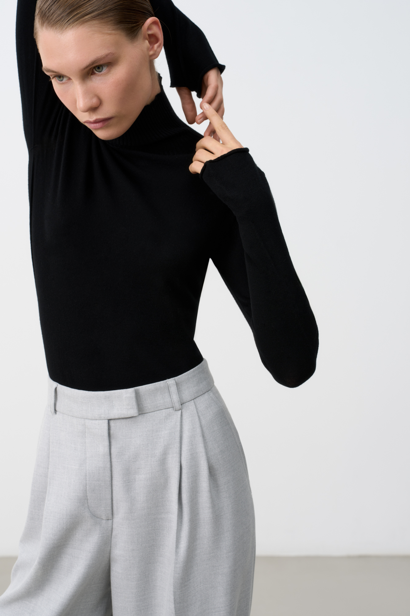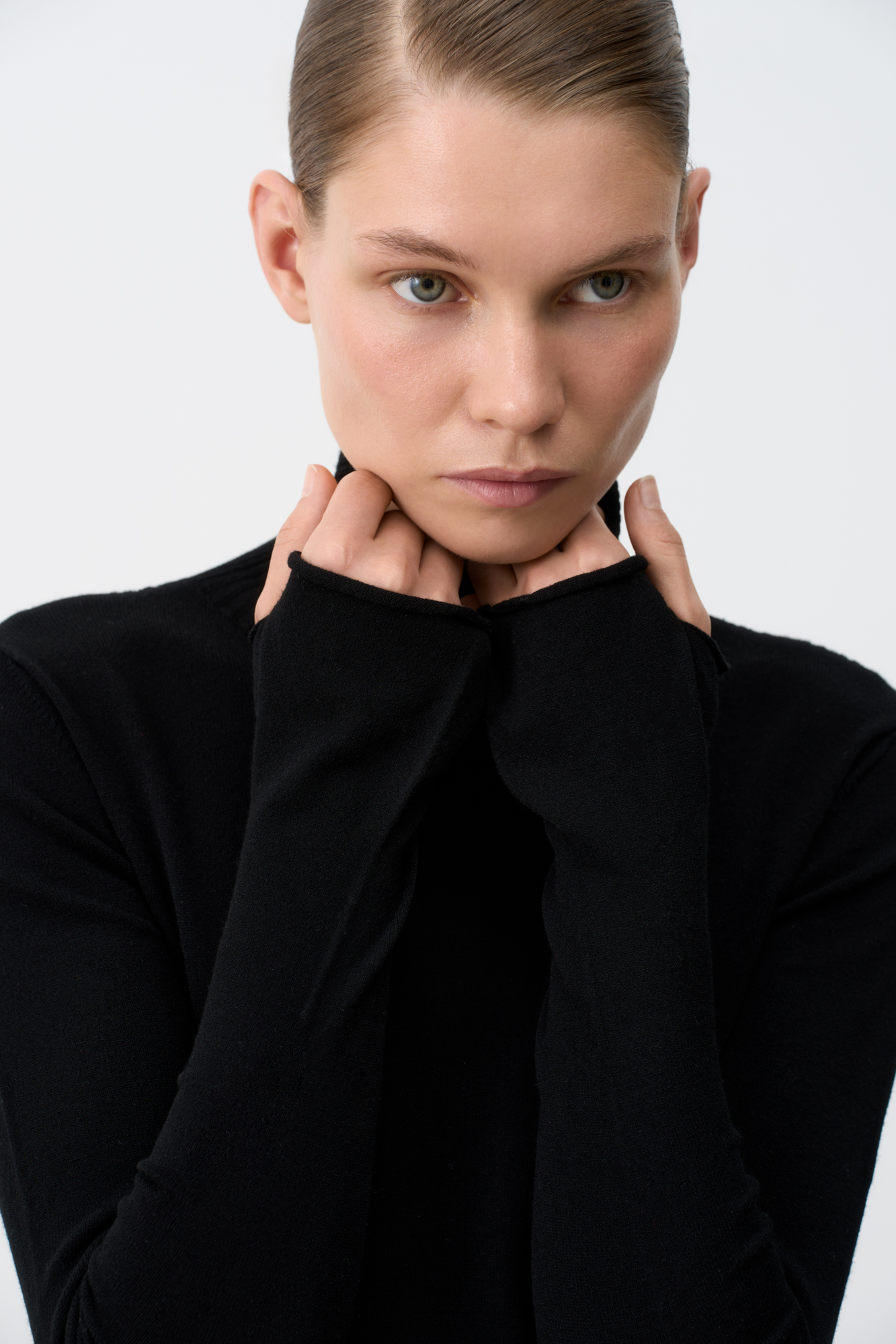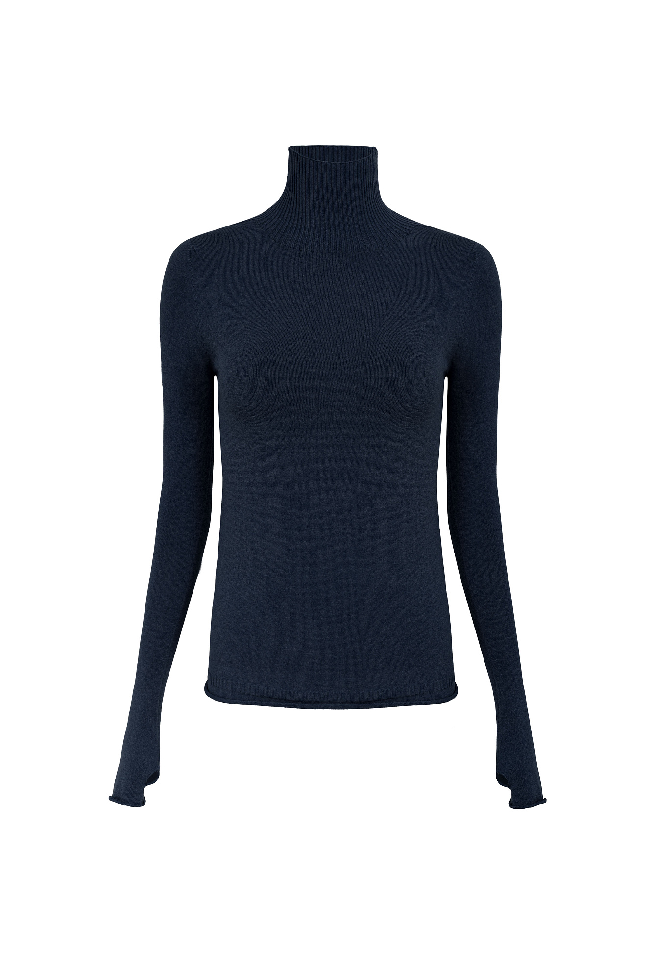 Классическая водолазка из вискозы облегающего силуэта с высоким воротом под горло. Удлиненные рукава-митенки.
