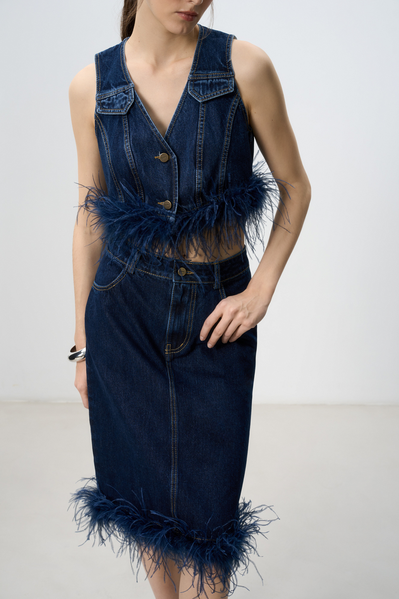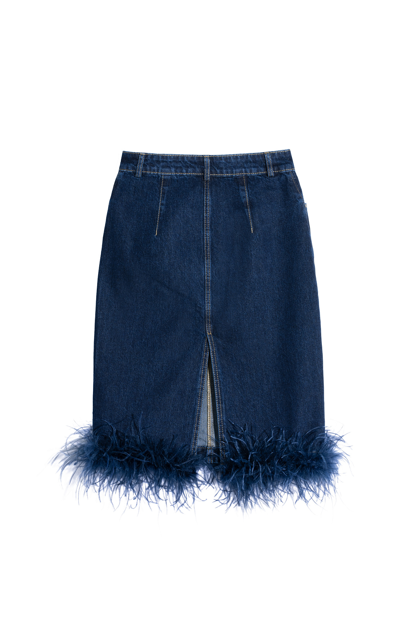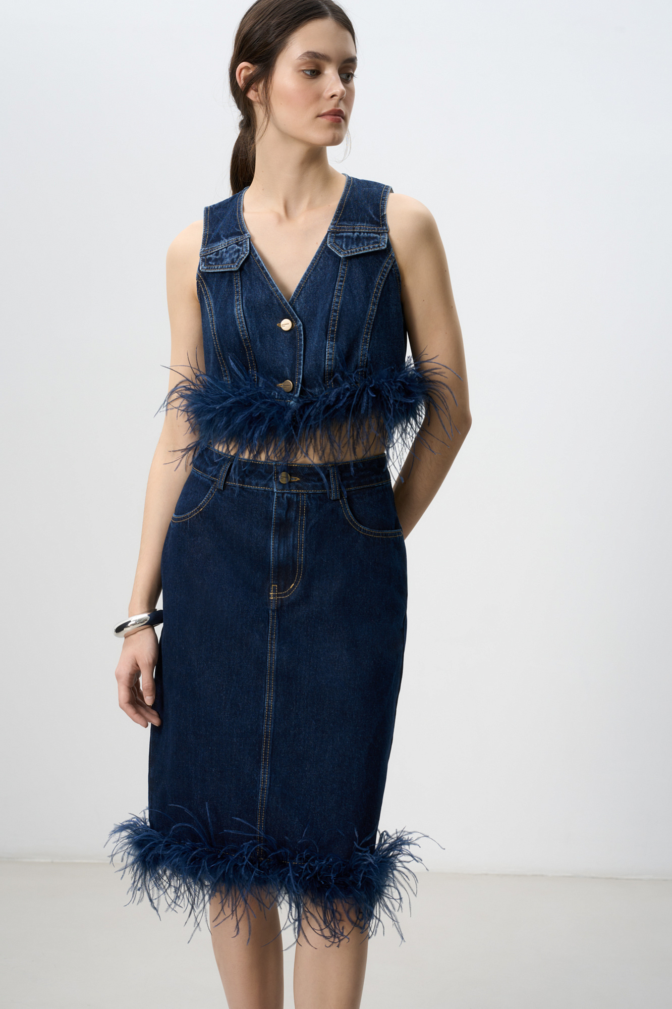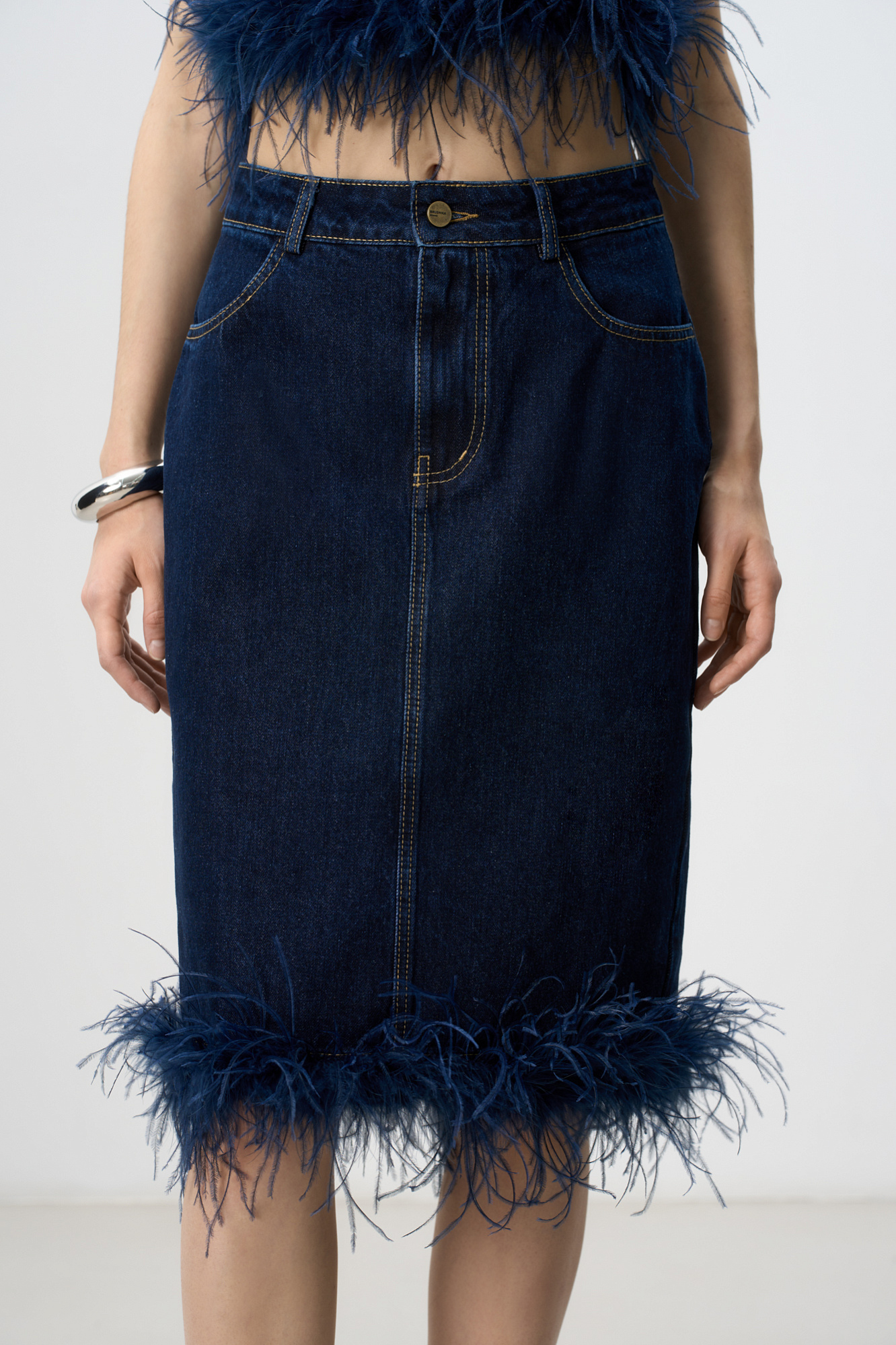 Джинсовая юбка длины миди, декорированная лентой со страусиными перьями. Лента с перьями отстегивается. Застежка изделия на молнию и пуговицу. Два кармана, шлевки на поясе для ремня.