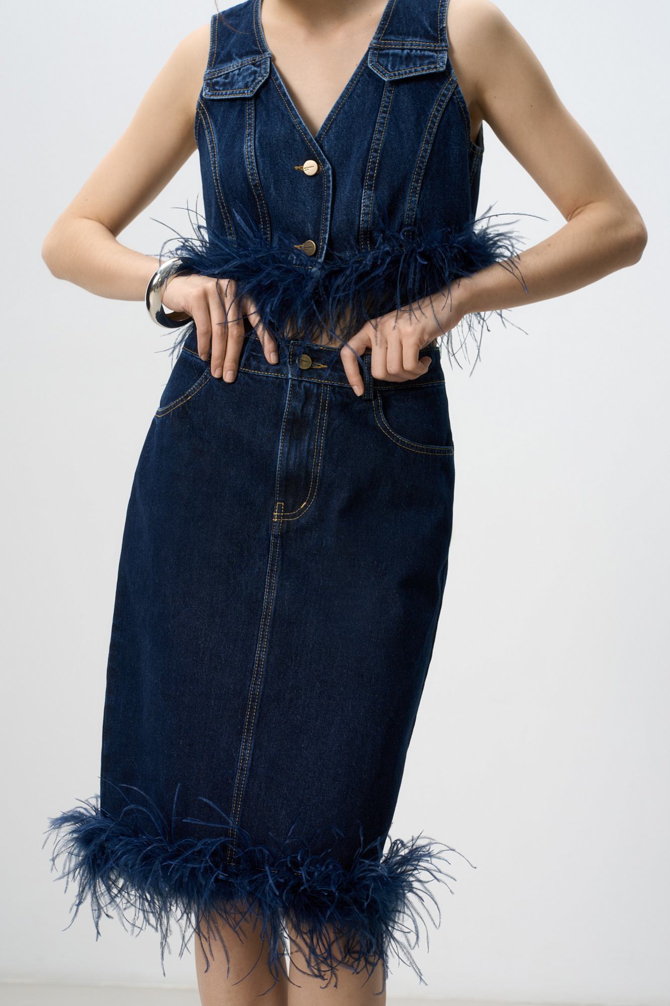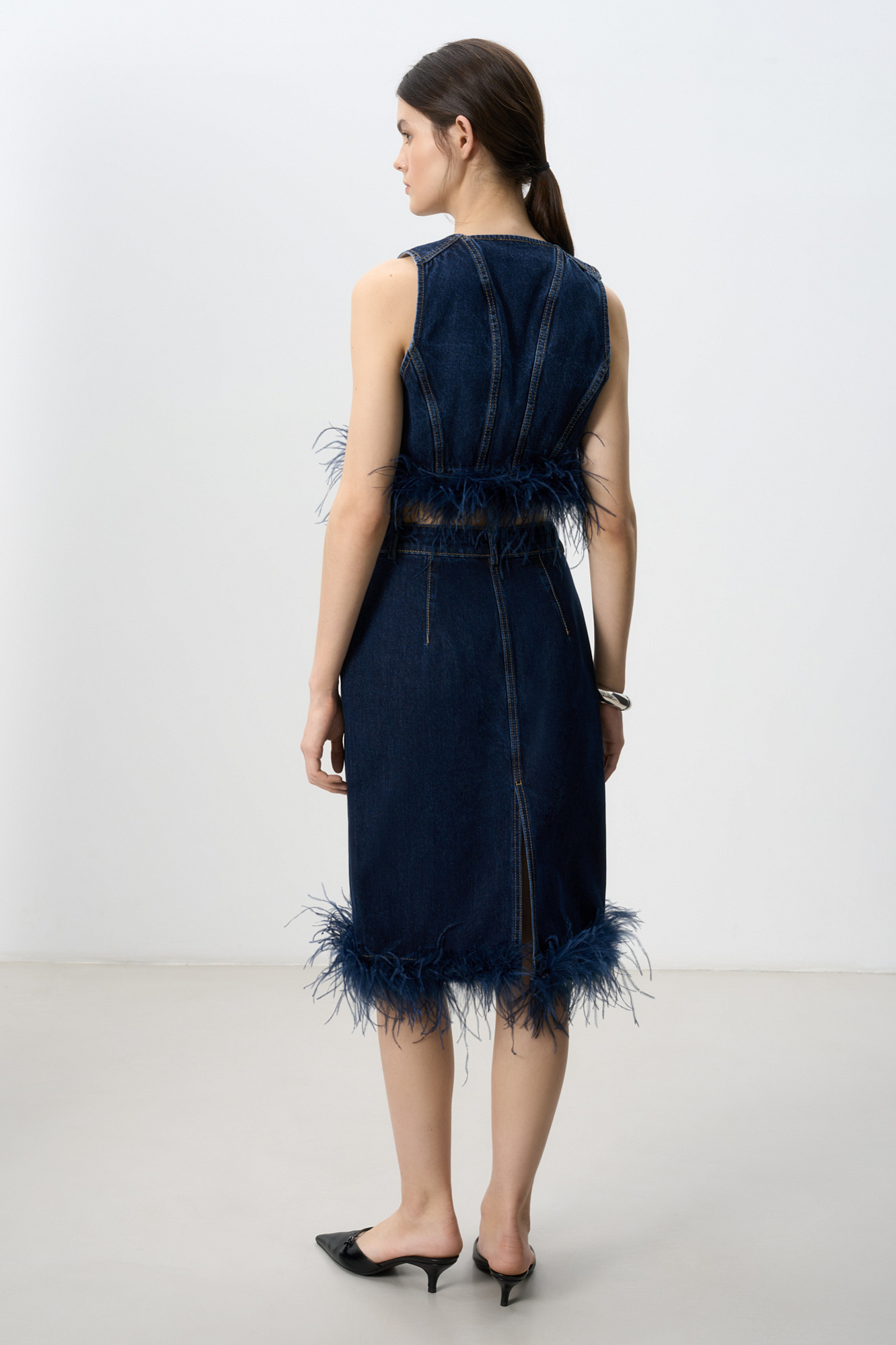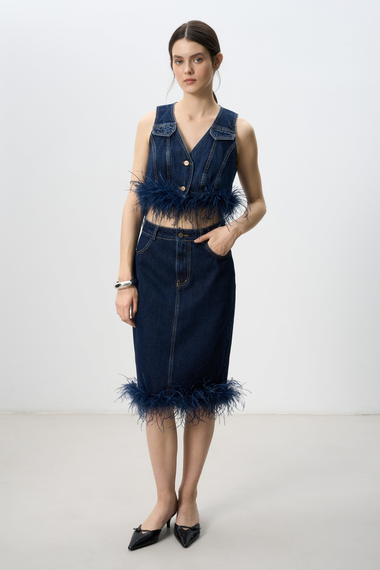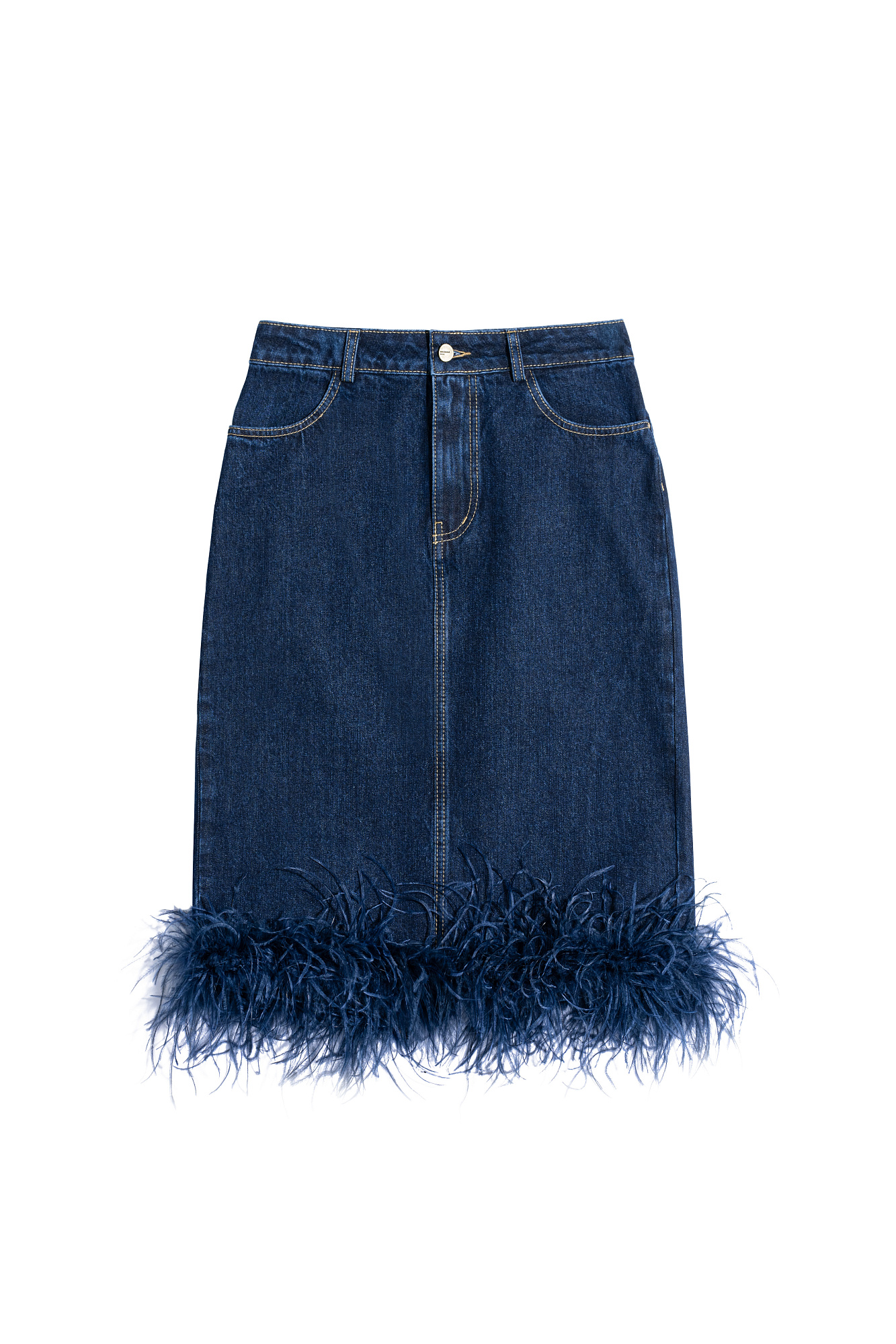 Джинсовая юбка длины миди, декорированная лентой со страусиными перьями. Лента с перьями отстегивается. Застежка изделия на молнию и пуговицу. Два кармана, шлевки на поясе для ремня.
