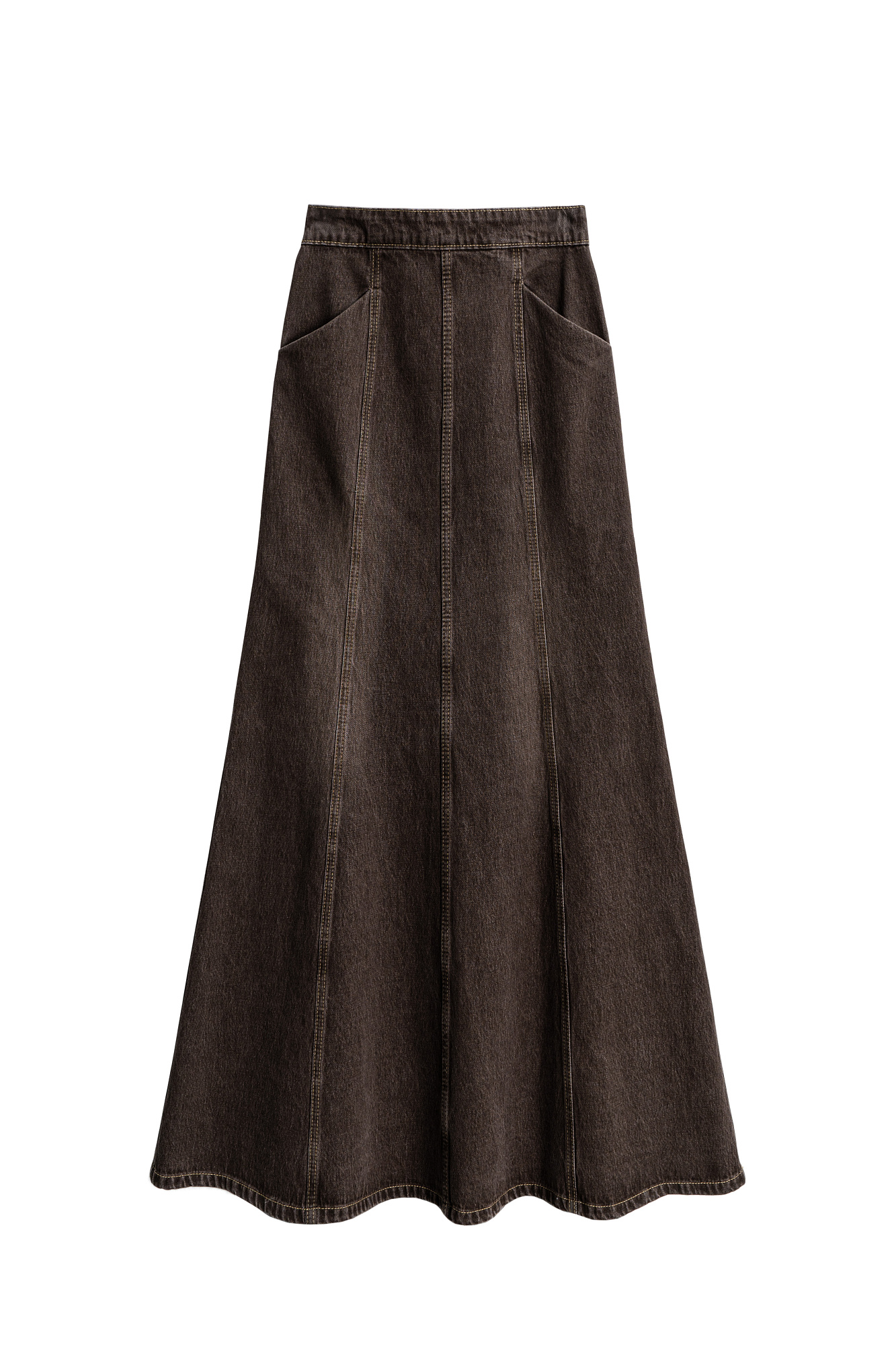 Джинсовая юбка из 100% хлопка длины миди. Модель А-силуэта с объемными вертикальными швами, двумя прорезными карманами спереди и двумя накладными карманми сзади. Застежка на молнию.