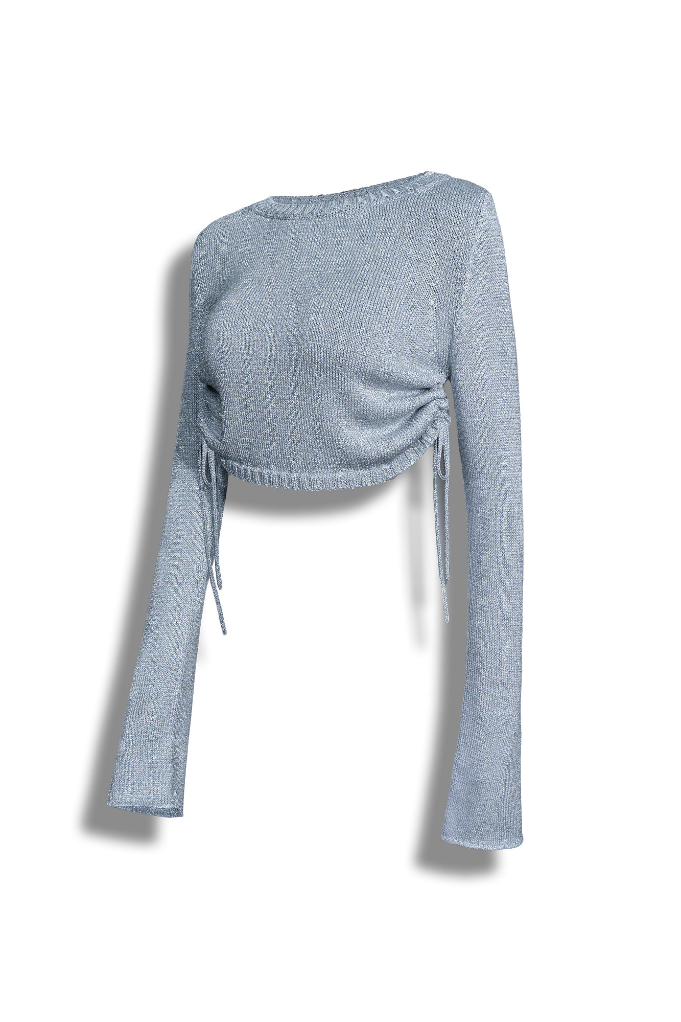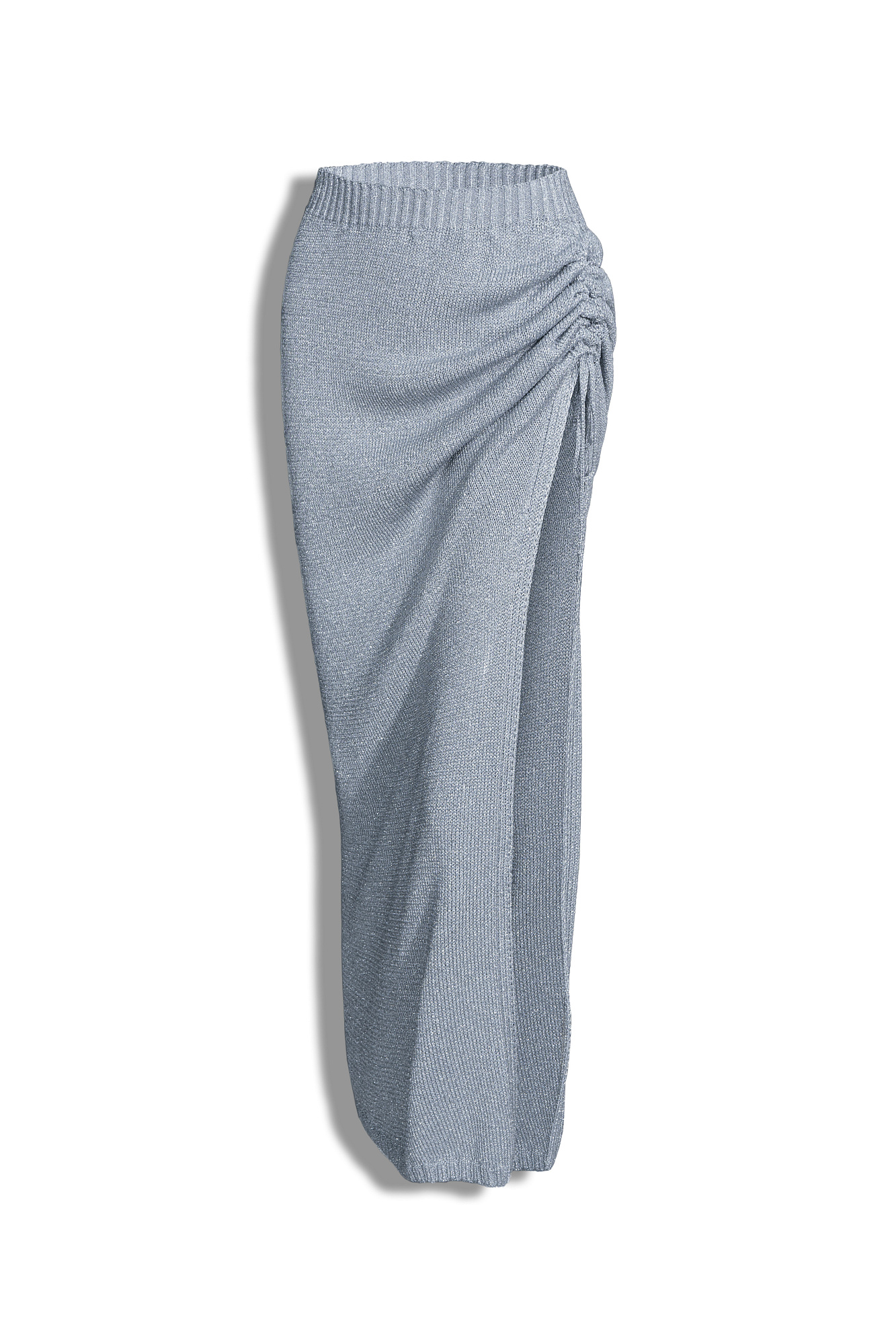 Комплект выполненый из материала с эффектом металлического блеска. Укороченный джемпер с люрексом, круглым вырезом и регулируемыми кулисками по бокам. Юбка длины макси с разрезом, эластичным поясом в рубчик и кулиской сбоку.