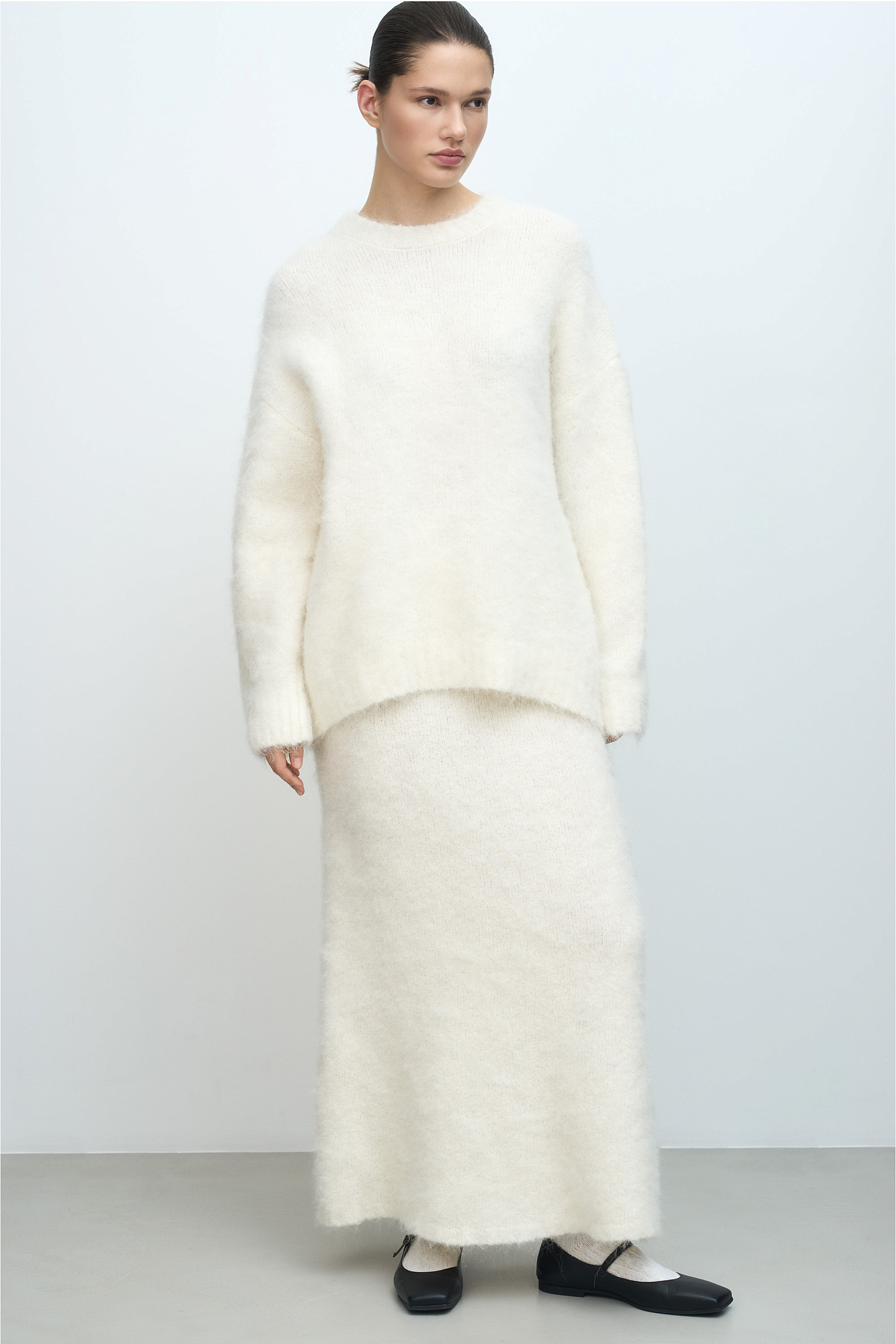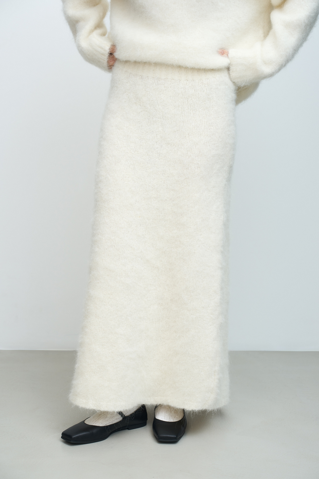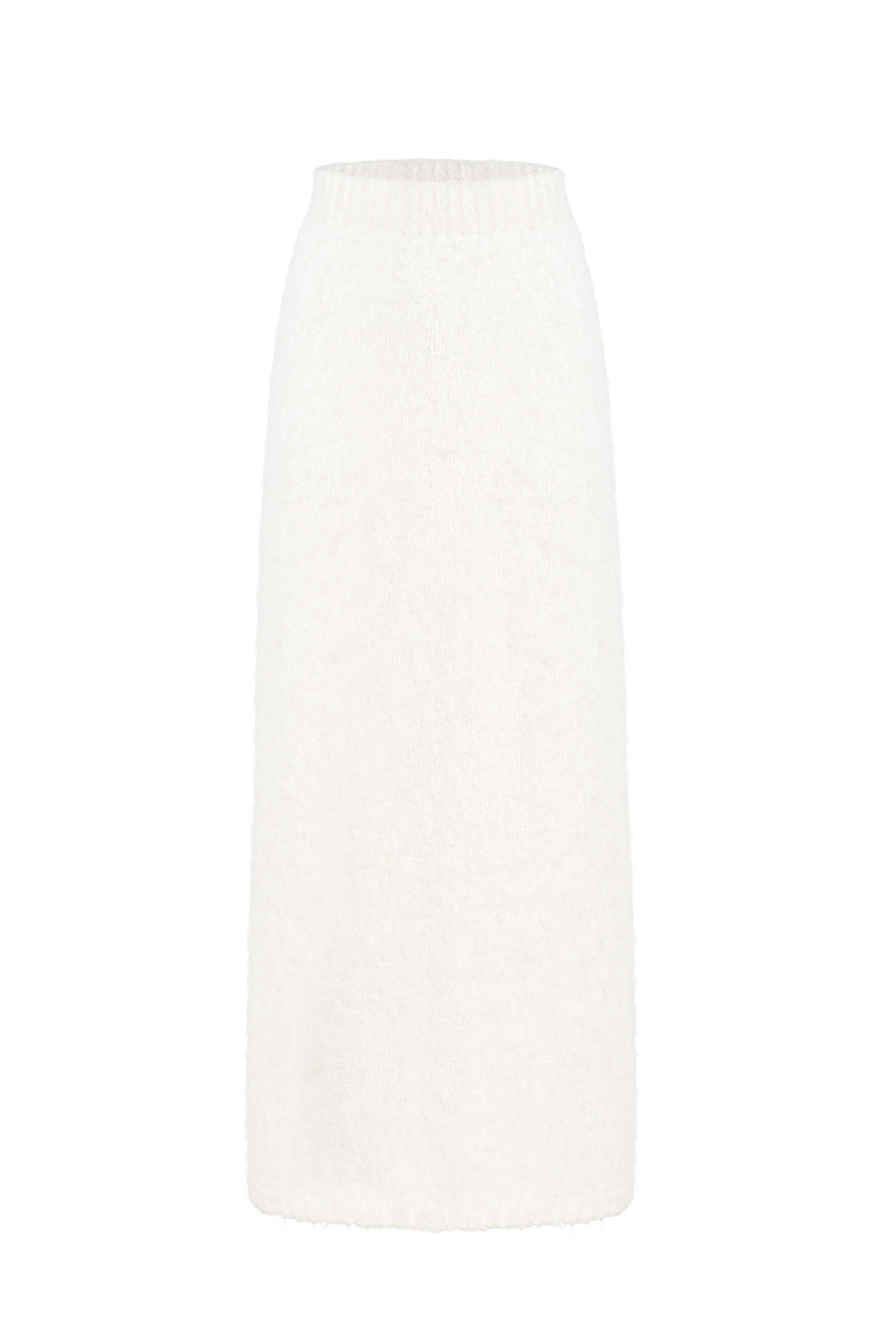 Трикотажная юбка из пушистой пряжи на основе шерсти альпака. Модель приталенного силуэта длины макси с эластичным поясом на резинке.