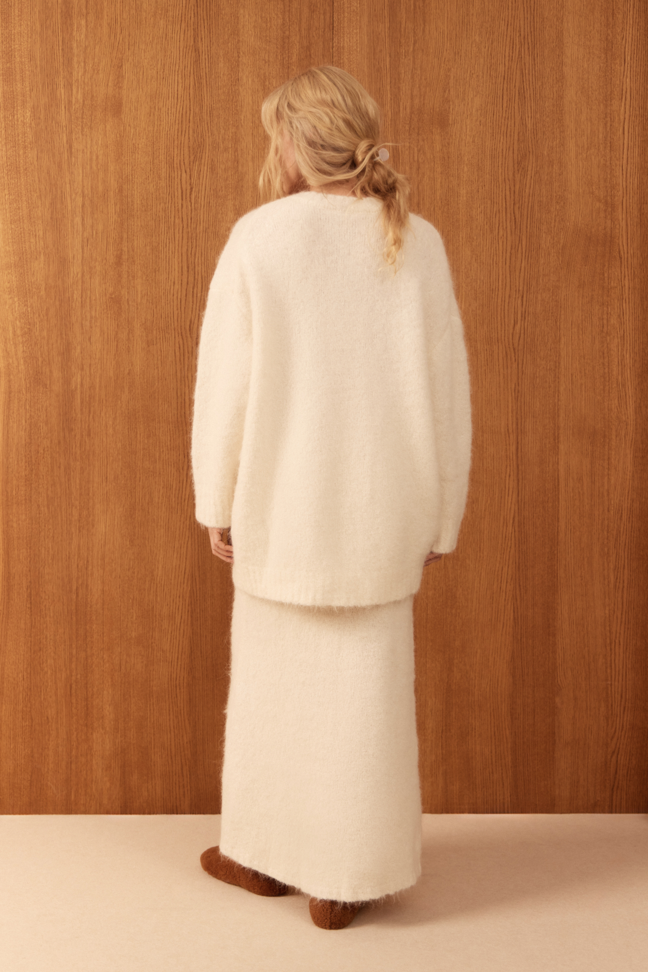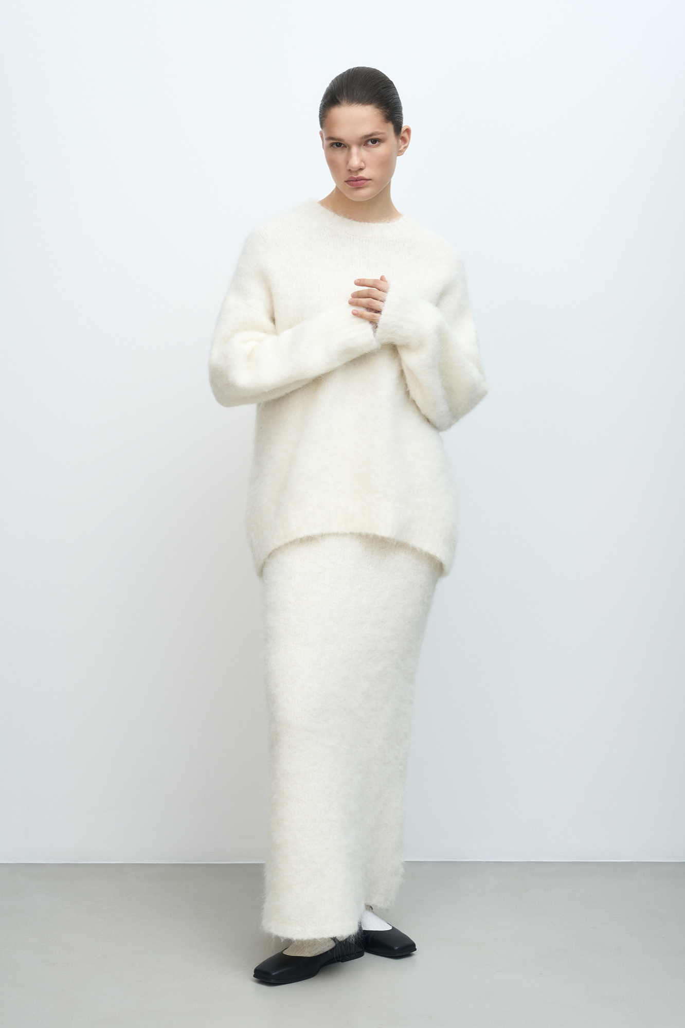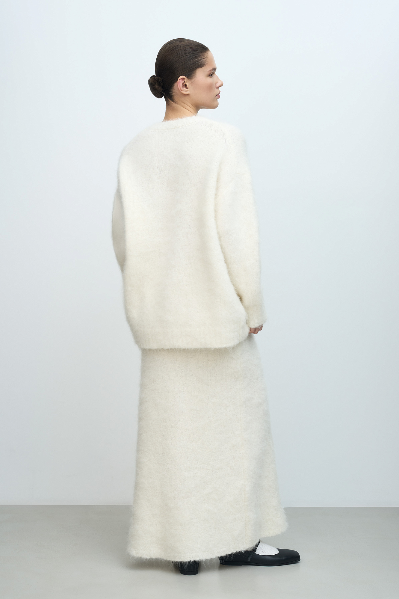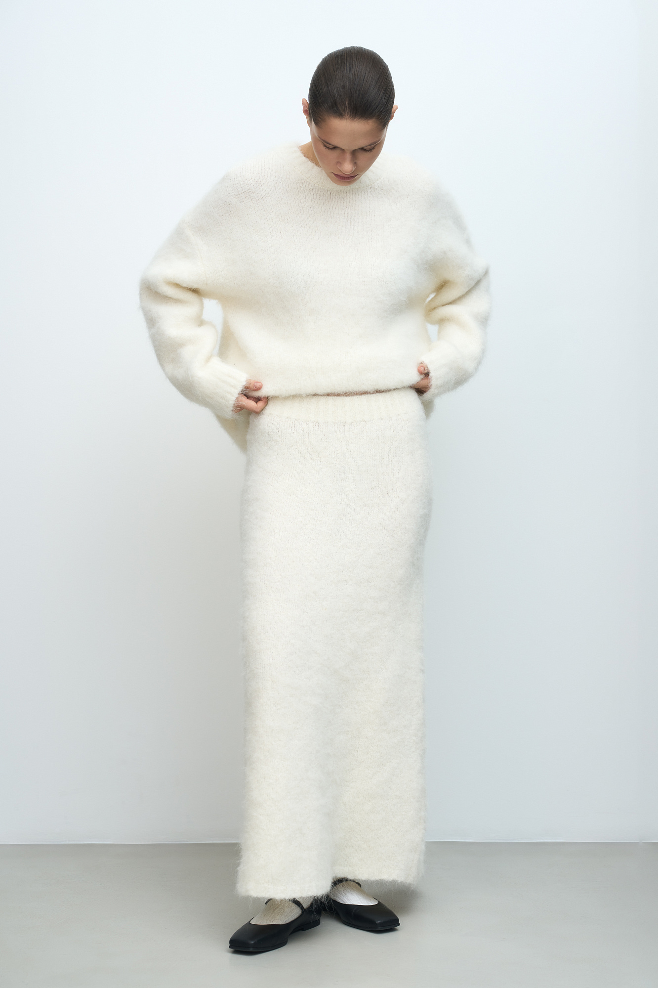 Трикотажная юбка из пушистой пряжи на основе шерсти альпака. Модель приталенного силуэта длины макси с эластичным поясом на резинке.