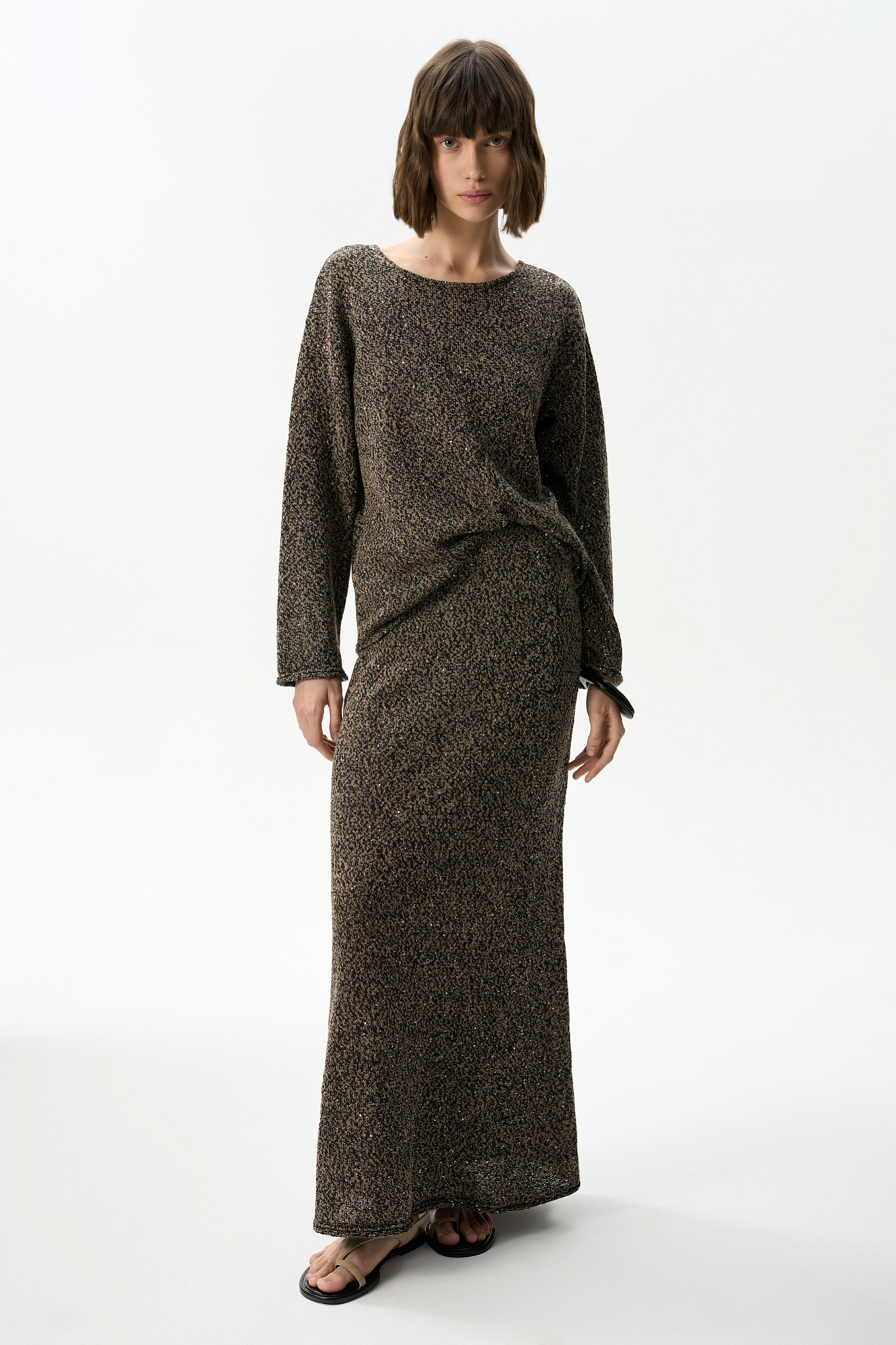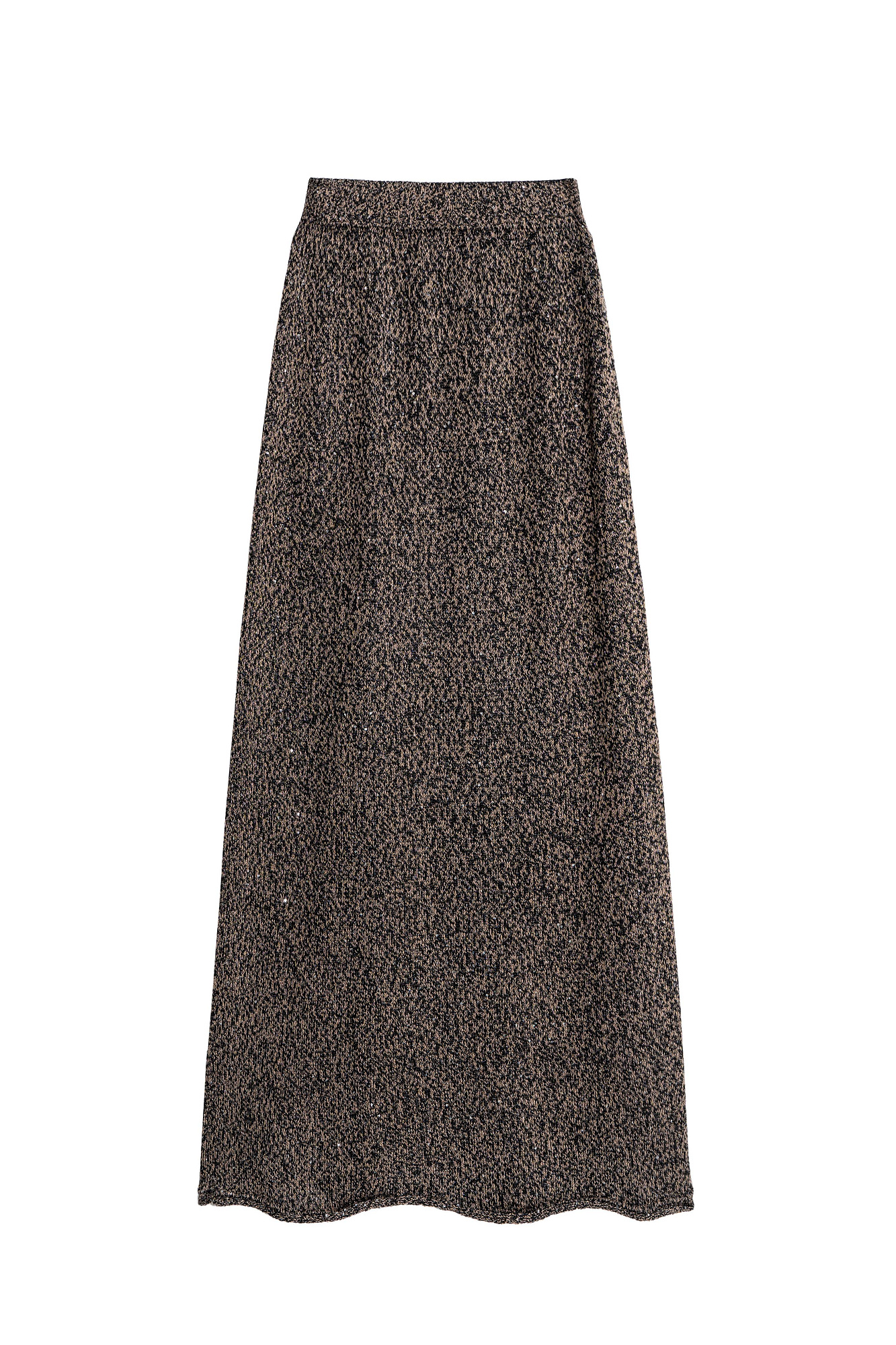 Трикотажная юбка длины макси из хлопка с добавлением вискозы. Модель А-силуэта, с широким эластичным поясом на резинке. Изделие декорировано маленькими пайетками.