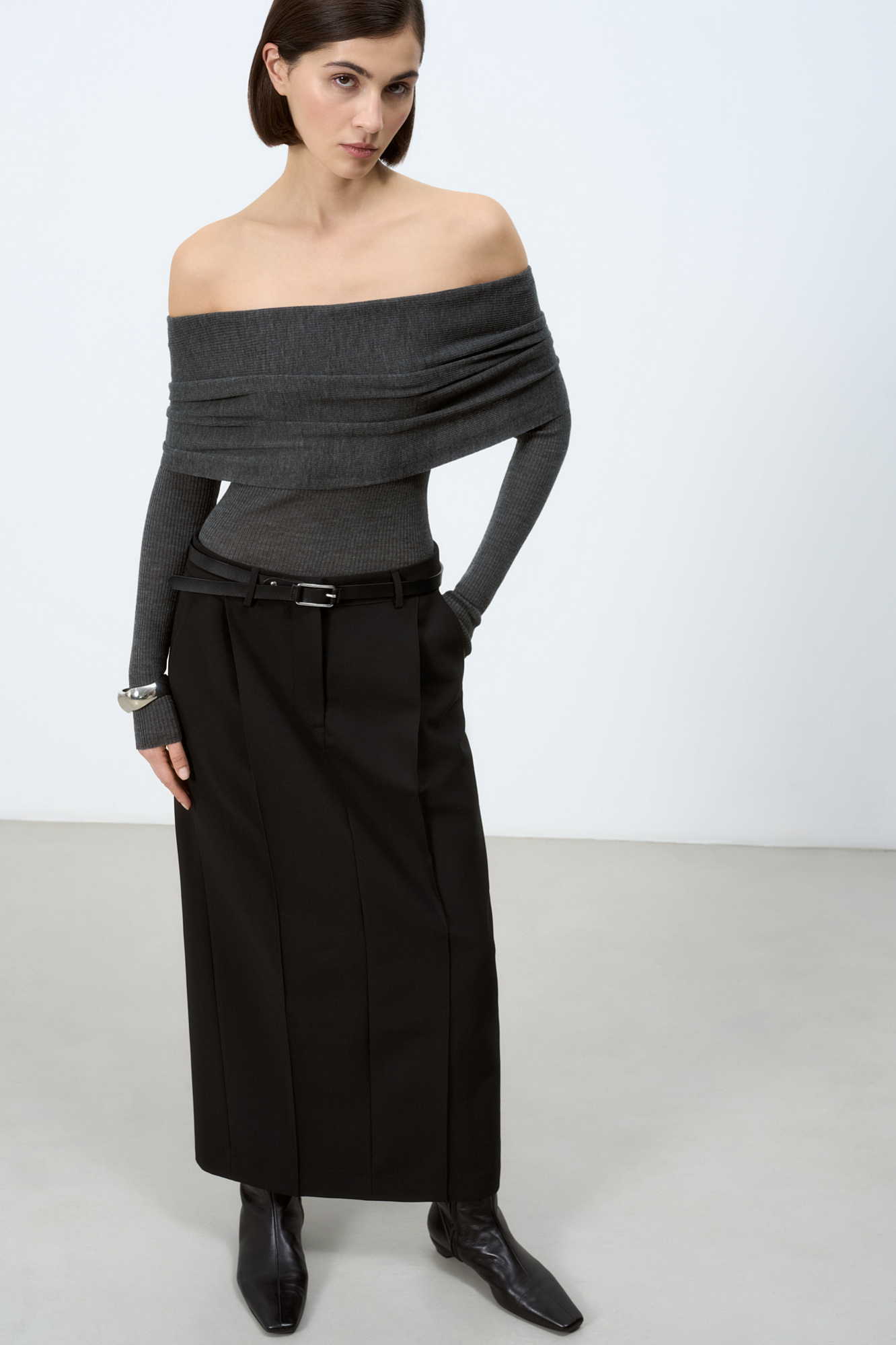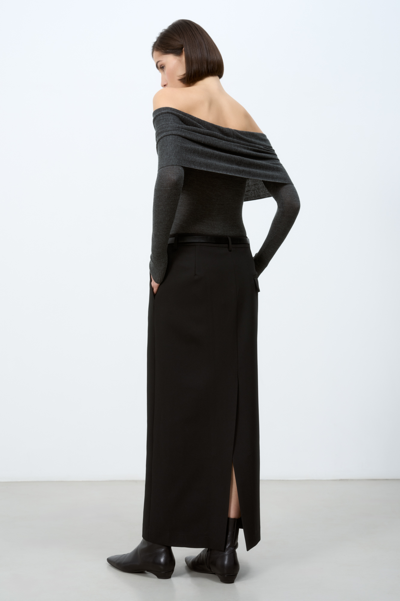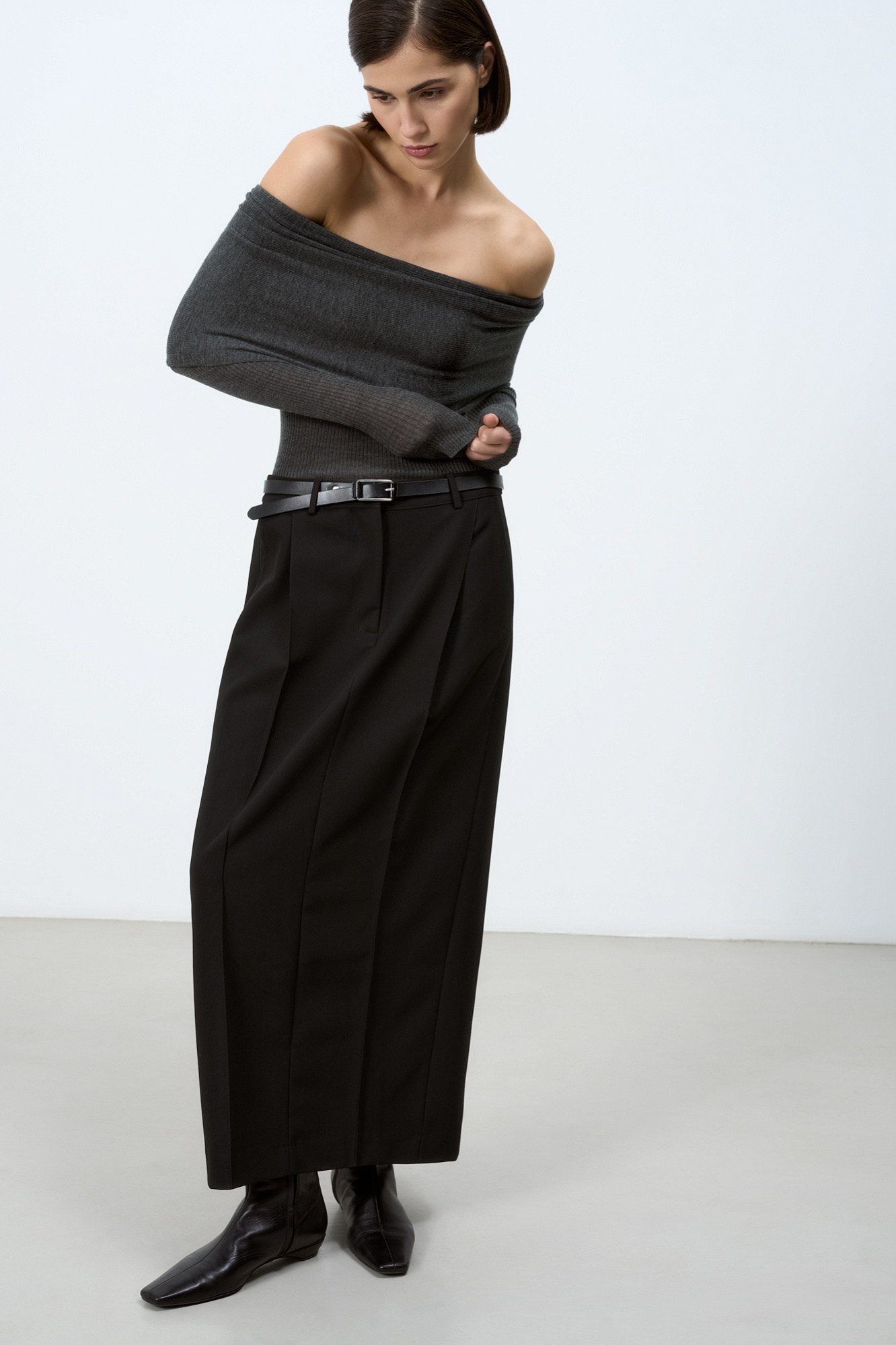 Длинная юбка из вискозы со стрелками и разрезом сзади. Брендированный ярлык на поясе сзади. Потайная застежка на молнии. Дополнить образ можно топом и жакетом.