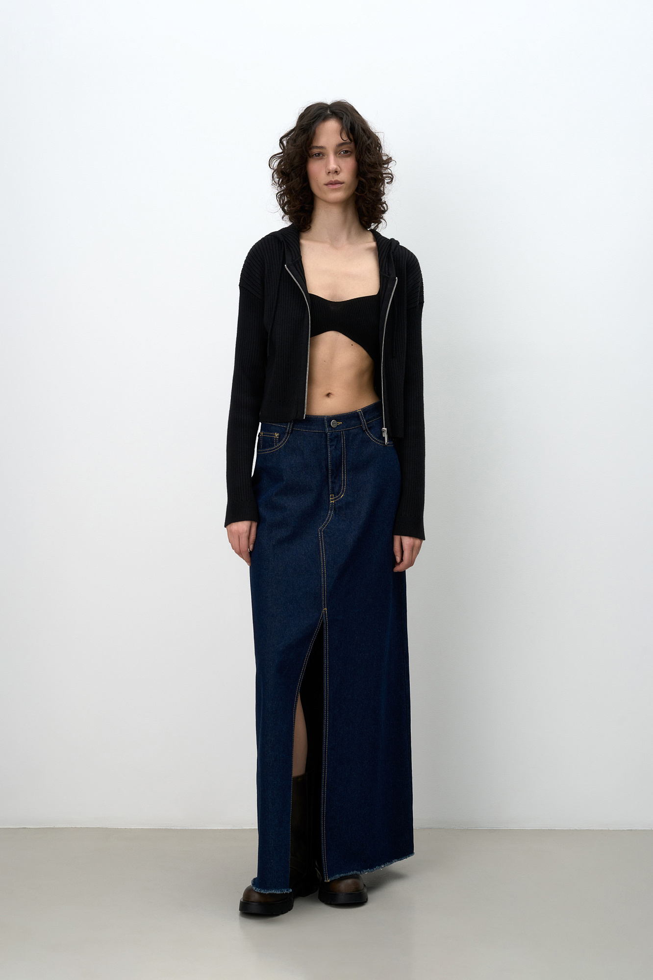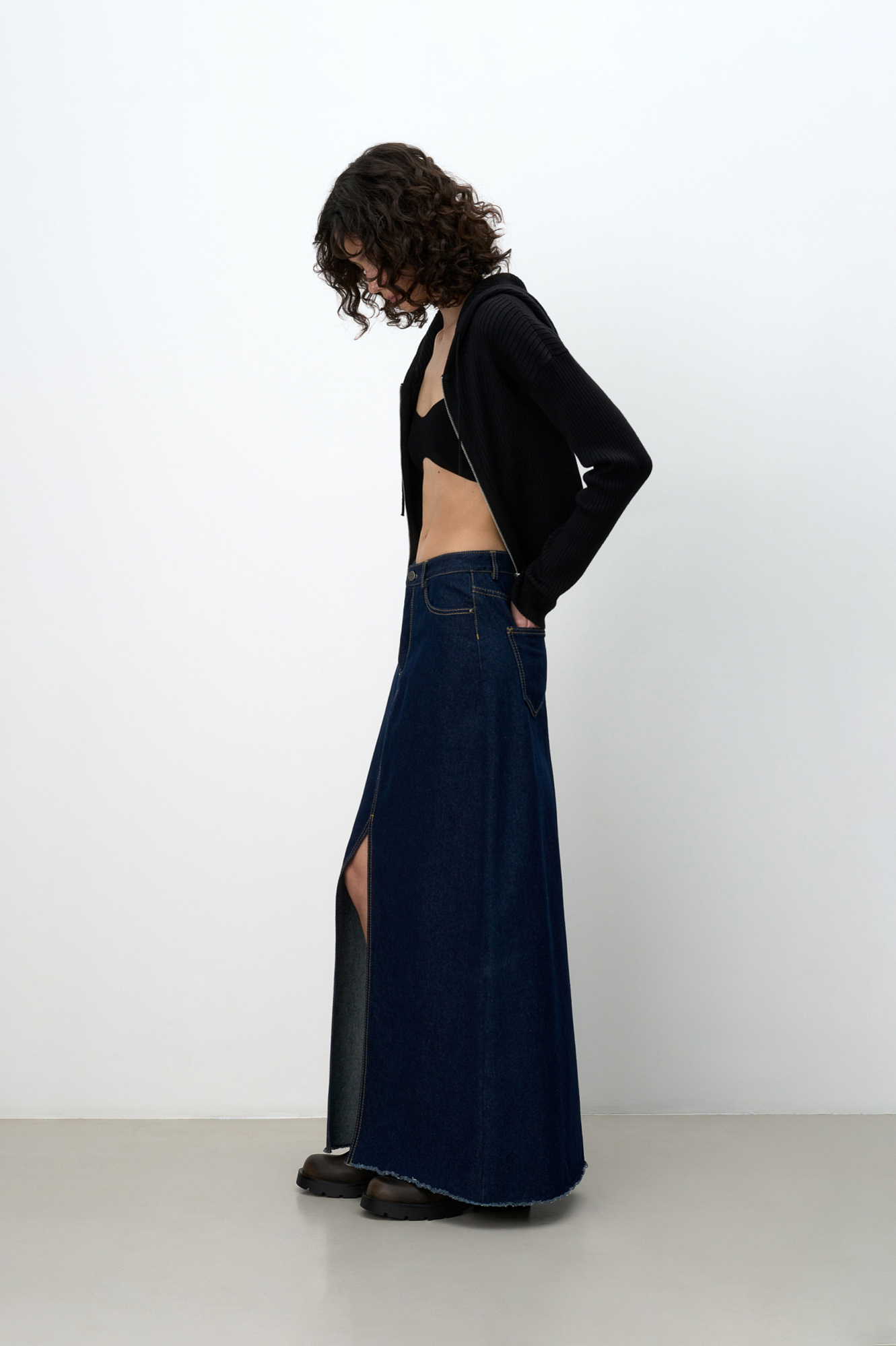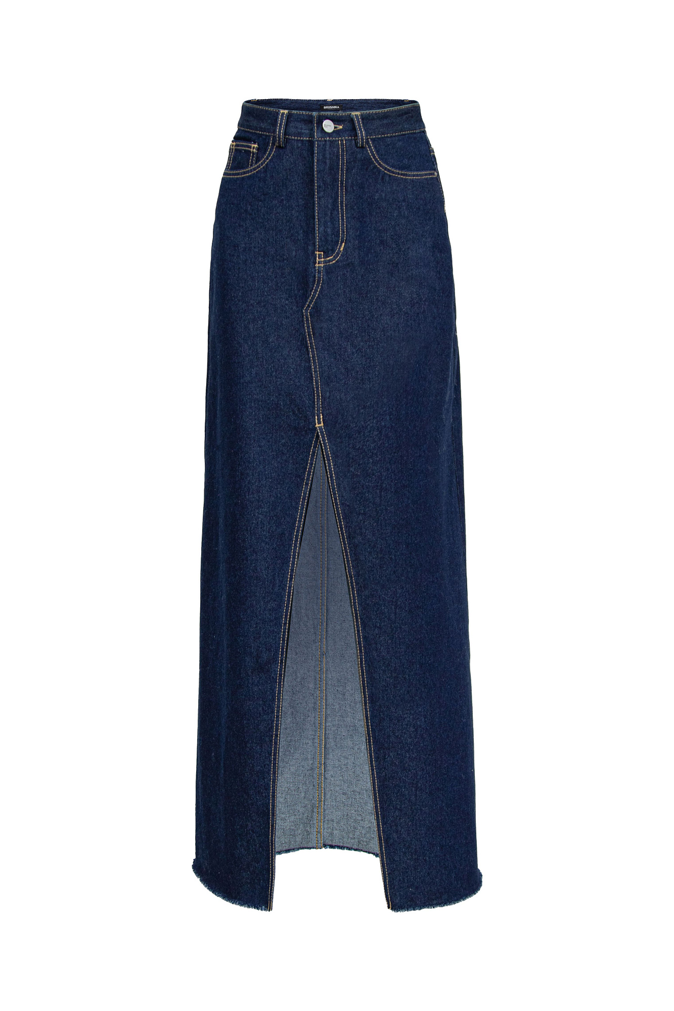 Джинсовая юбка макси из 100% хлопка с разрезом спереди и необработанным краем низа. Модель актуальна в стилизации образов демисезонно.