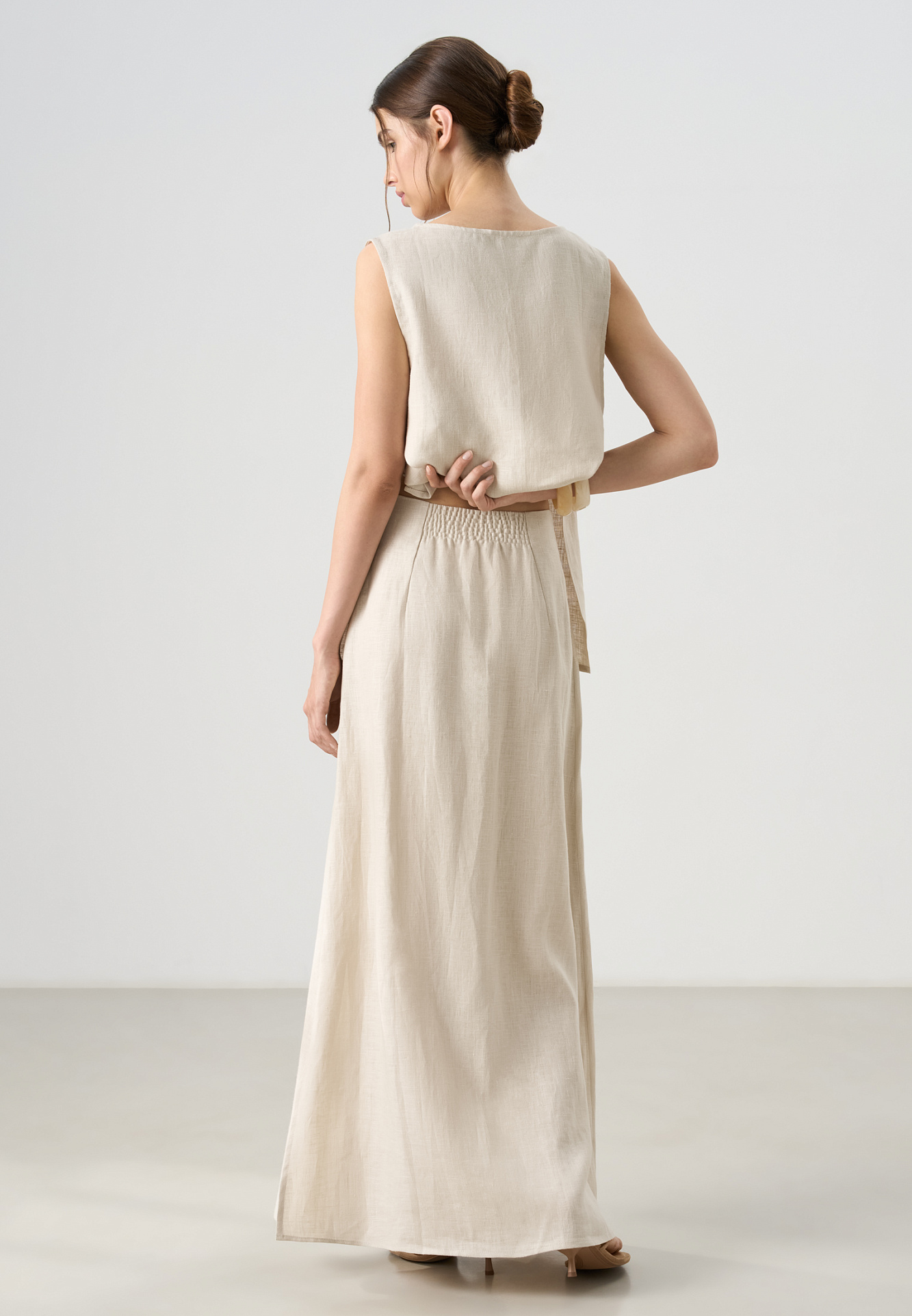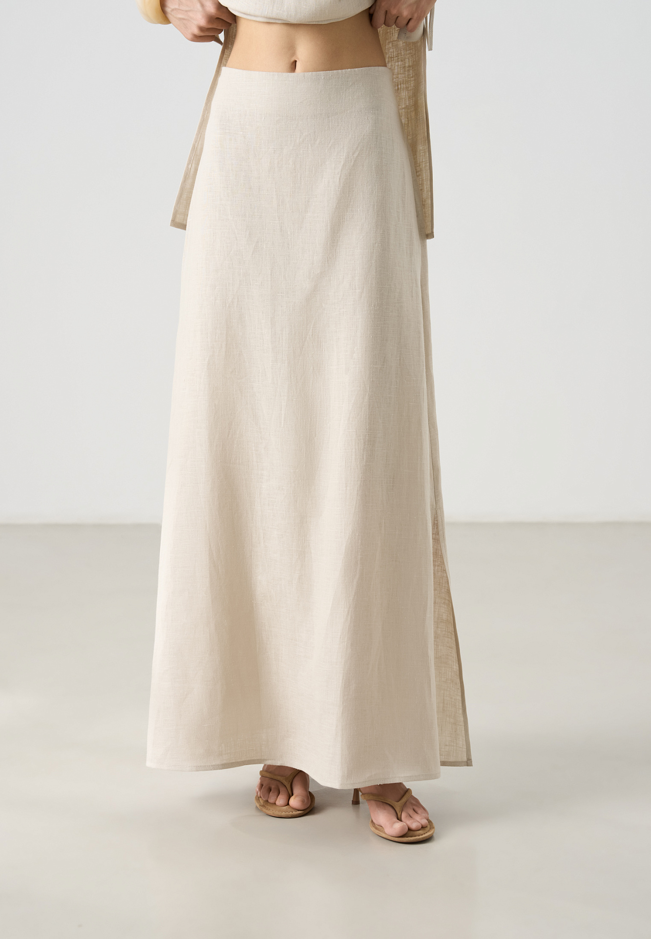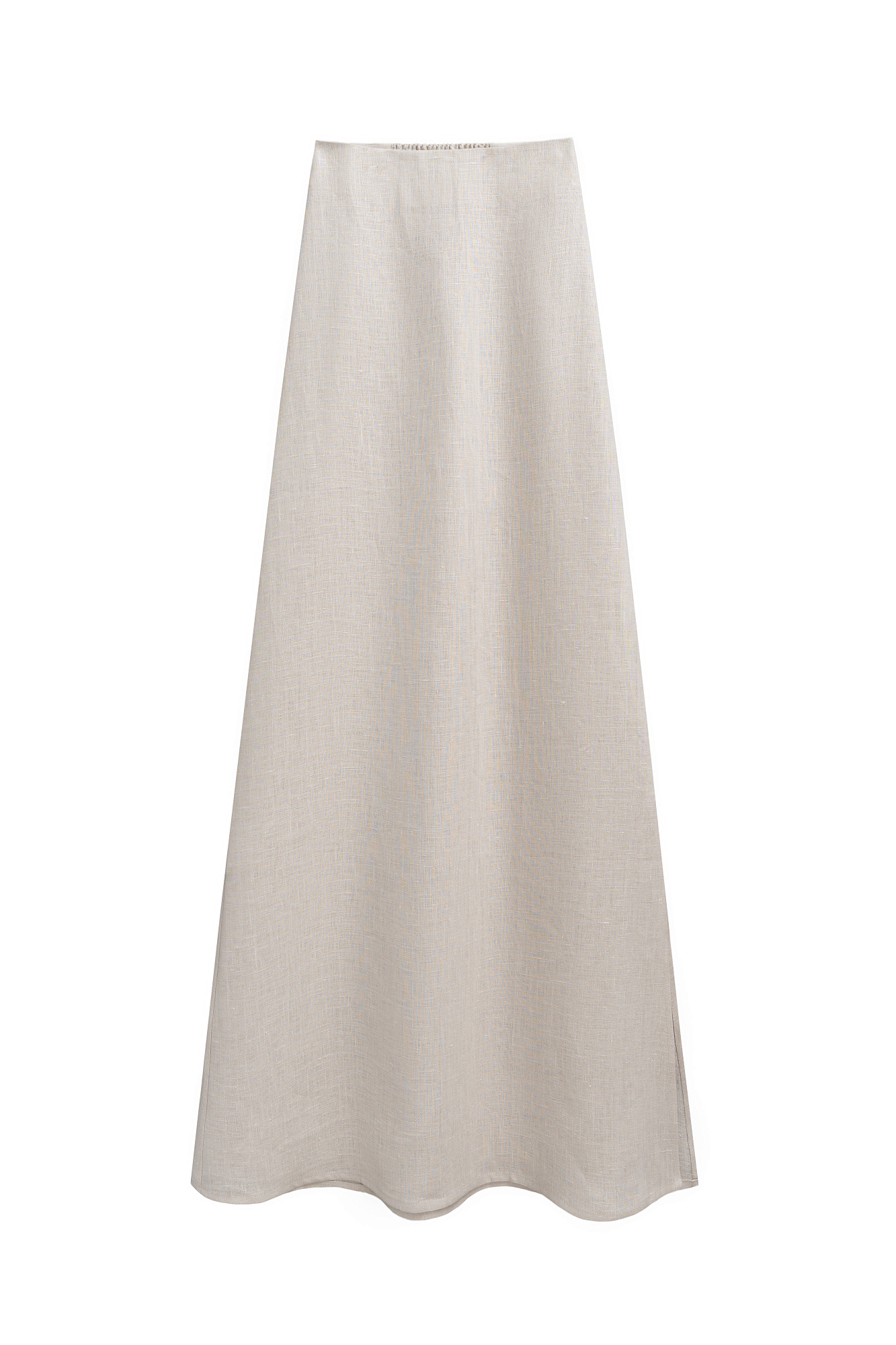 Юбка длины макси из 100% льна. Модель прямого кроя, с небольшим разрезом сбоку, эластичным поясом на резинке и застежкой на молнию.