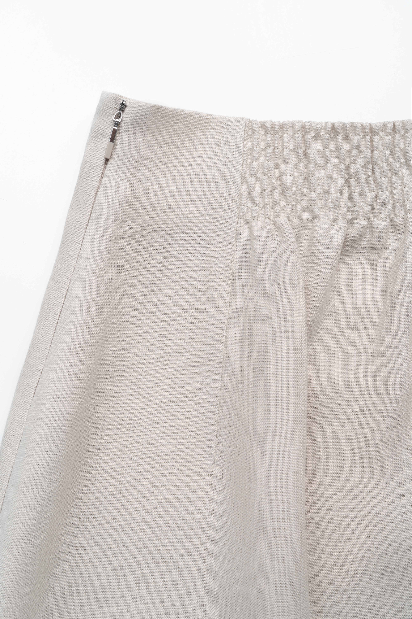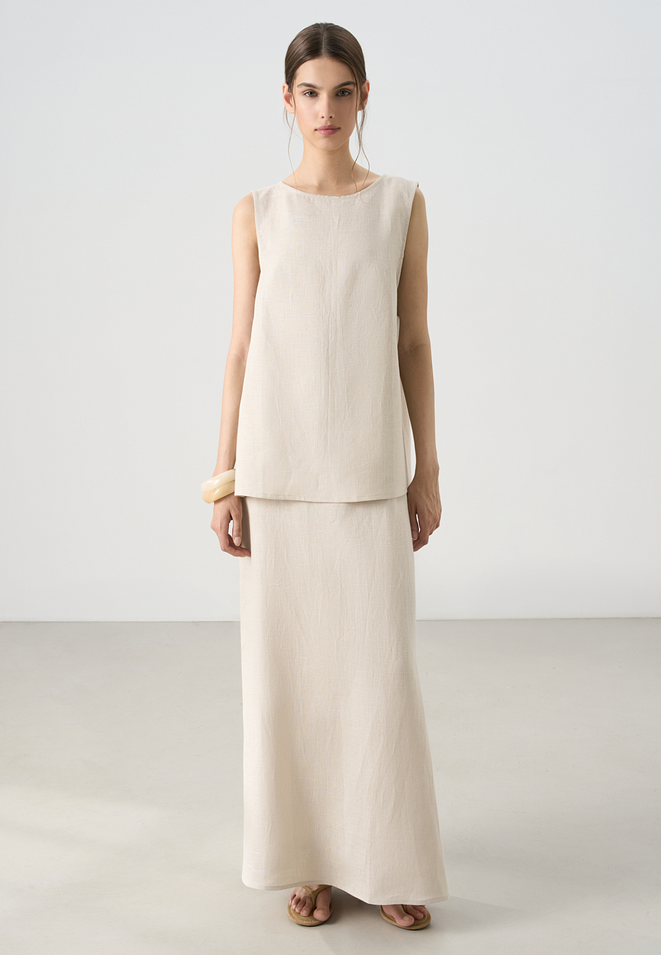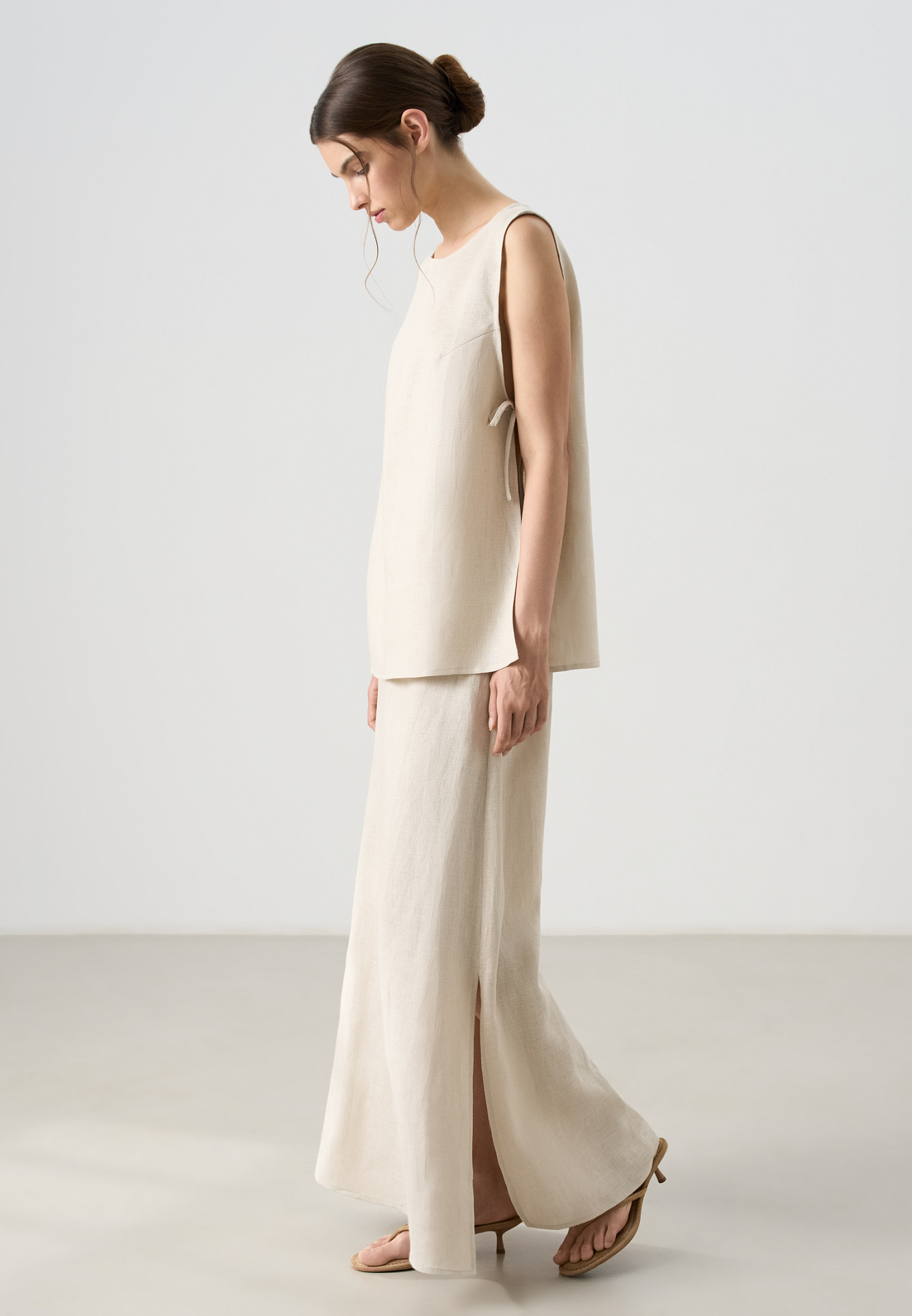 Юбка длины макси из 100% льна. Модель прямого кроя, с небольшим разрезом сбоку, эластичным поясом на резинке и застежкой на молнию.