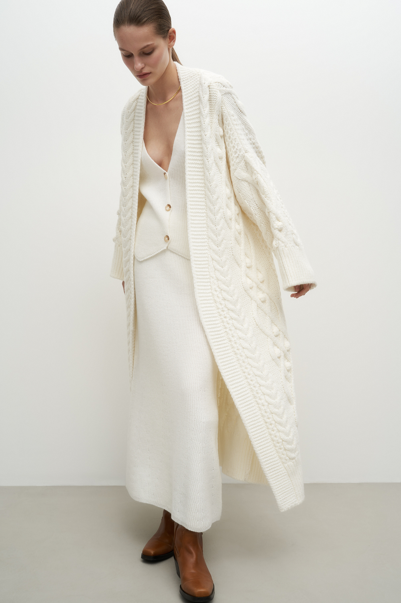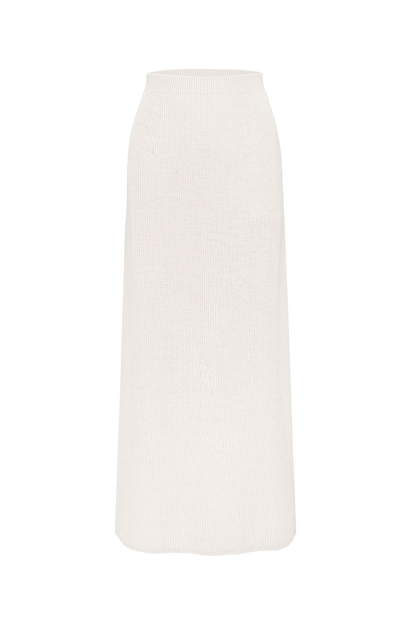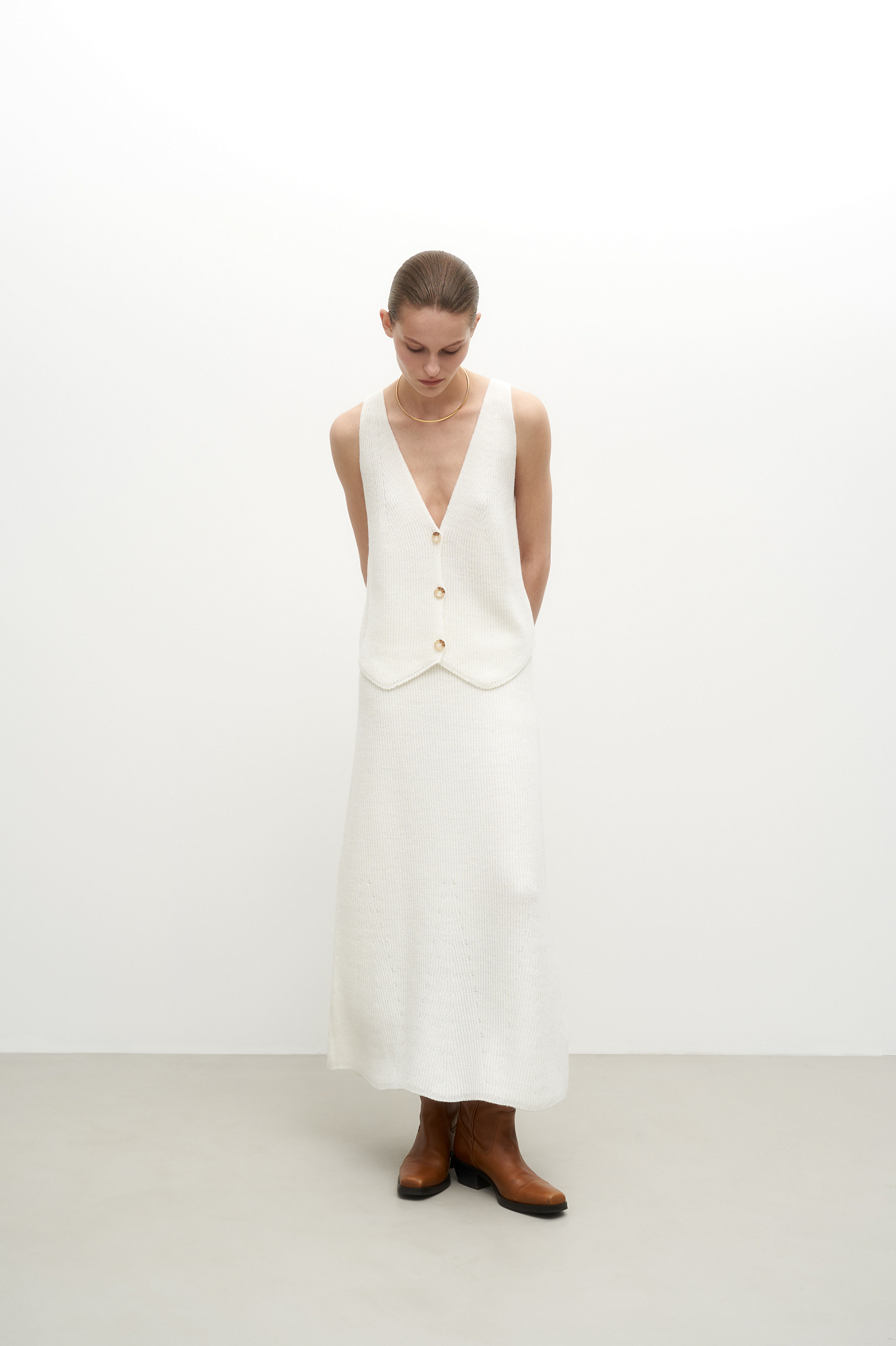 Трикотажная юбка длины макси из шерсти. Модель свободного силуэта с эластичным поясом в рубчик. Дополнить образ можно жилетом в таком же стиле.