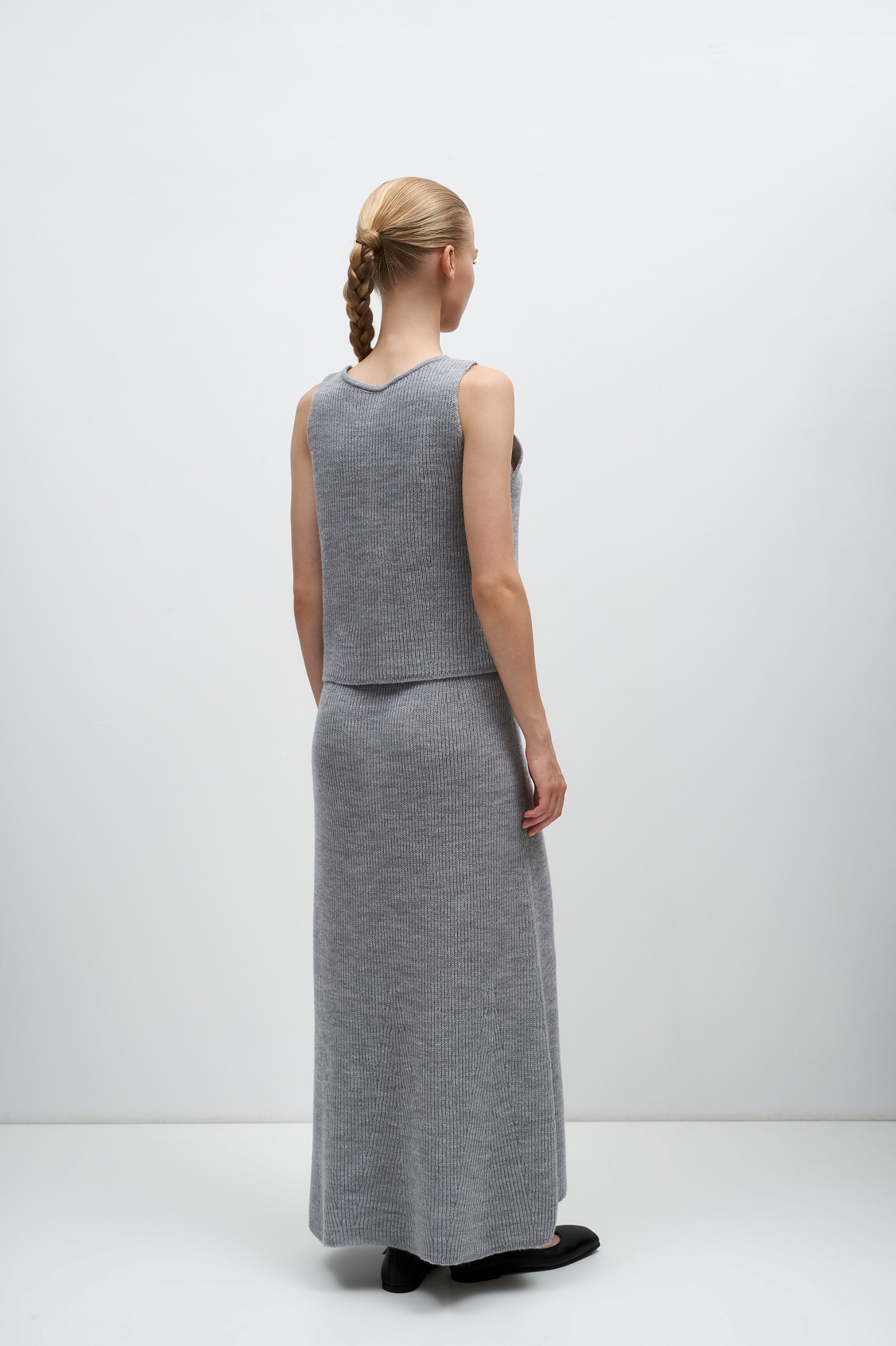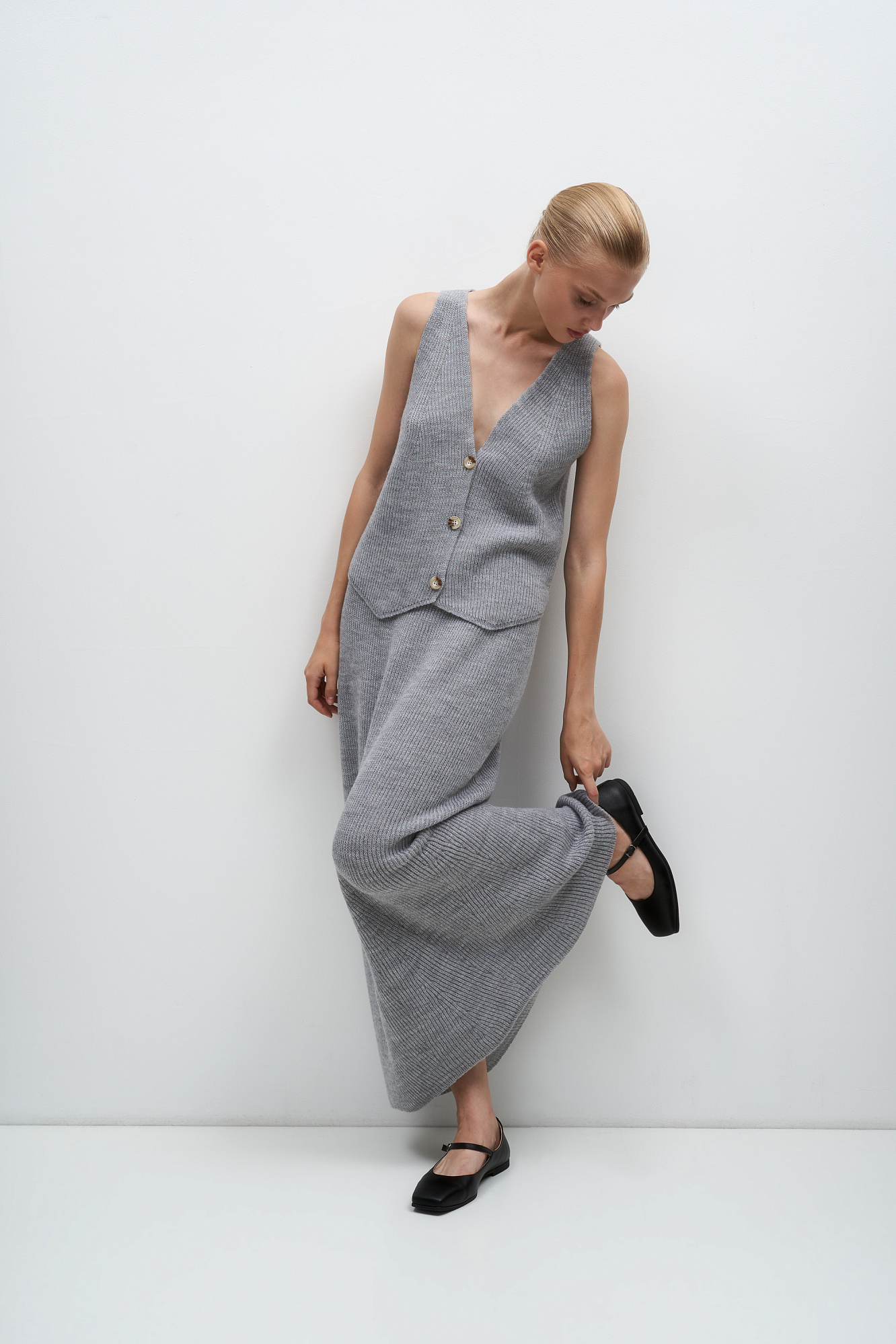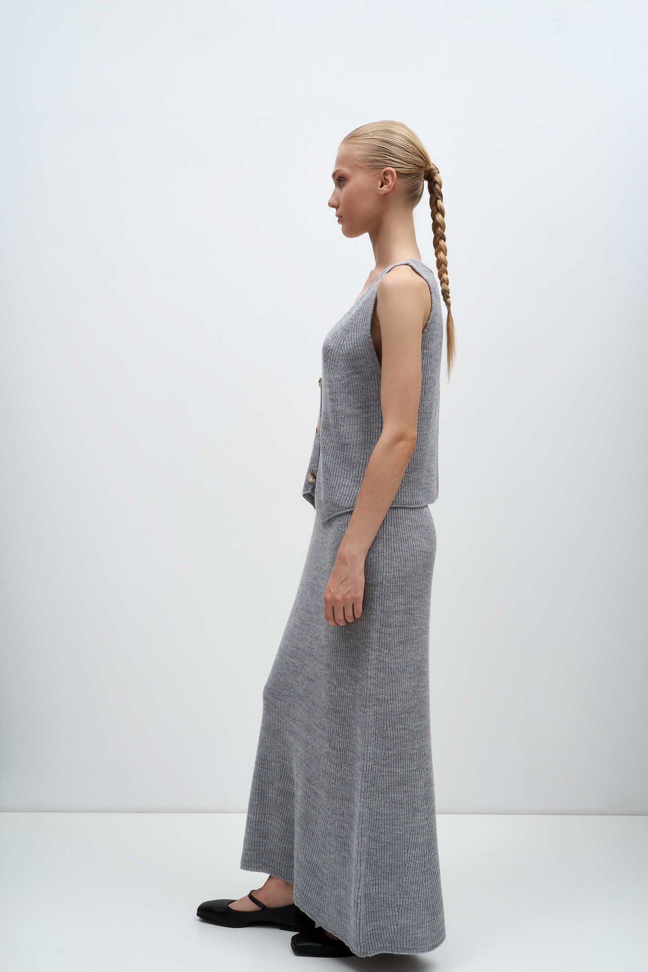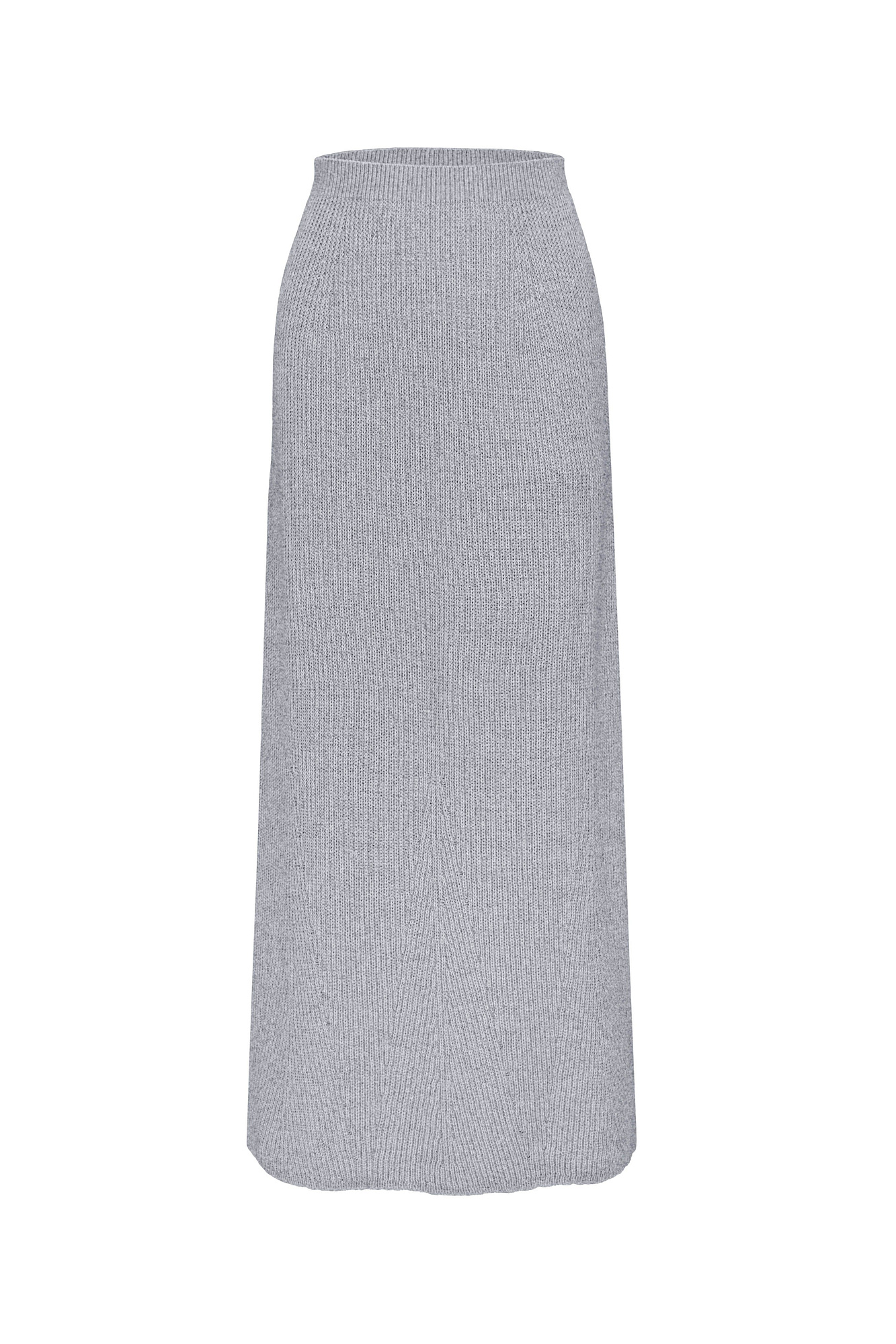 Трикотажная юбка длины макси из шерсти. Модель свободного силуэта с эластичным поясом в рубчик. Дополнить образ можно жилетом в таком же стиле.