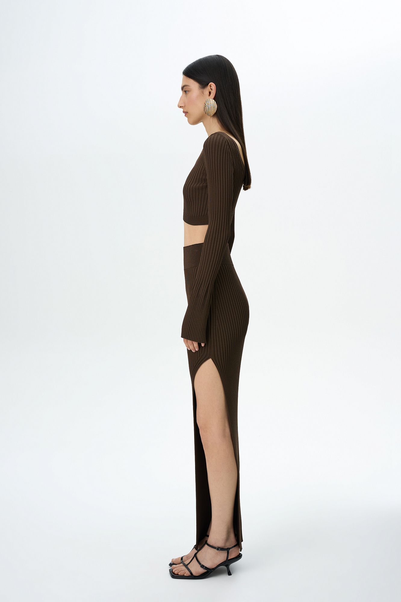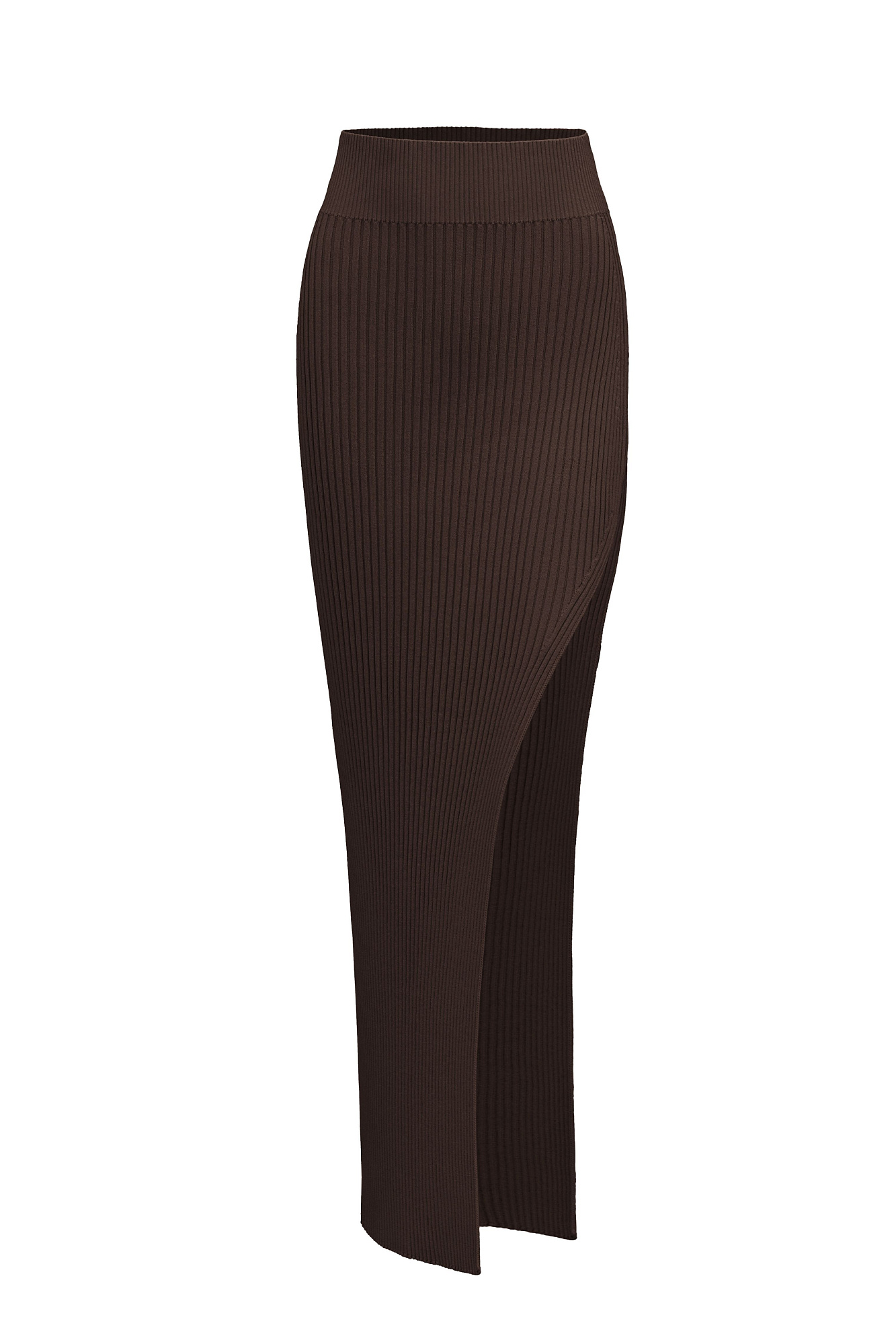 Трикотажная юбка длины макси с разрезом. Облегающий силуэт из вискозы с эластичным поясом в рубчик. Дополнить образ можно топом с открытой спиной из этой же коллекции.