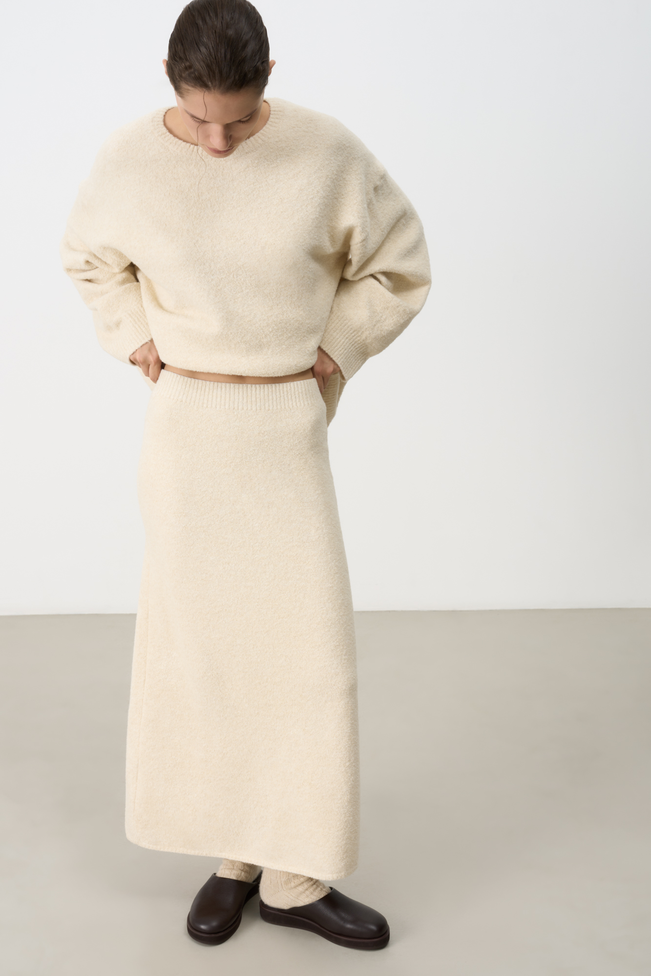 Трикотажная юбка длины макси с небольшим расклешением к низу, изготовленная из смесовой шерсти. Пояс изделия выполнен в виде эластичной резинки в рубчик. Дополнить образ можно джемпером в таком же стиле.