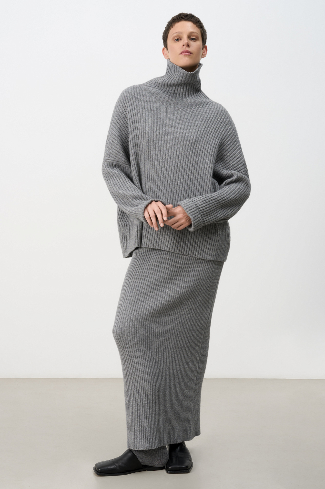 Трикотажная юбка длины макси из кашемира и шерсти. Модель приталенного силуэта, с разрезом сзади и эластичным поясом. Изделие выполнено в рубчик.