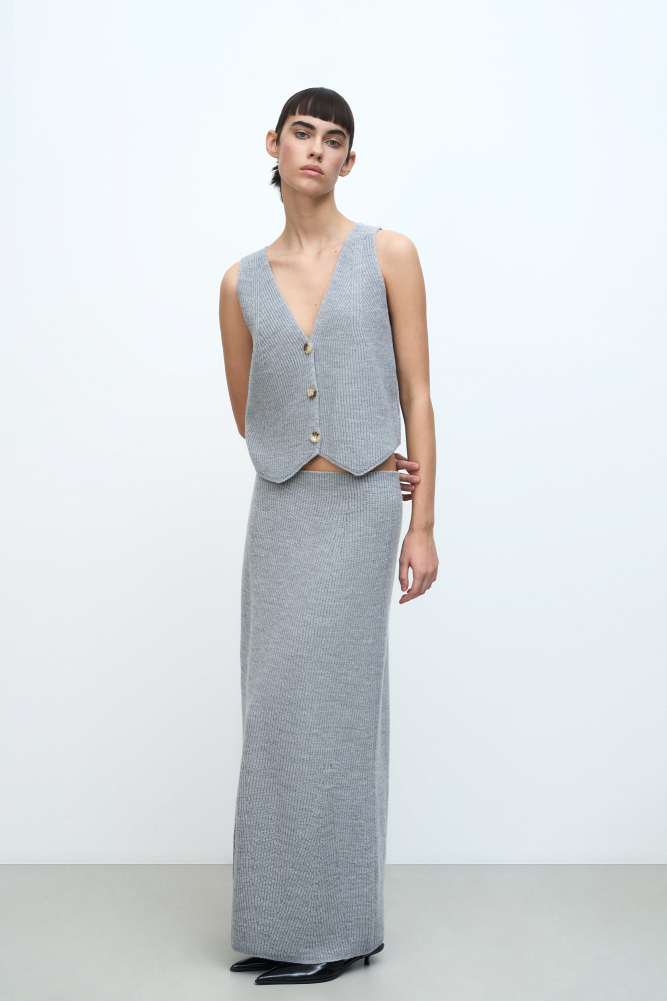 Трикотажная юбка длины макси из смесовой шерсти. Модель свободного силуэта с эластичным поясом в рубчик. Дополнить образ можно жилетом в таком же стиле.