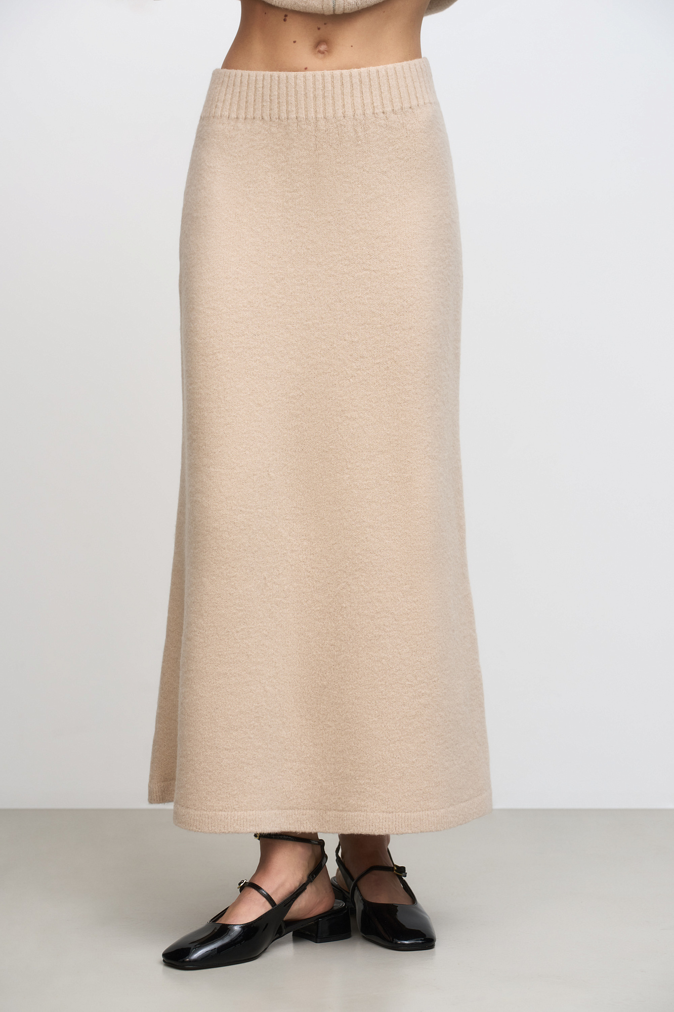 Трикотажная юбка длины макси из смесовой шерсти. Модель трапециевидной формы с эластичным поясом в рубчик.