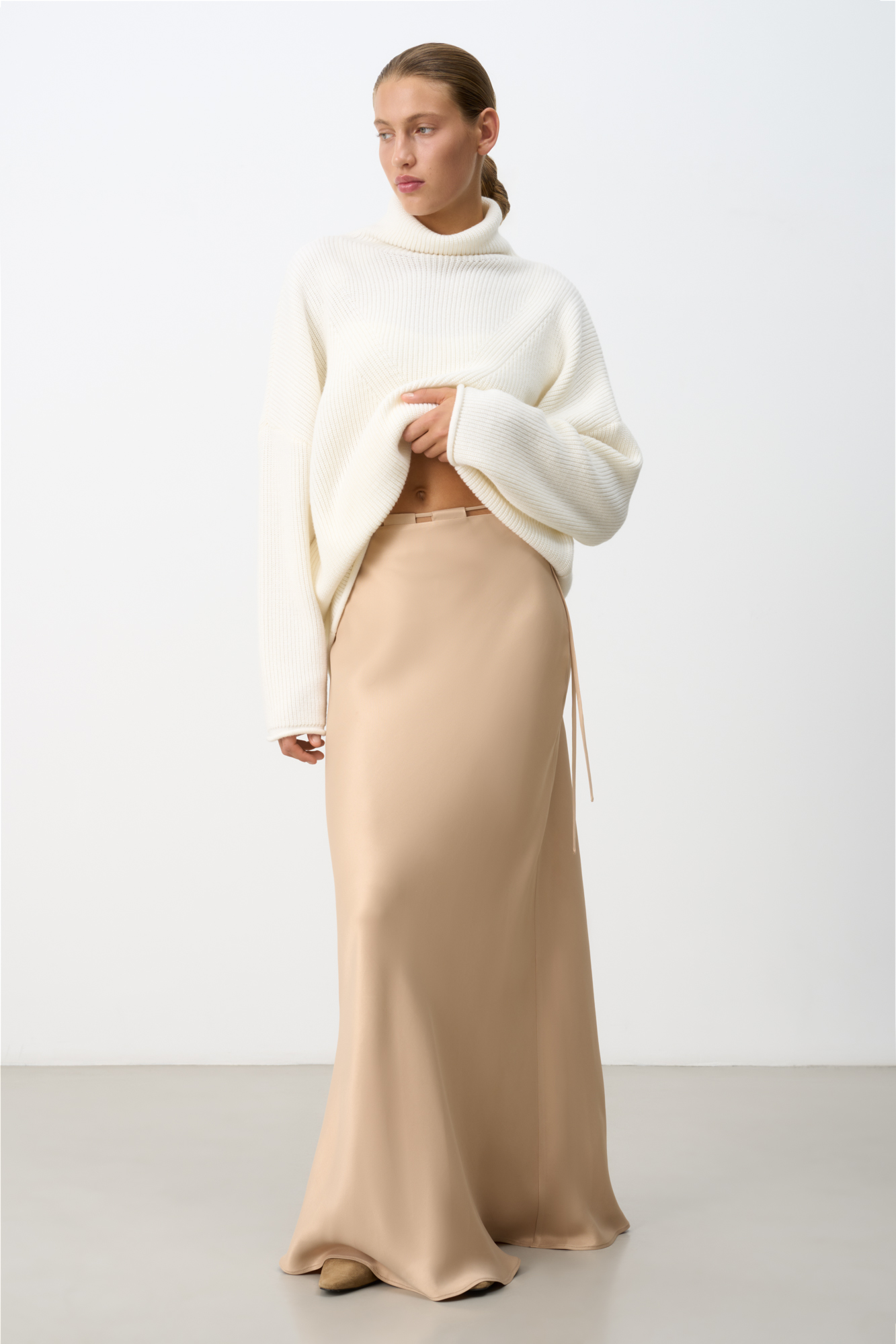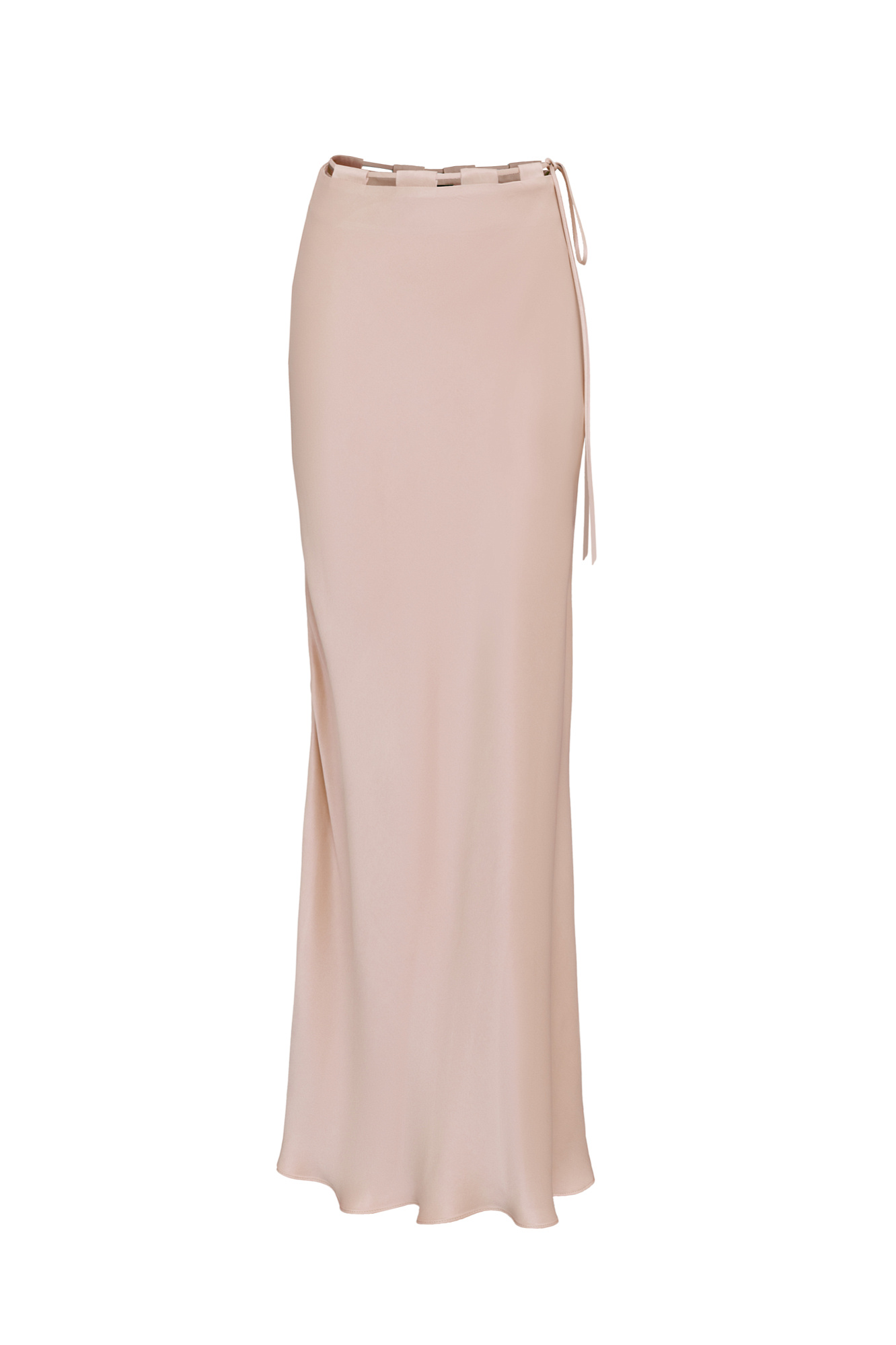 Атласная макси юбка. Модель приталенного силуэта с регулируемой кулиской на поясе.
