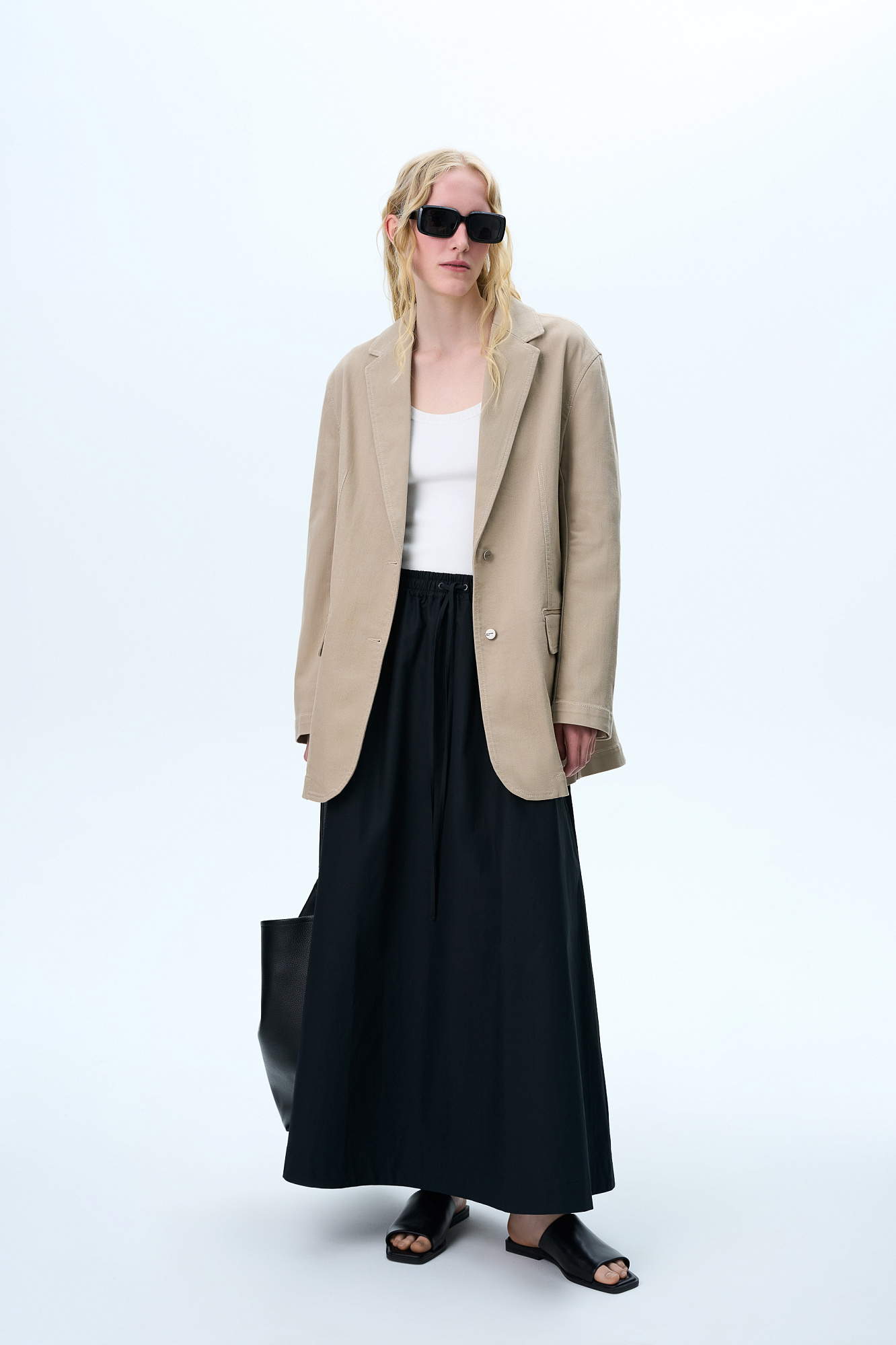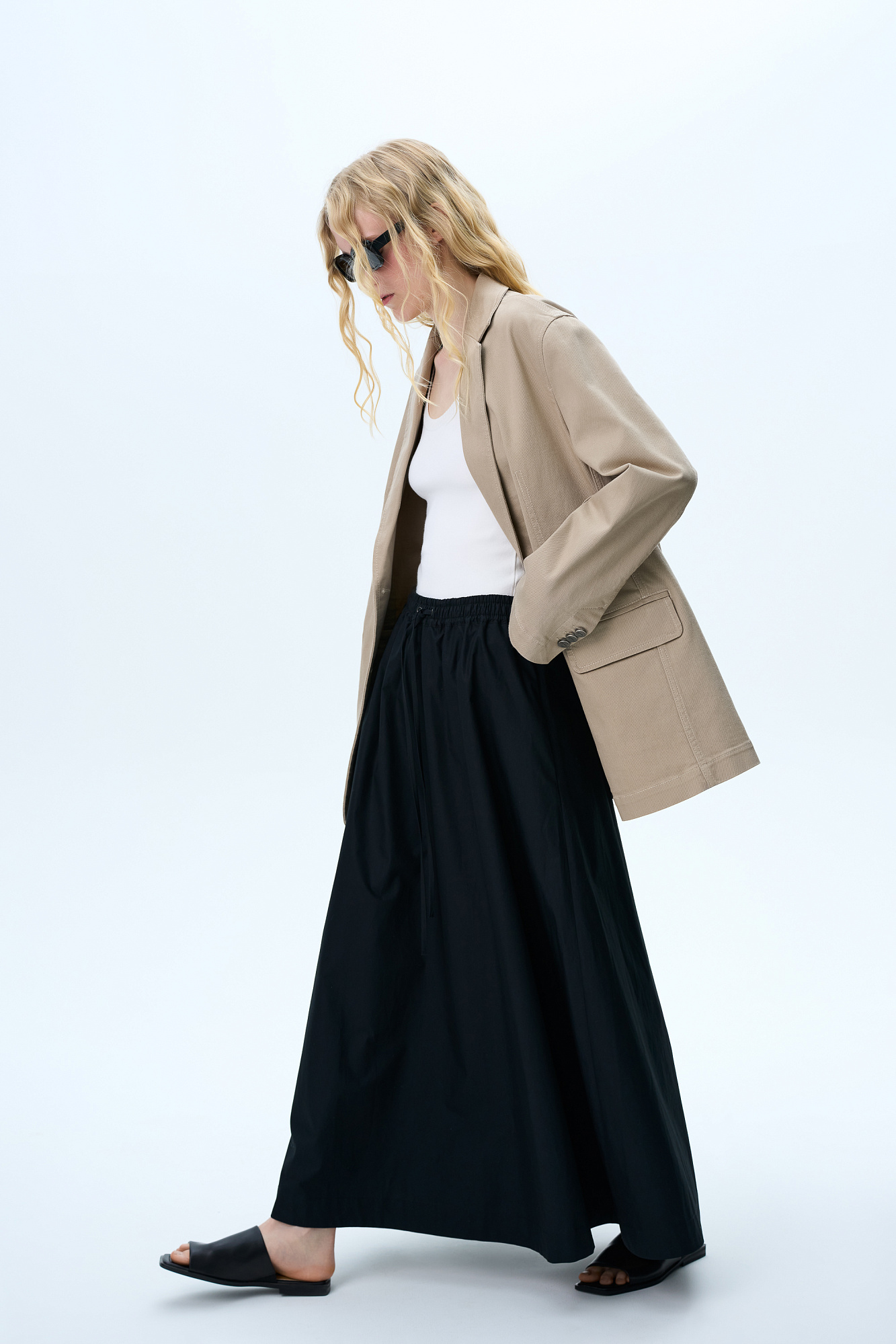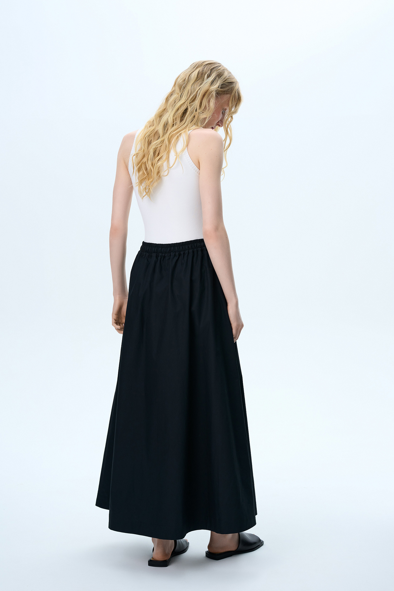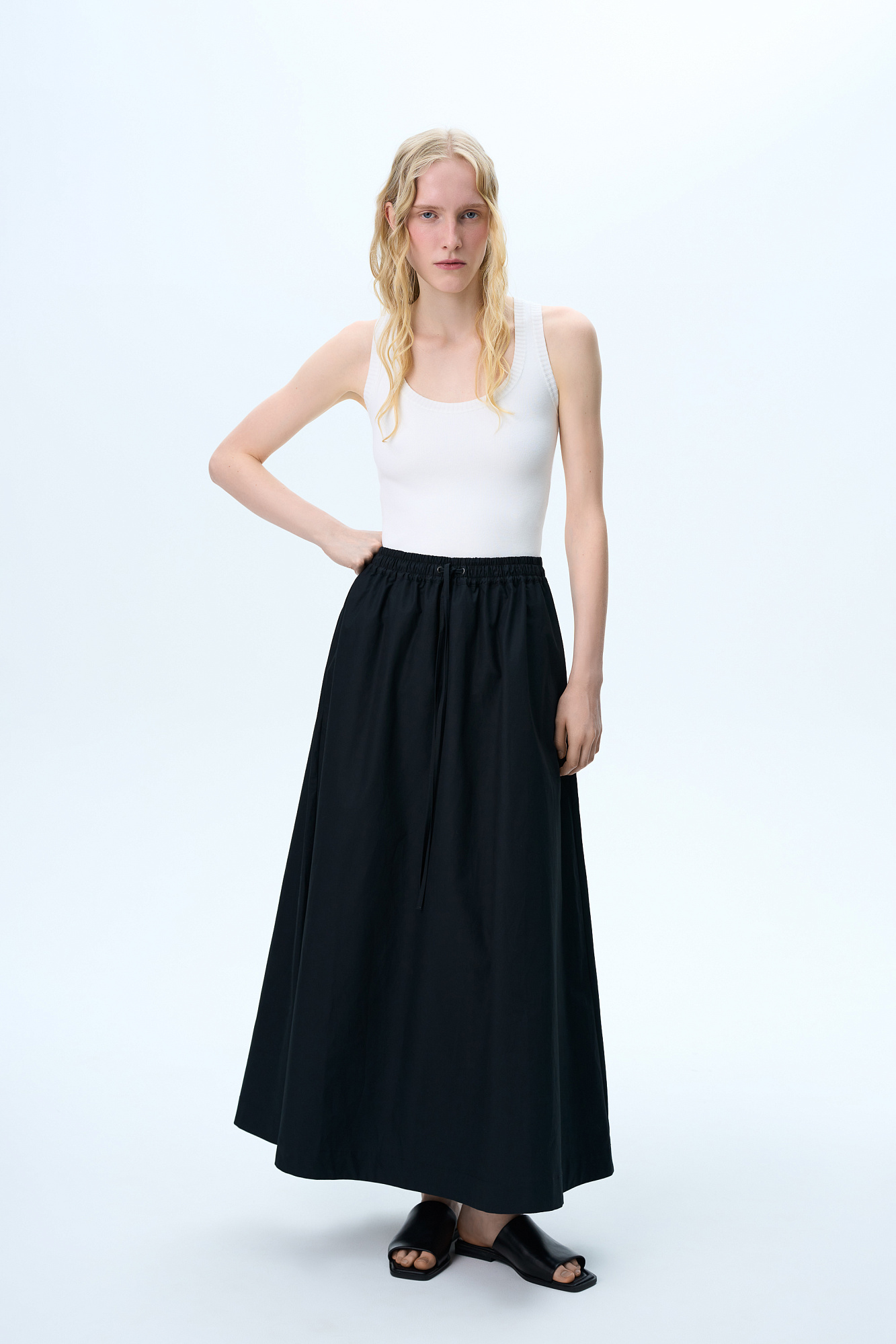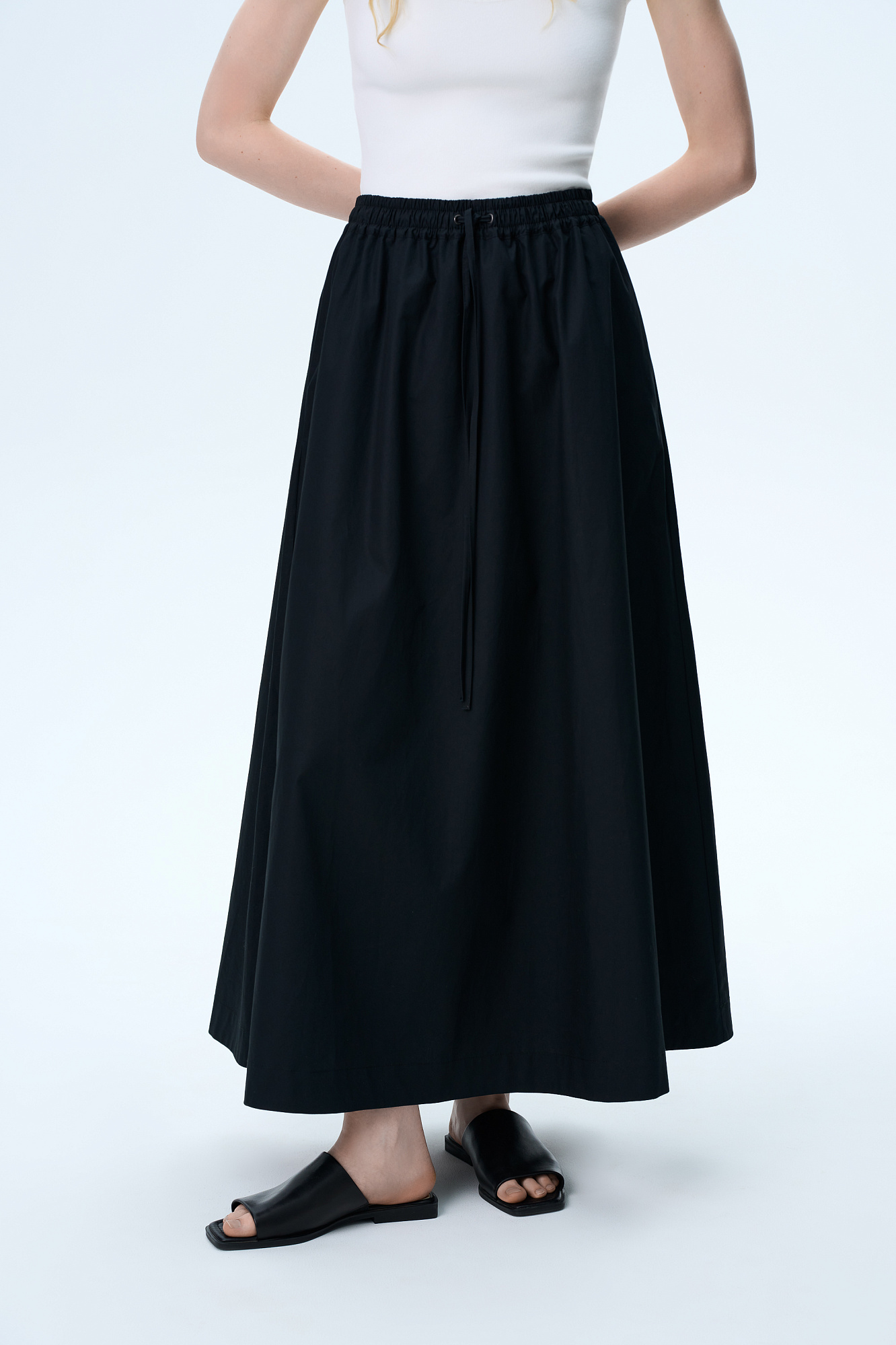 Хлопковая юбка длины макси. Модель прямого кроя, с эластичным поясом на кулиске и карманами.