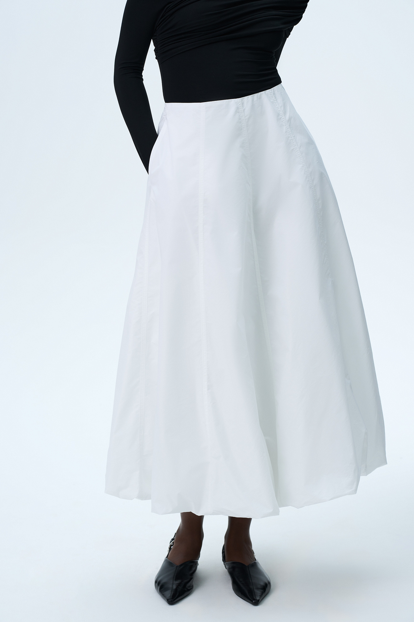 Юбка-баллон длины макси из хлопка. Модель свободного силуэта с застежкой на молнию сзади и боковыми карманами.