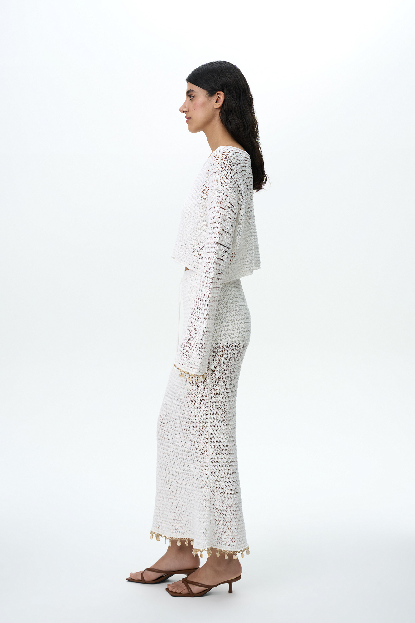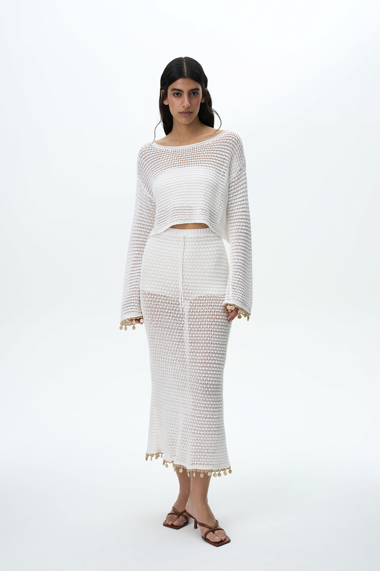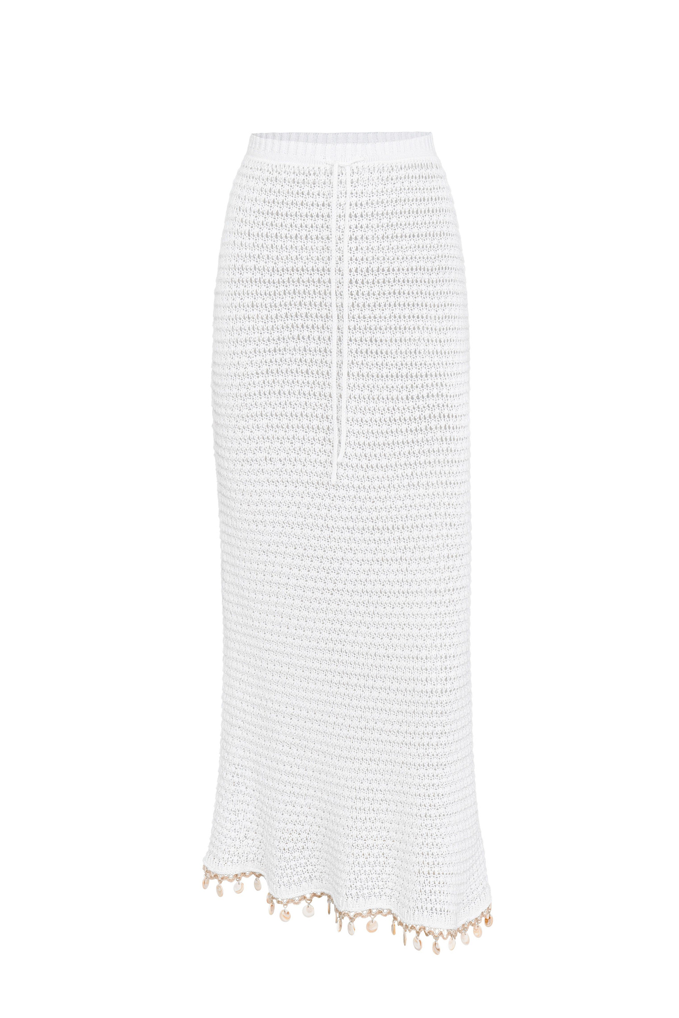 Трикотажная юбка длины макси на эластичном поясе с кулиской. Модель декорирована тесьмой с крупными бусинами. Дополнить образ можно джемпером в таком же стиле.