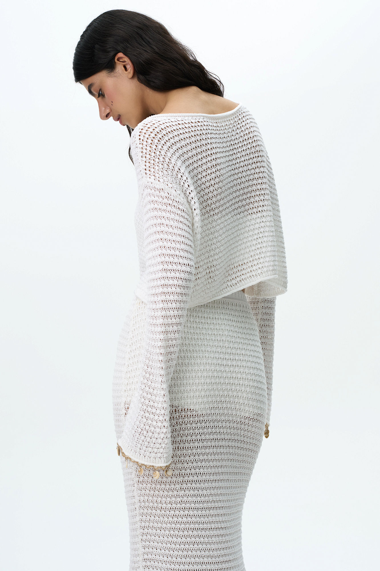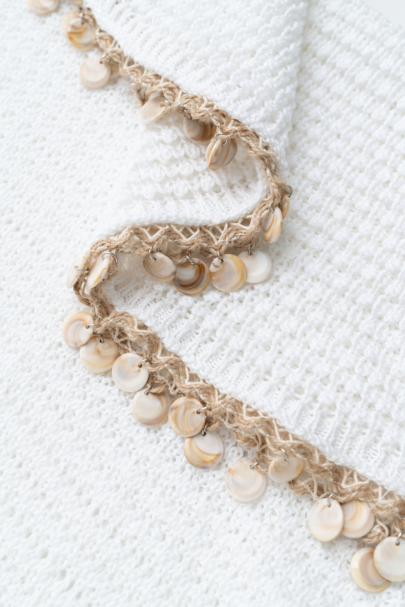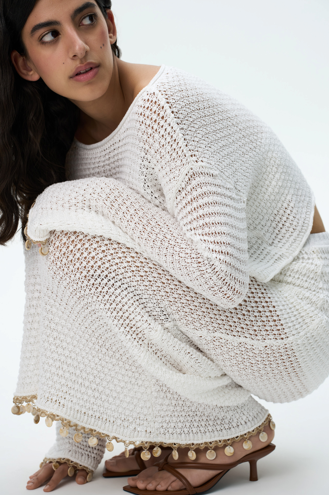 Трикотажная юбка длины макси на эластичном поясе с кулиской. Модель декорирована тесьмой с крупными бусинами. Дополнить образ можно джемпером в таком же стиле.