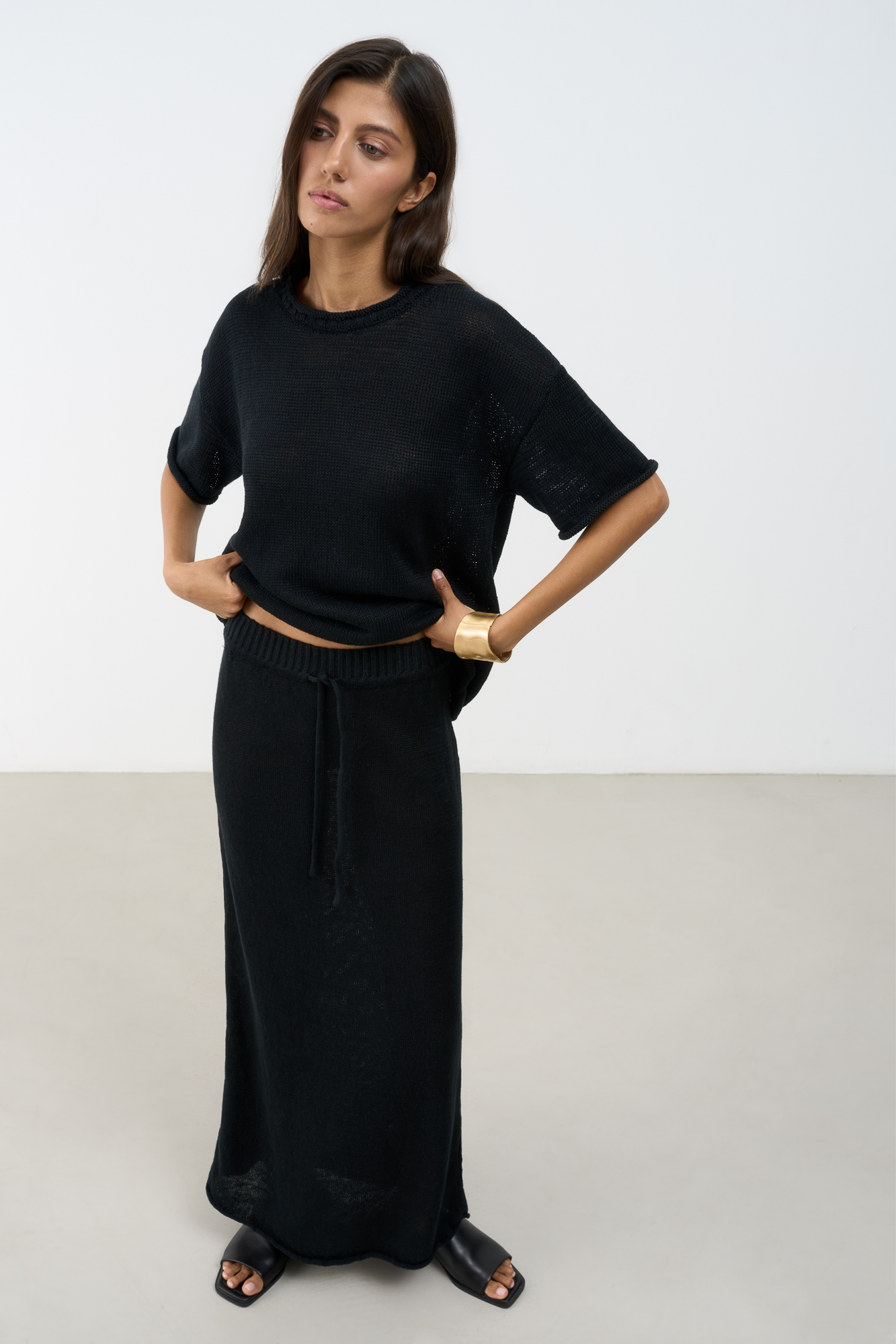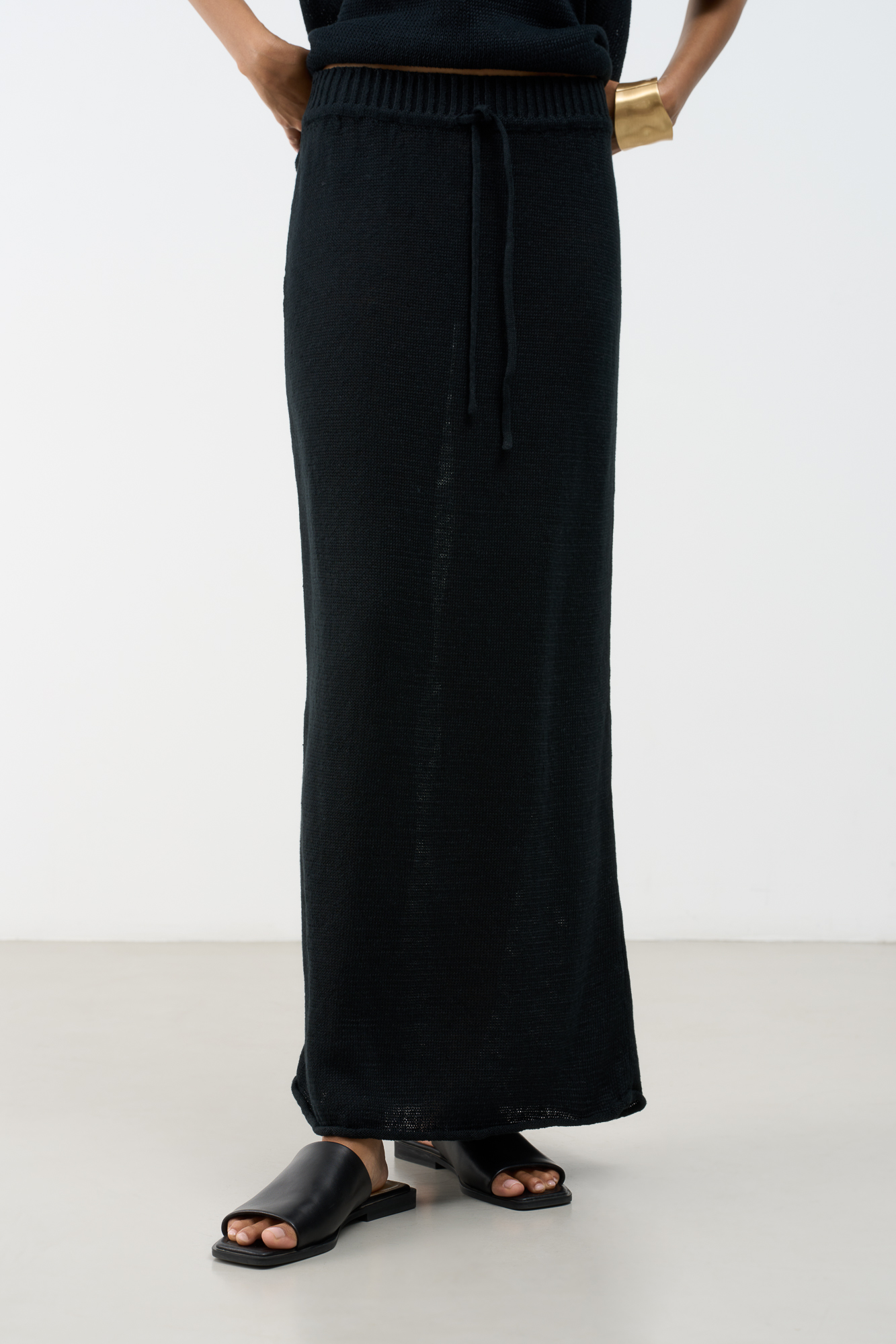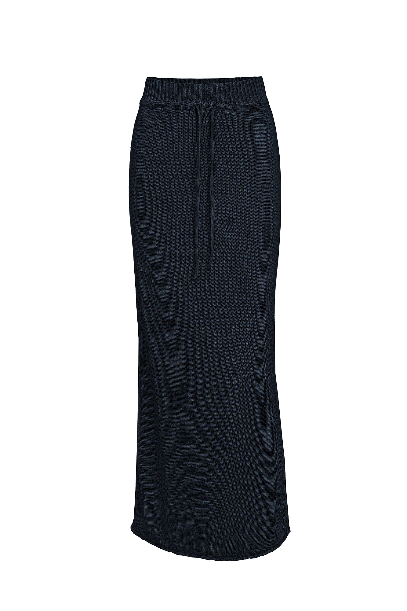 Трикотажная юбка длины макси из 100% льна. Модель свободного силуэта с эластичным поясом в рубчик на кулиске.