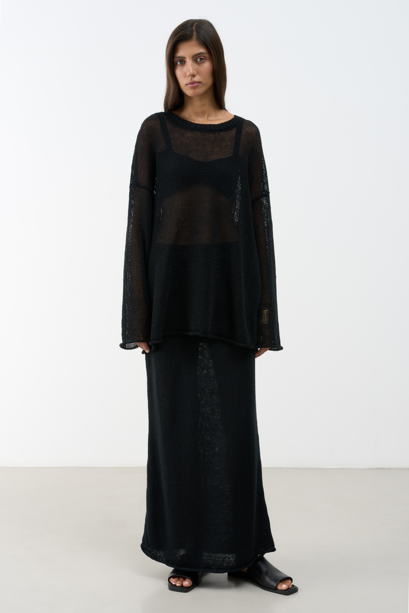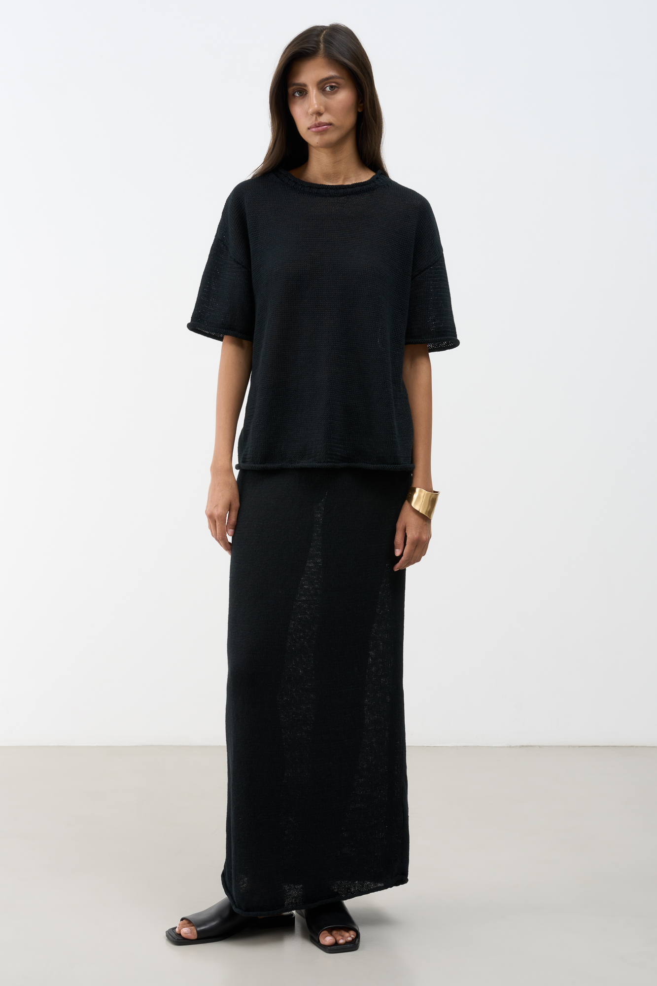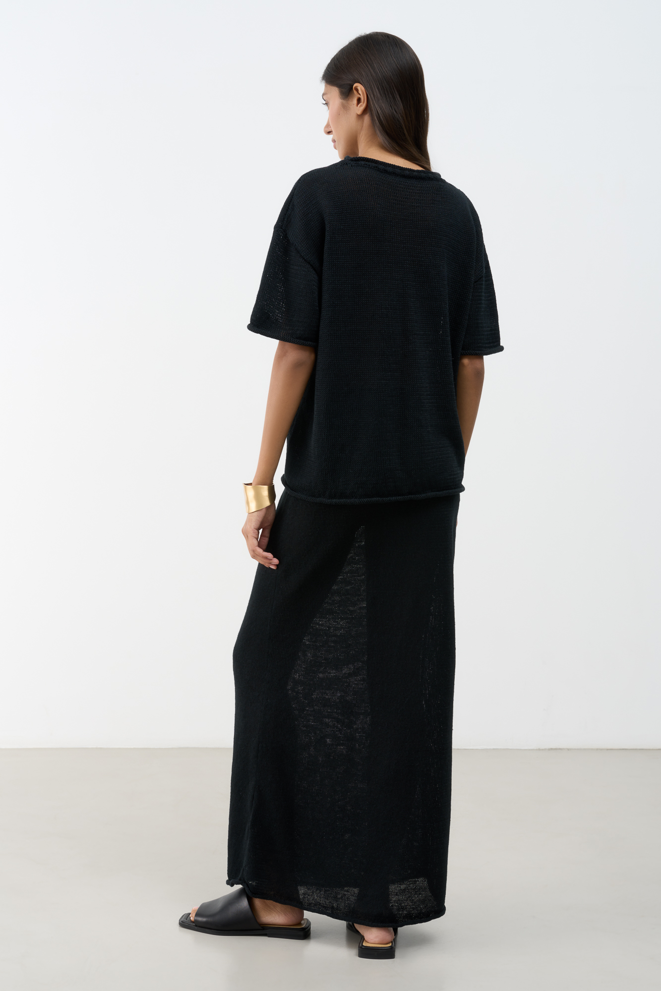 Трикотажная юбка длины макси из 100% льна. Модель свободного силуэта с эластичным поясом в рубчик на кулиске.
