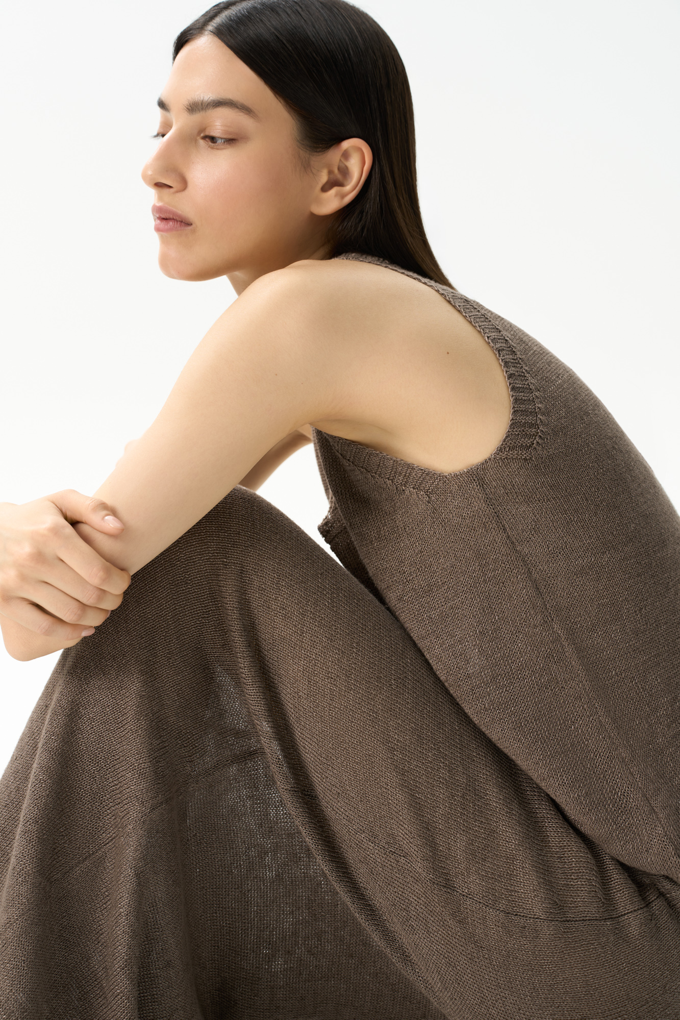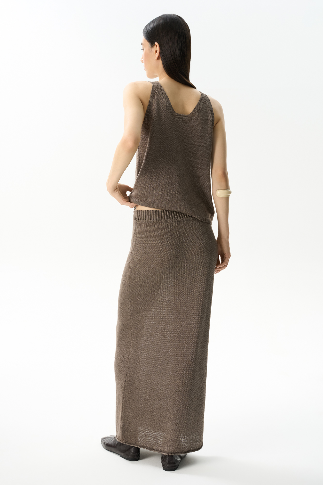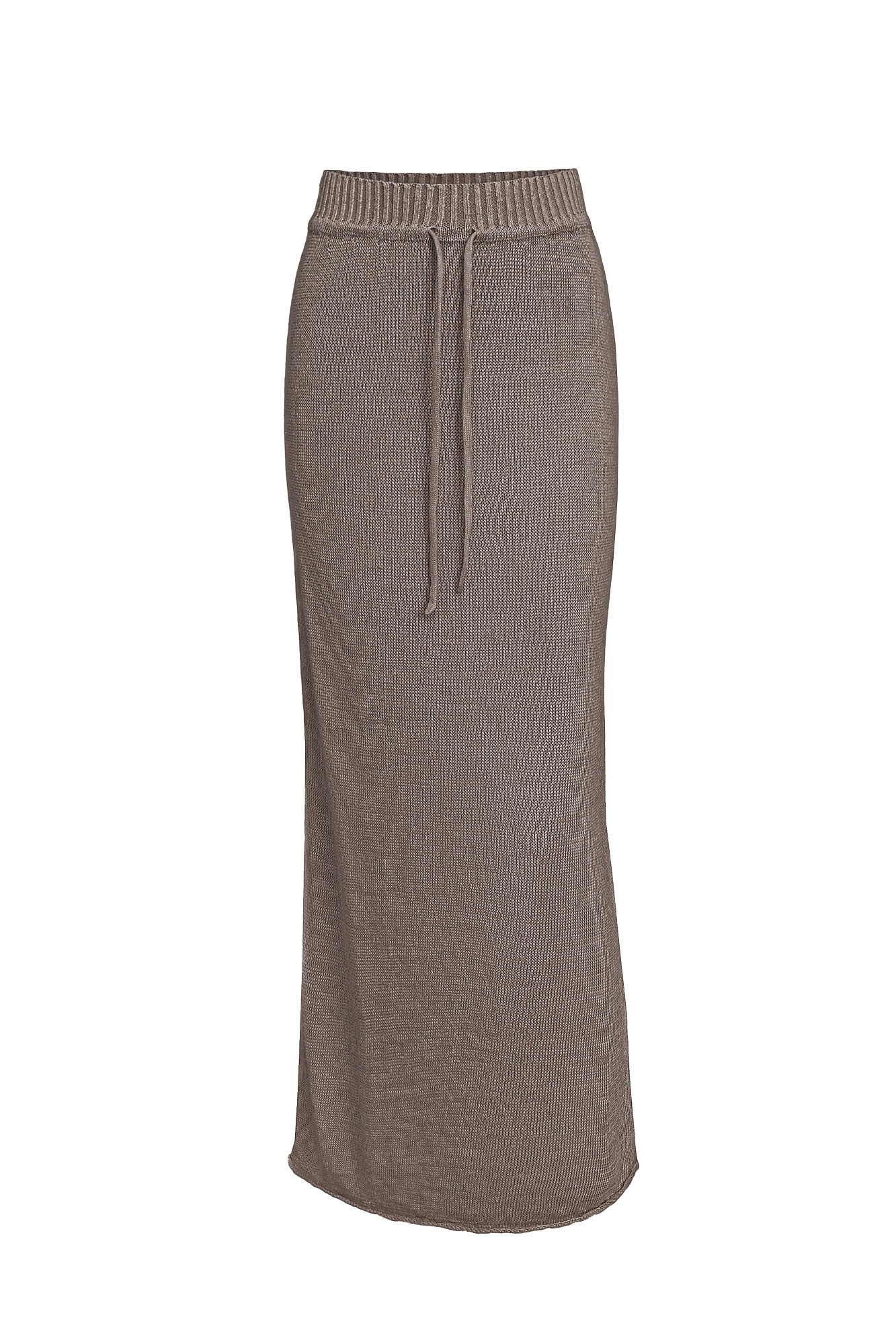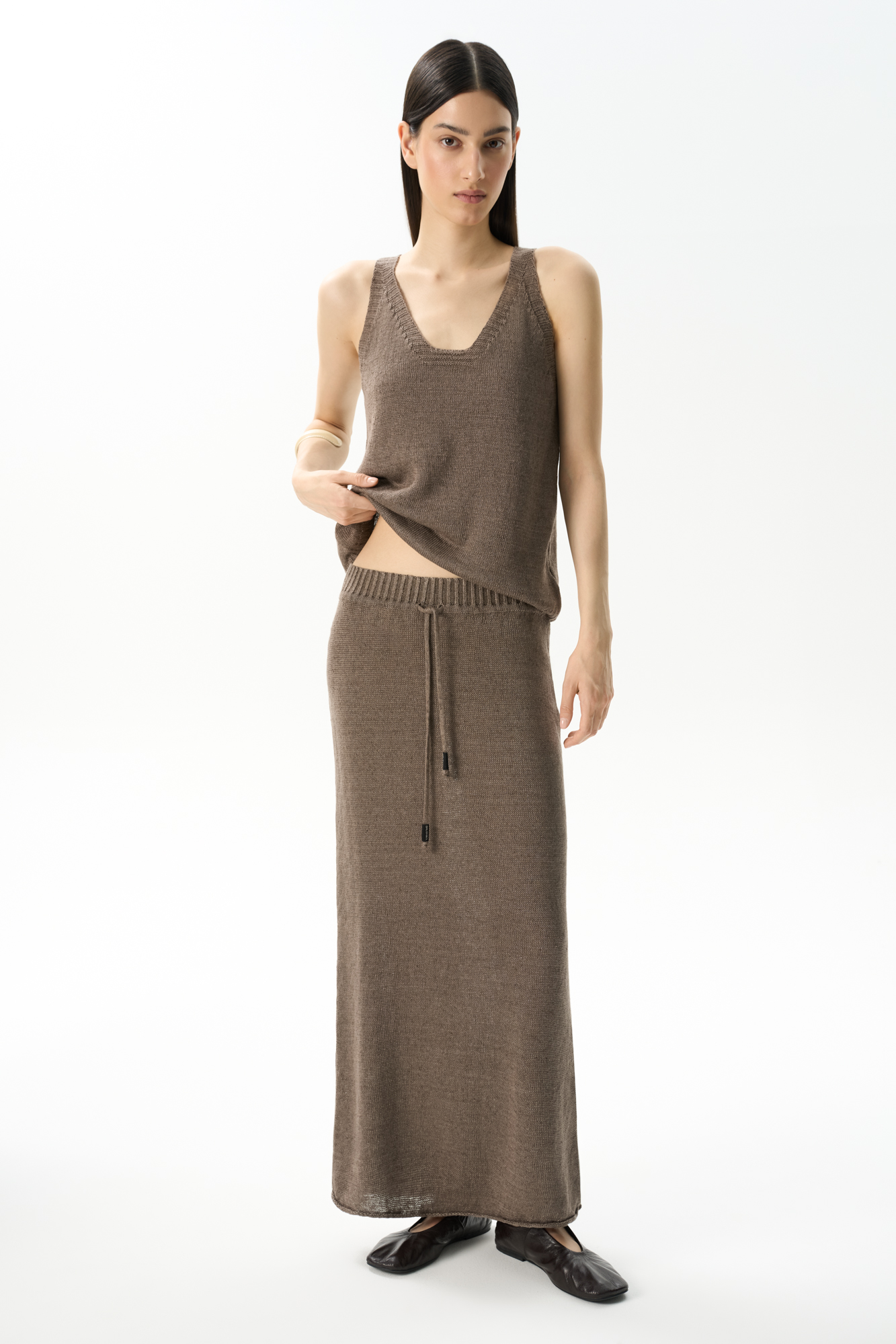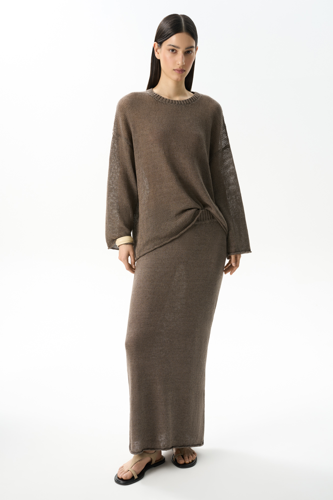 Трикотажная юбка длины макси из 100% льна. Модель свободного силуэта с эластичным поясом в рубчик на кулиске.