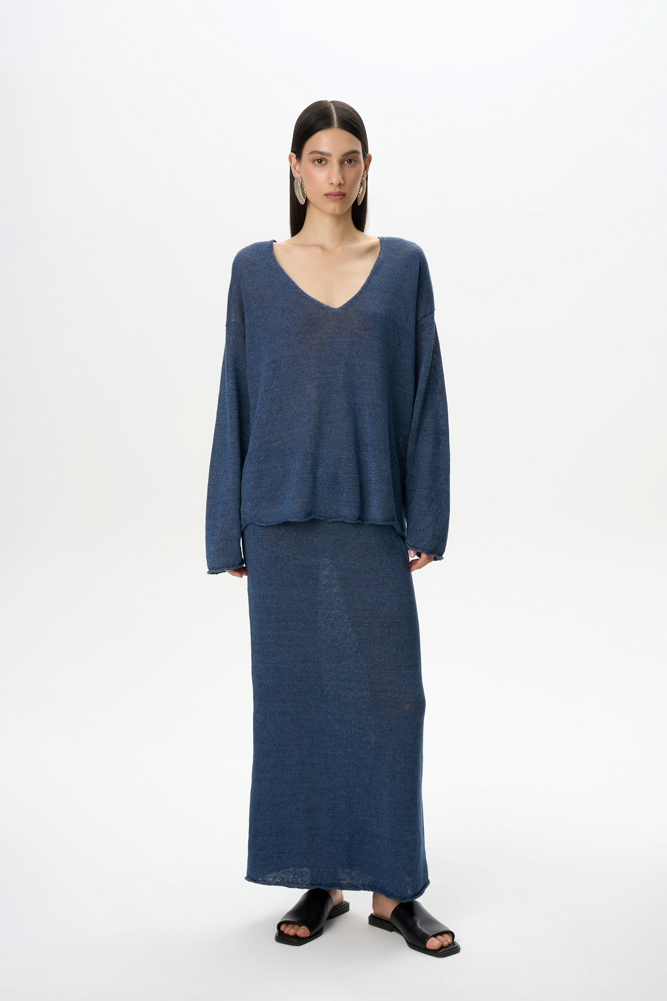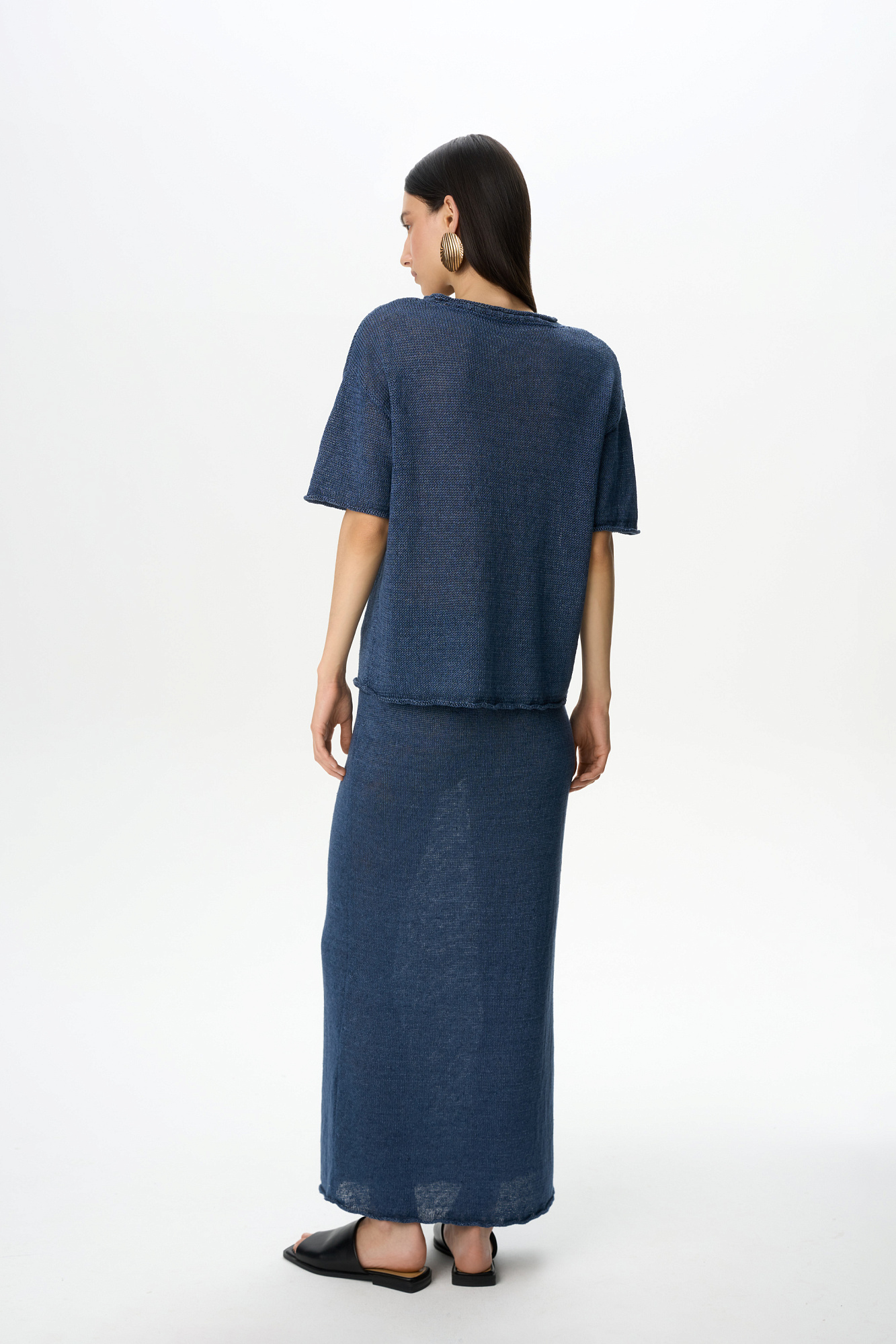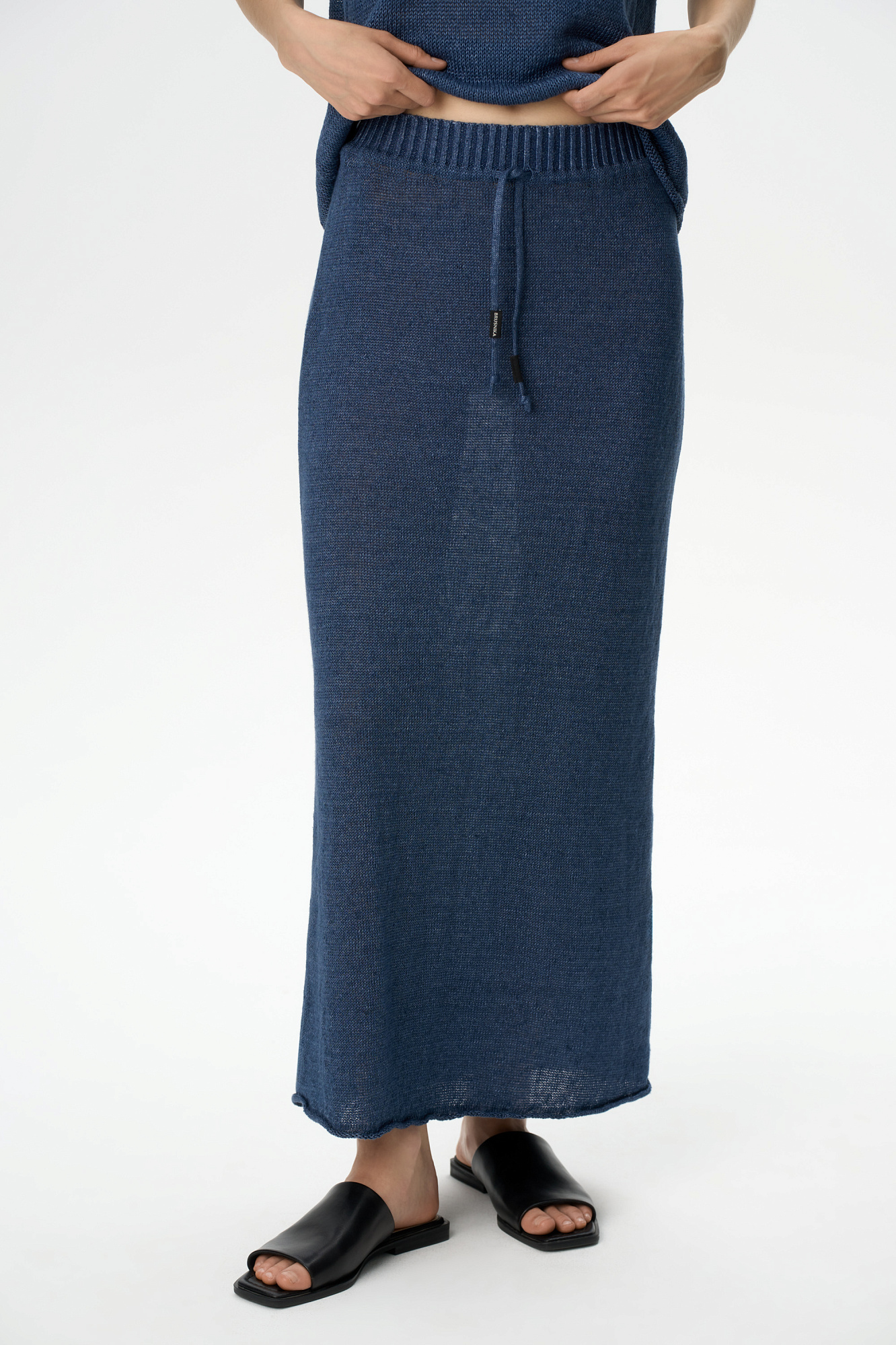 Трикотажная юбка длины макси из 100% льна. Модель свободного силуэта с эластичным поясом в рубчик на кулиске.