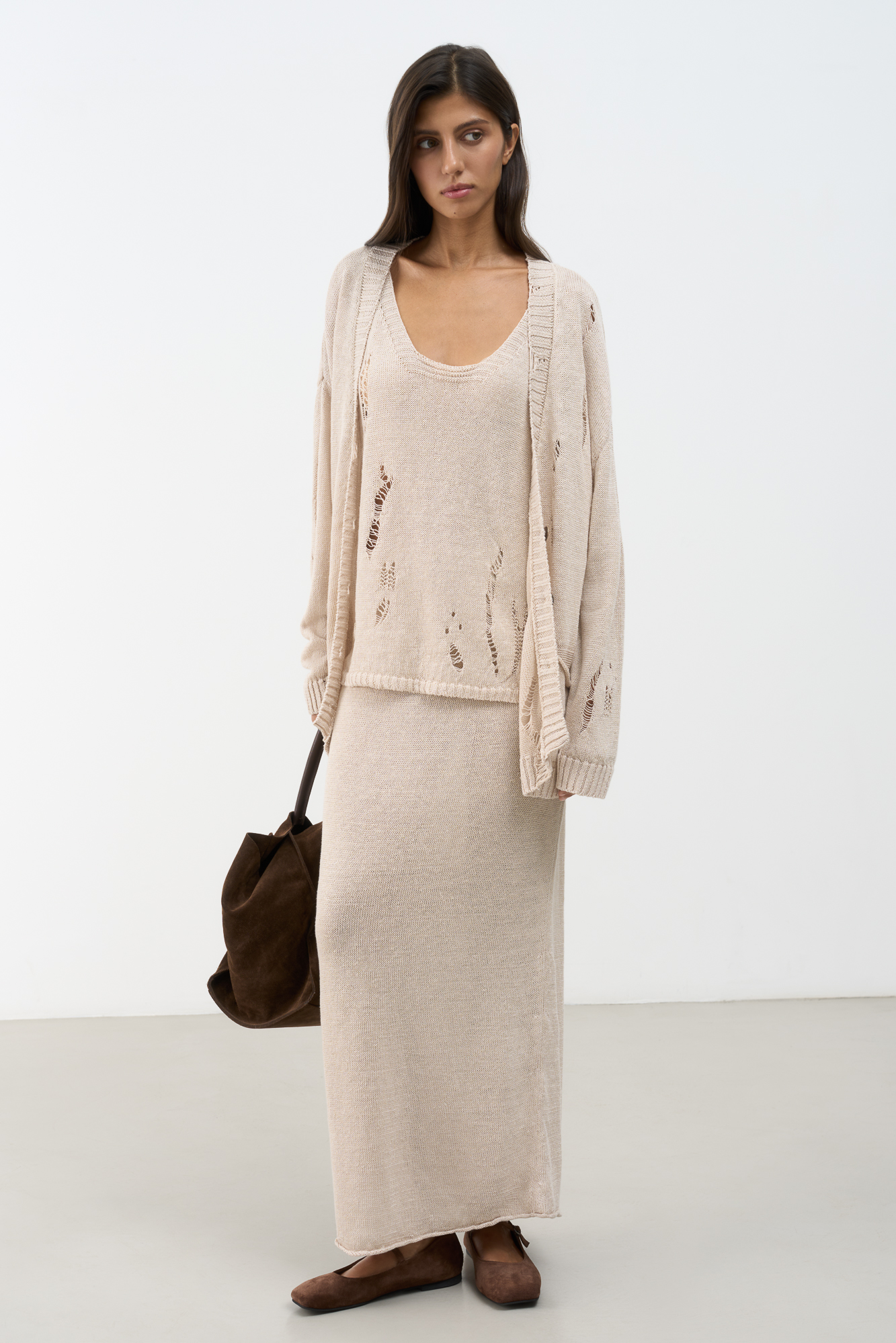 Трикотажная юбка длины макси из 100% льна. Модель свободного силуэта с эластичным поясом в рубчик на кулиске.