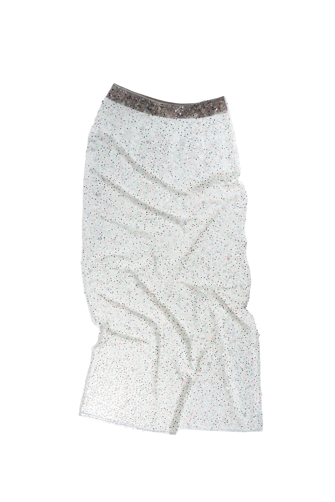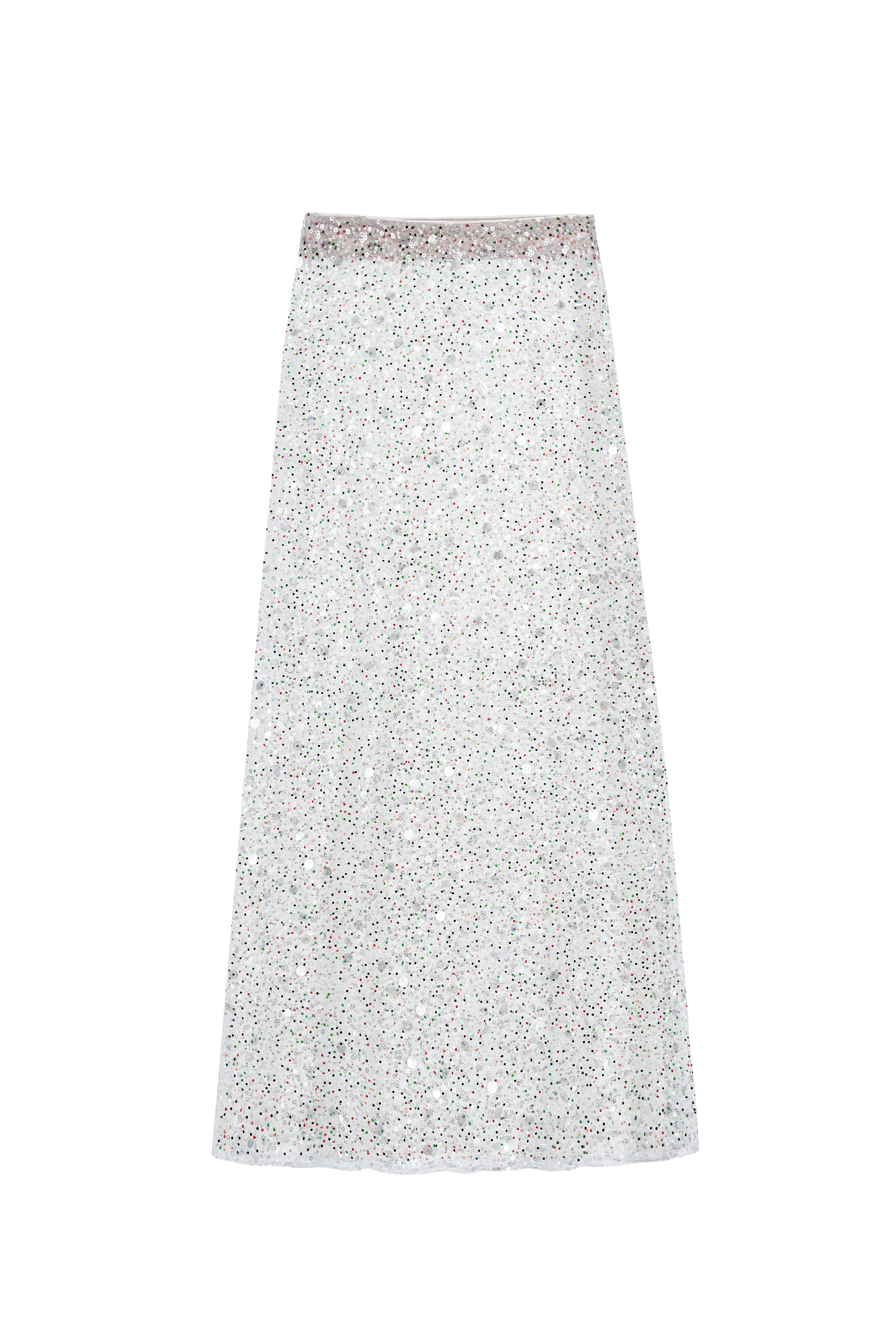 Юбка длины макси, расшитая пайетками и цветным бисером. Модель прямого кроя, с застежкой на молнию. Изделие выполнены без подкладки.