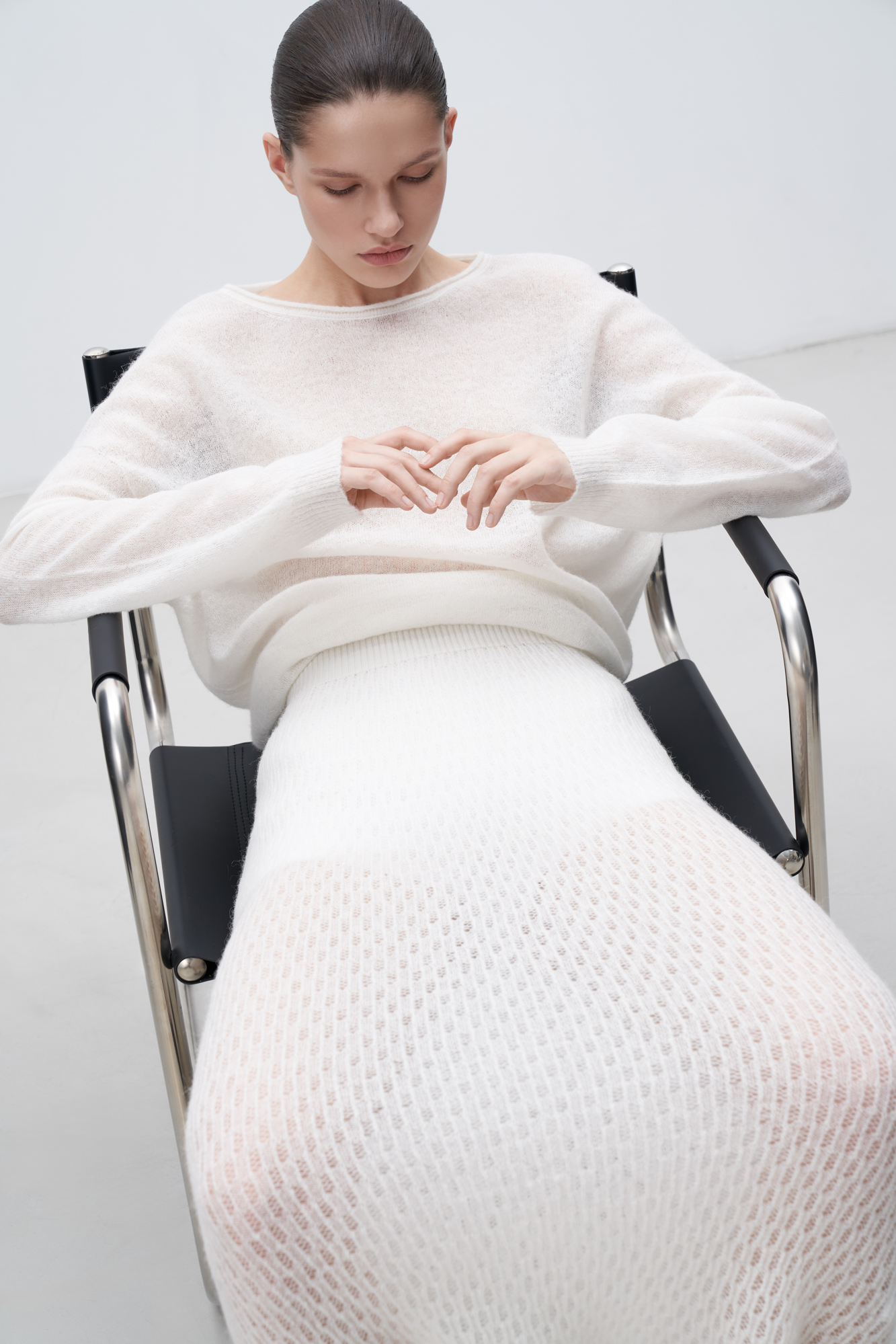 Ажурная юбка длины макси из шерсти мериноса с добавлением шерсти альпака. Эластичный пояс в рубчик. Без подкладки.