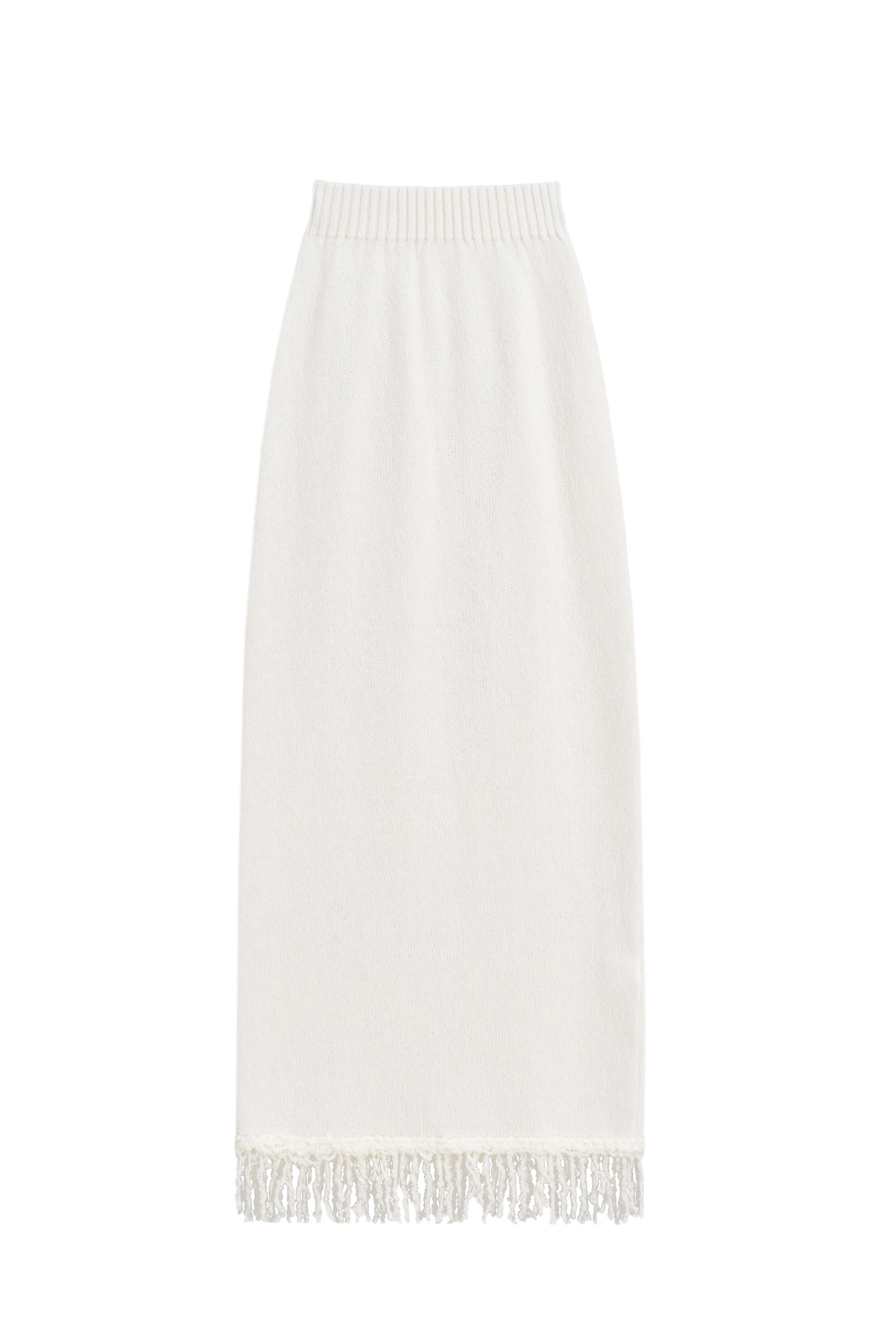 Трикотажная юбка длины макси из ультратонкой шерсти мериноса с добавлением хлопка. Модель прямого силуэта с широким эластичным поясом. Изделие декорировано буклированной бахромой по низу.