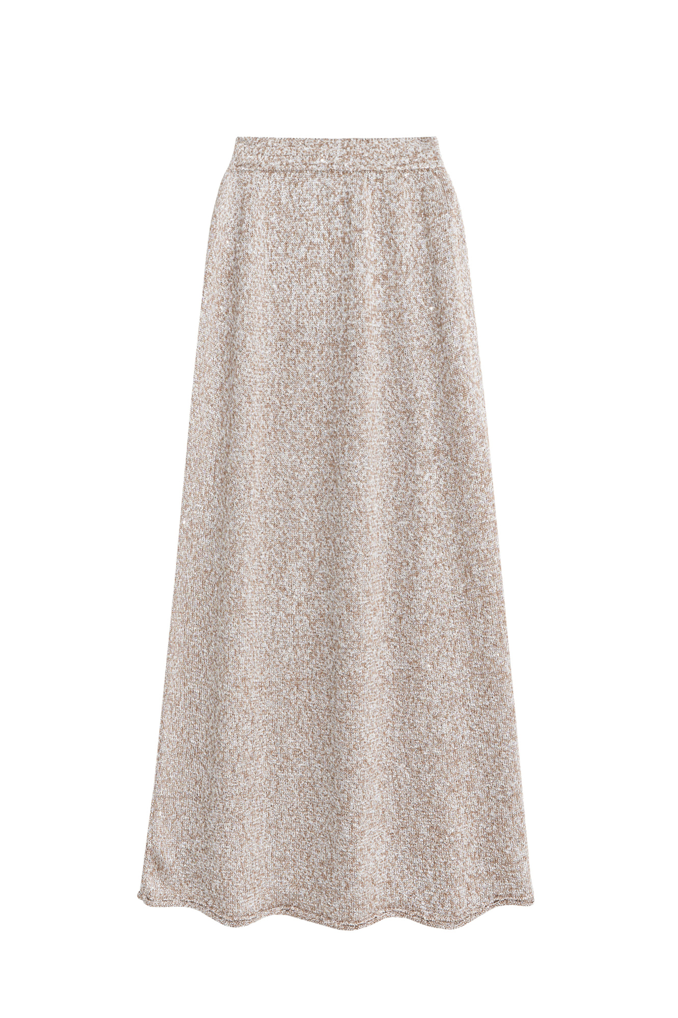 Трикотажная юбка длины макси из хлопка с добавлением вискозы. Модель А-силуэта, с широким эластичным поясом на резинке. Изделие декорировано маленькими пайетками.
