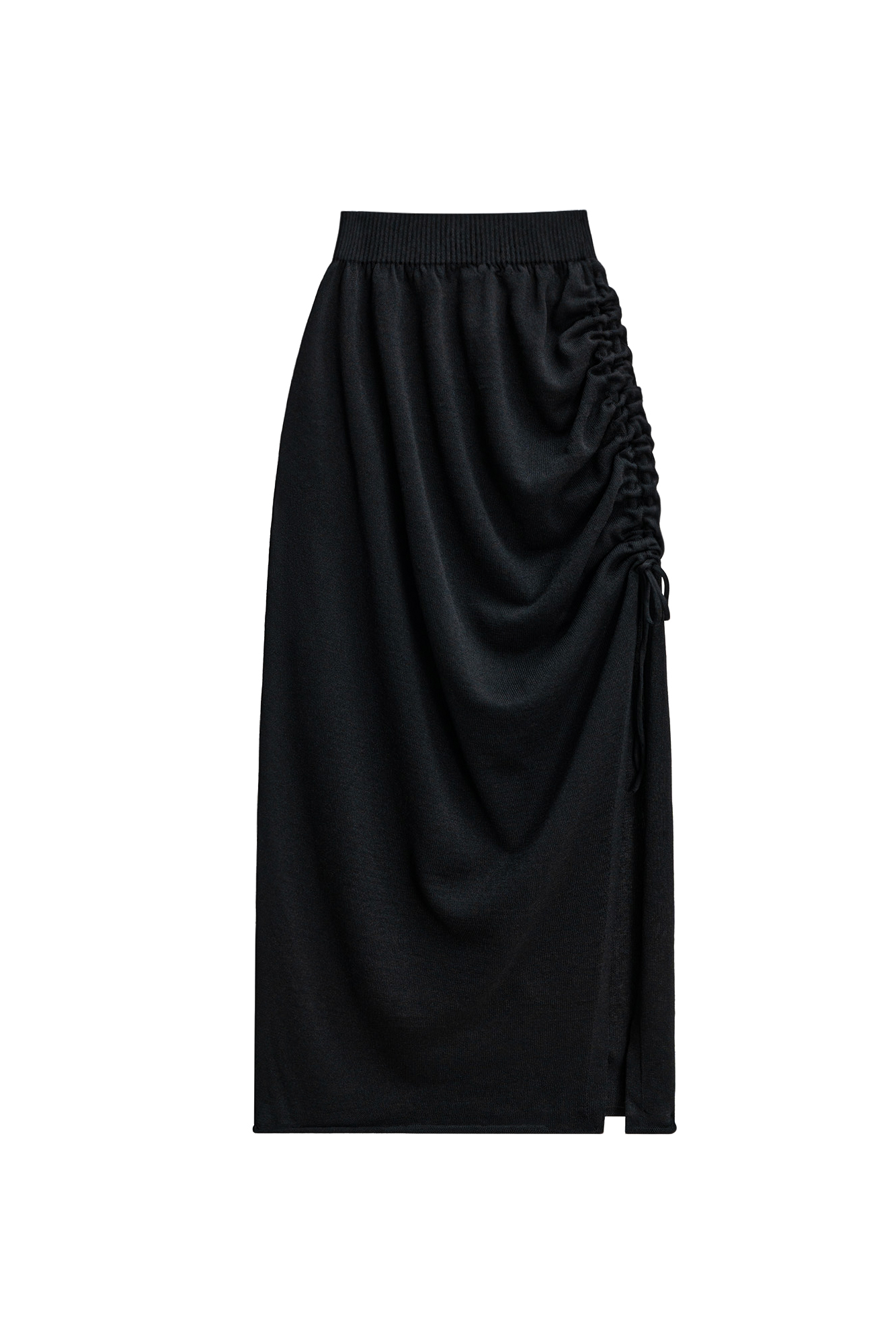 Юбка длины макси из вискозы. Модель приталенного силуэта с широким эластичным поясом на резинке, асимметричной драпировкой и кулиской.
