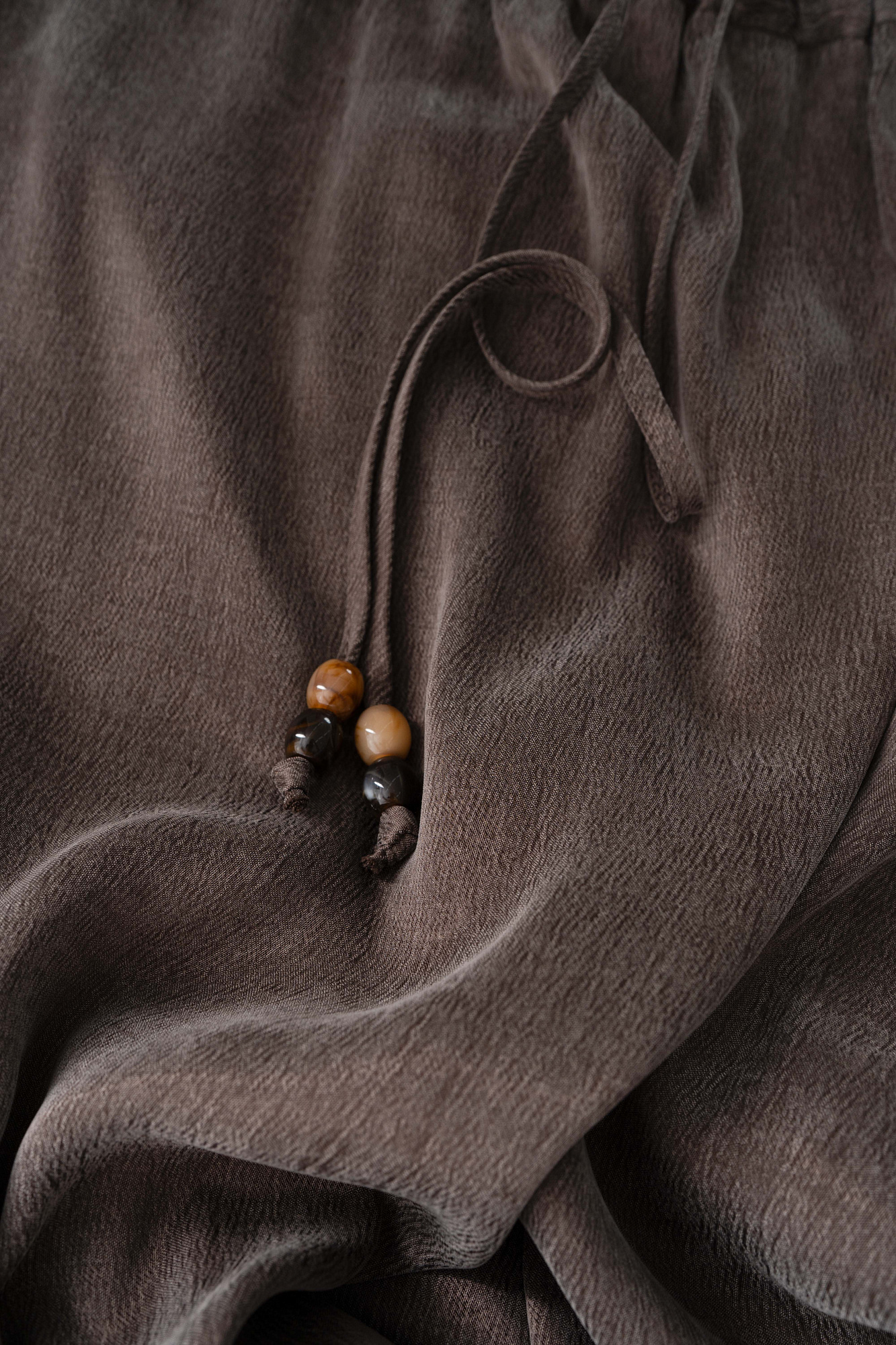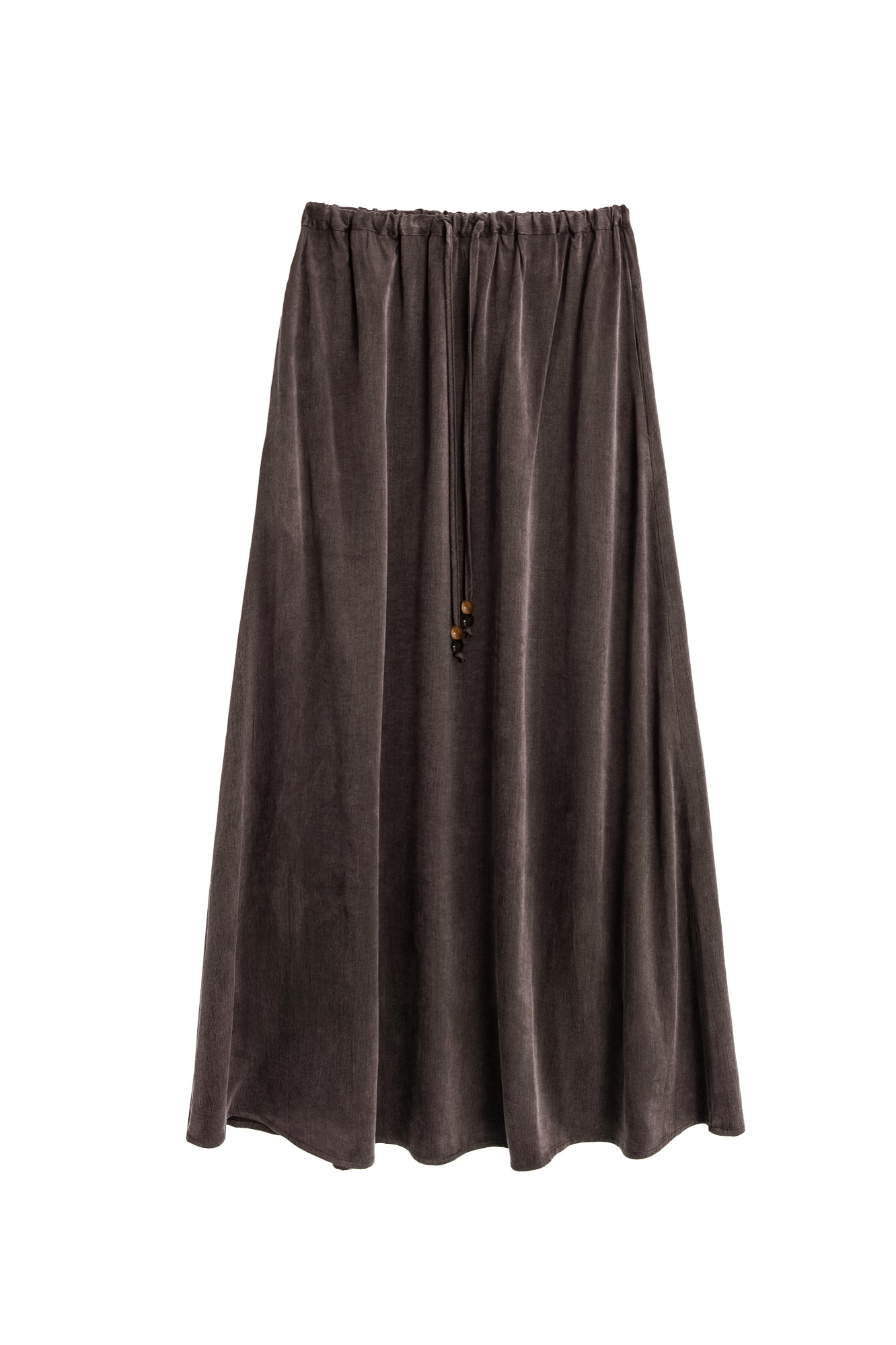 Юбка длины макси из купры. Модель свободного силуэта на кулиске с поясом, декорированным бусинами.