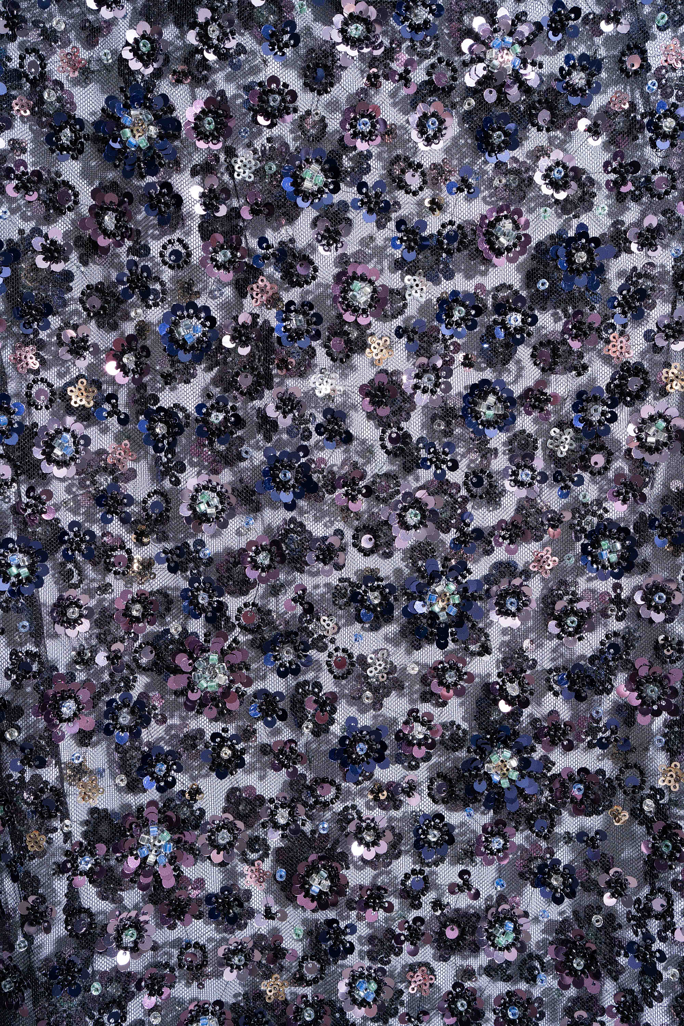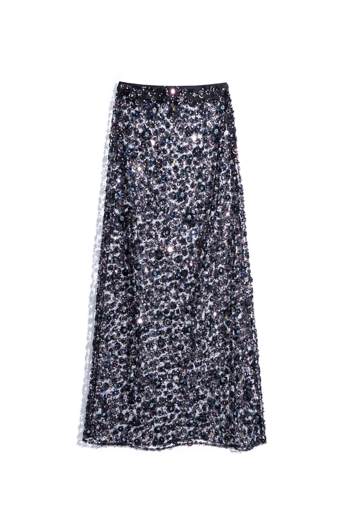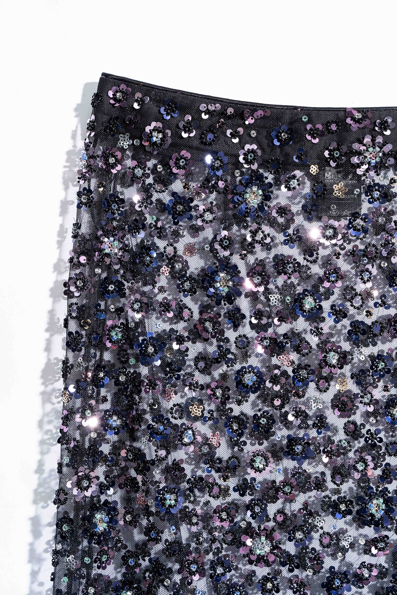 Юбка длины макси с цветочным орнаментом, вышитым пайетками и бисером. Застежка на потайную молнию. Изделие без подкладки.