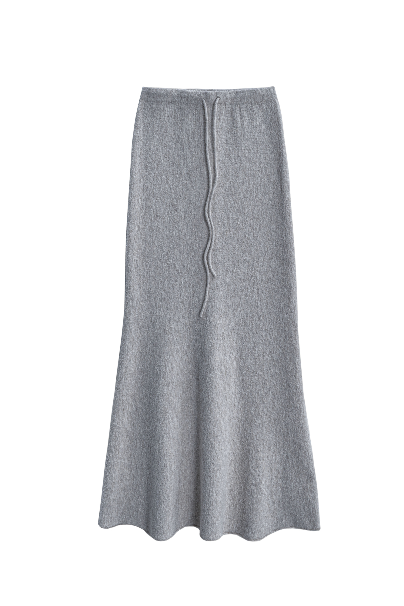 Трикотажная юбка длины макси из буклированной пряжи. Модель по фигуре с расклешенным подолом и поясом, дополненным кулиской. Дополнить образ можно джемпером в таком же стиле.