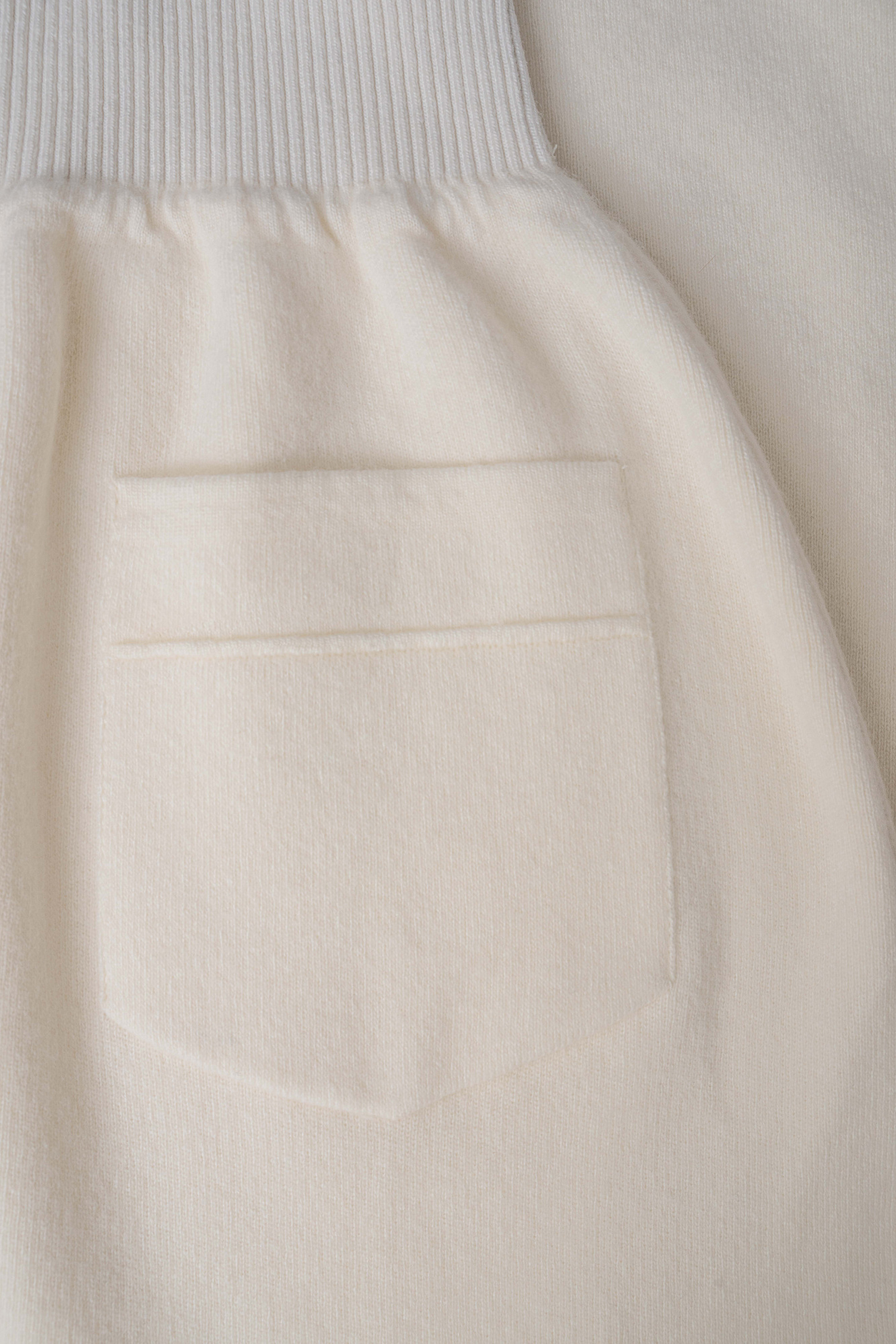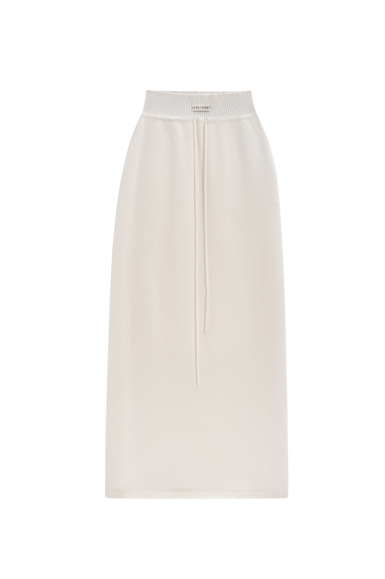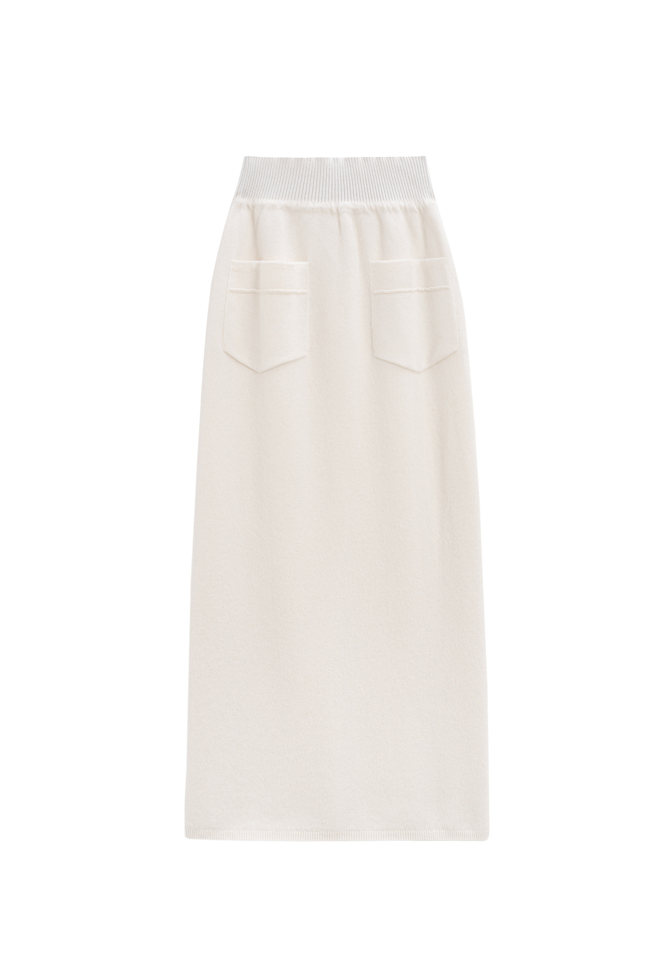 Трикотажная юбка длины макси из кашемира и шерсти. Модель по фигуре, с широким эластичным поясом в рубчик, дополненным кулиской и двумя накладными карманами сзади. Изделие декорировано вывязанным логотипом.