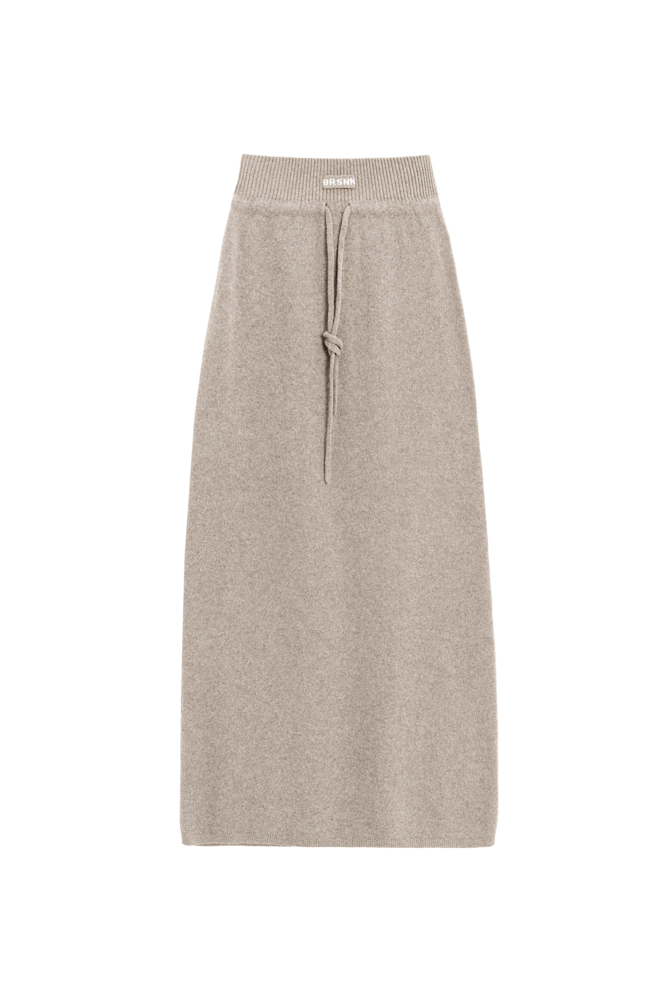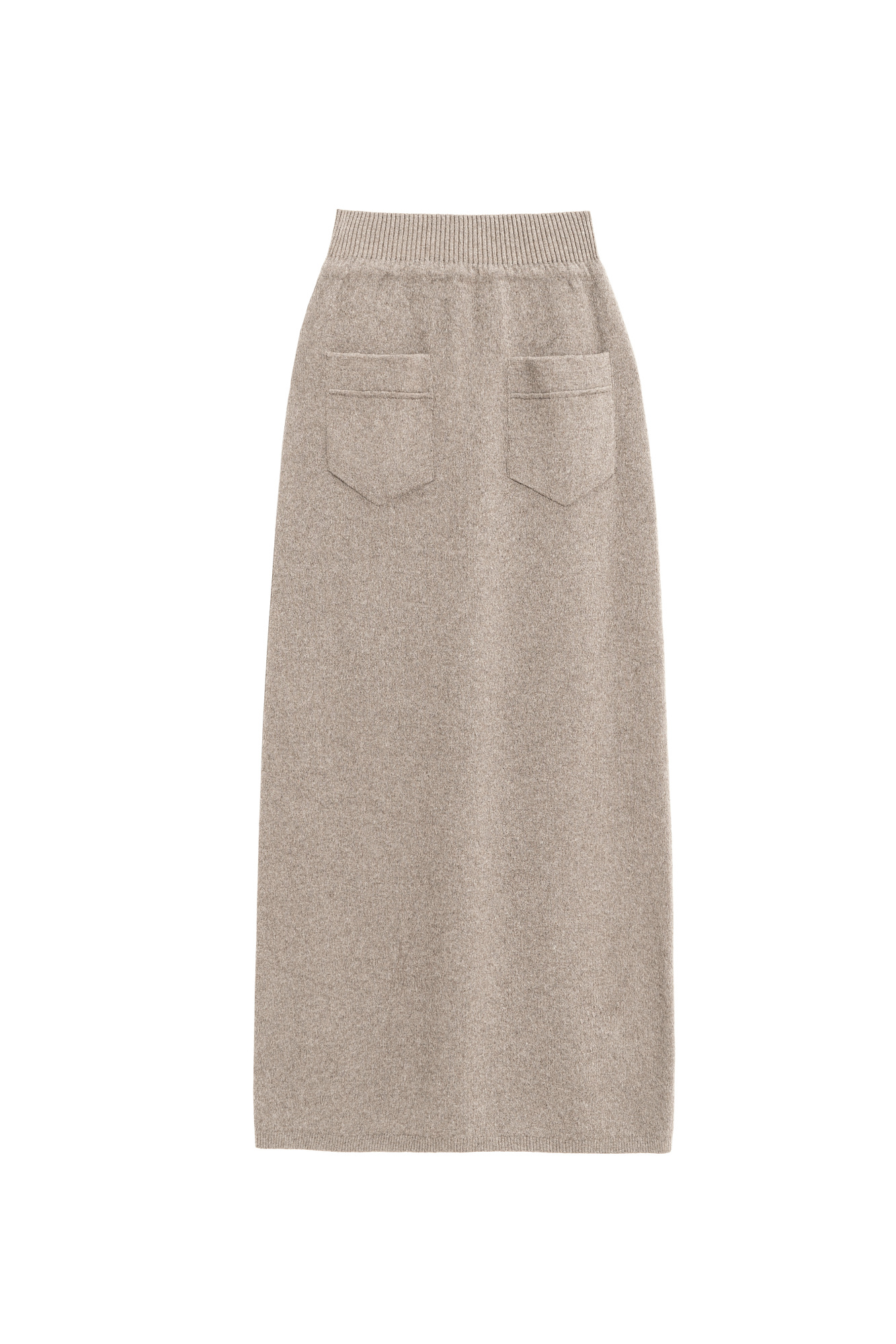 Трикотажная юбка длины макси из кашемира и шерсти. Модель по фигуре, с широким эластичным поясом в рубчик, дополненным кулиской и двумя накладными карманами сзади. Изделие декорировано вывязанным логотипом.