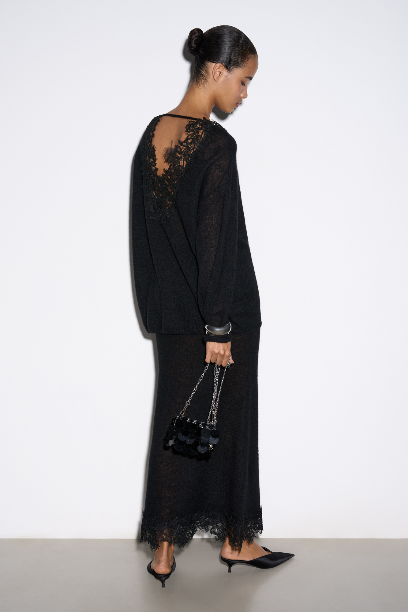 Трикотажная юбка из шерсти мериноса экстрафайн и альпака экстрафайн. Модель А-силуэта с широким поясом на резинке. Подол изделия декорирован кружевом.