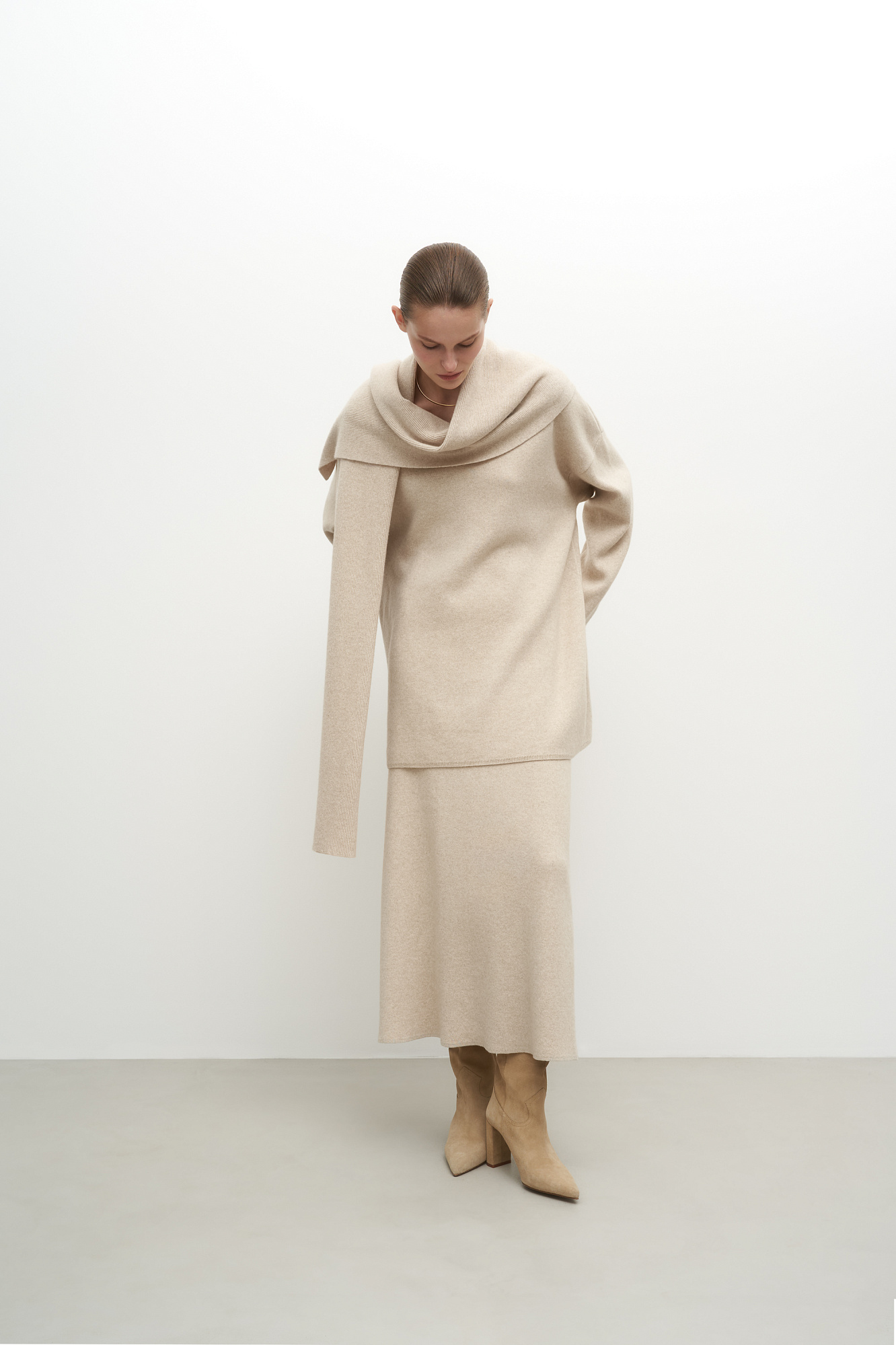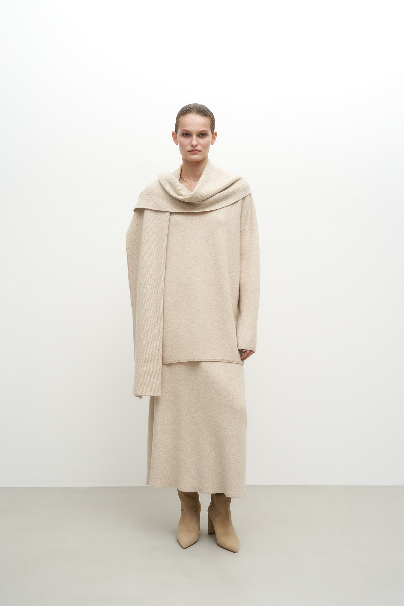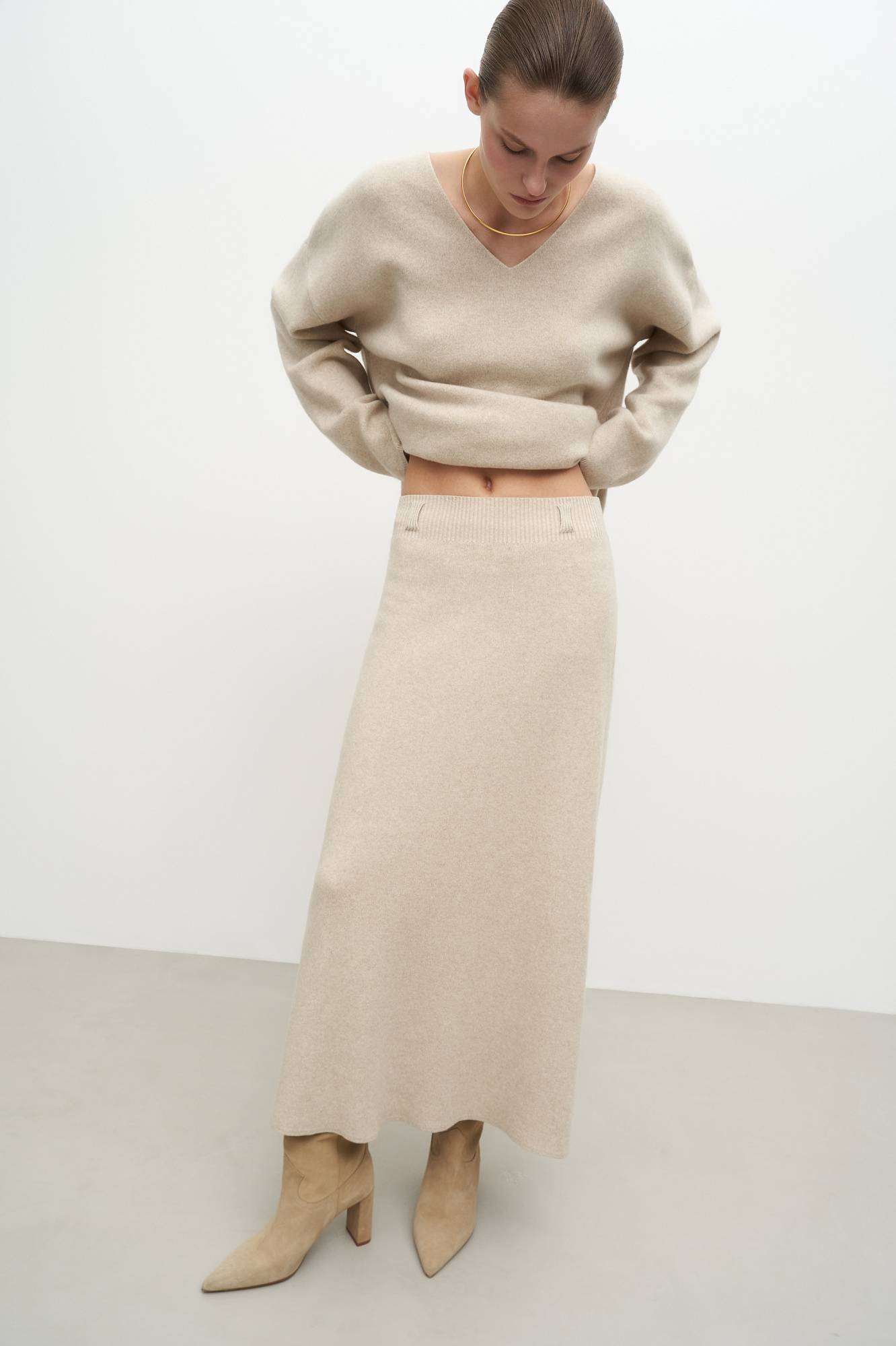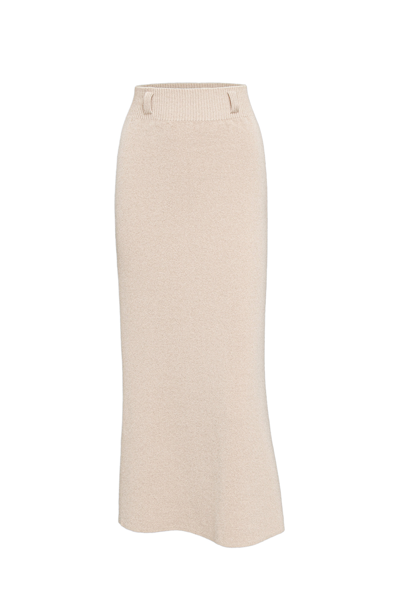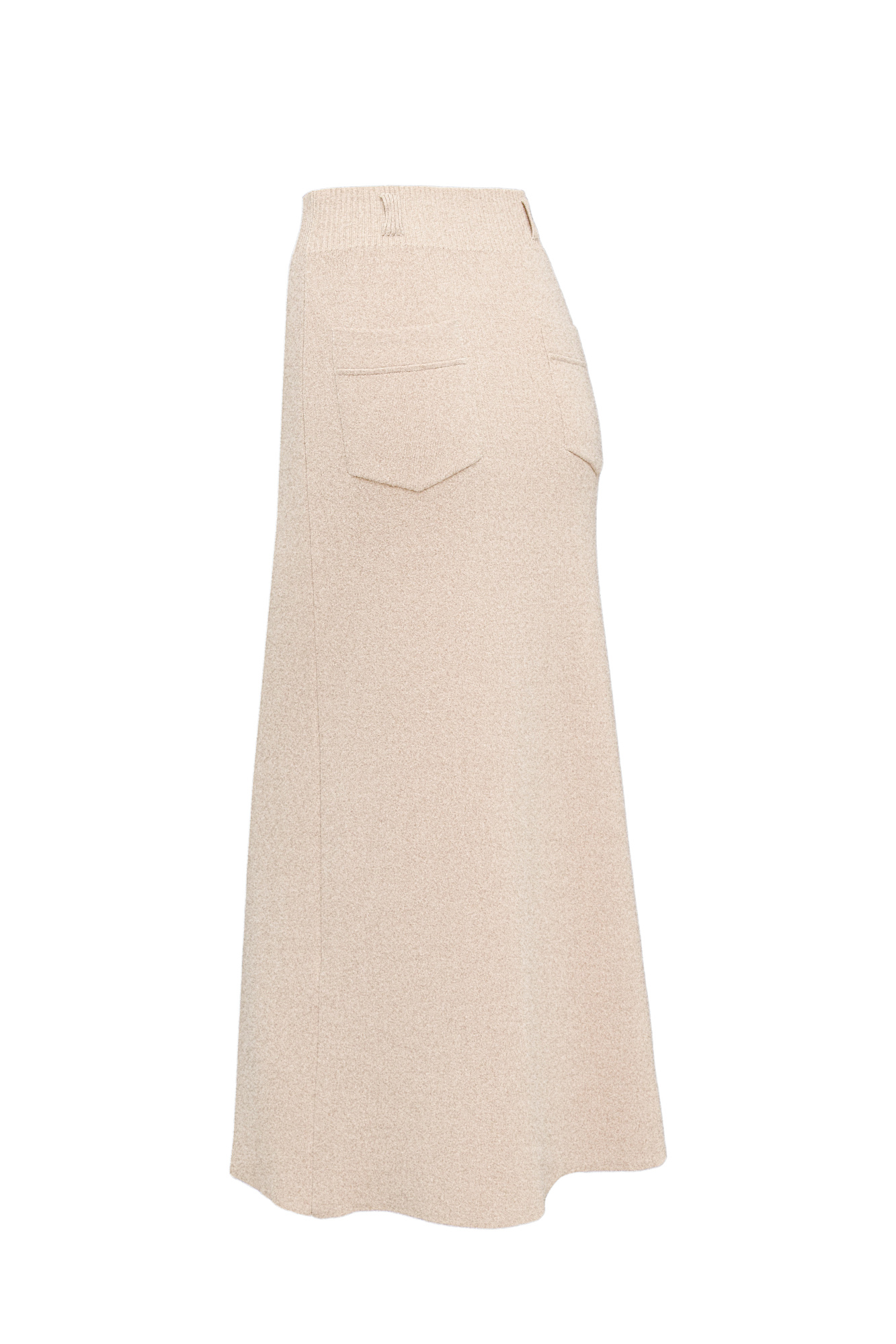Трикотажная юбка длины миди, выполненная из смесовой шерсти с добавлением кашемира. Модель расклешенного силуэта, с широким эластичным поясом со шлевками и двумя накладными карманами сзади.
