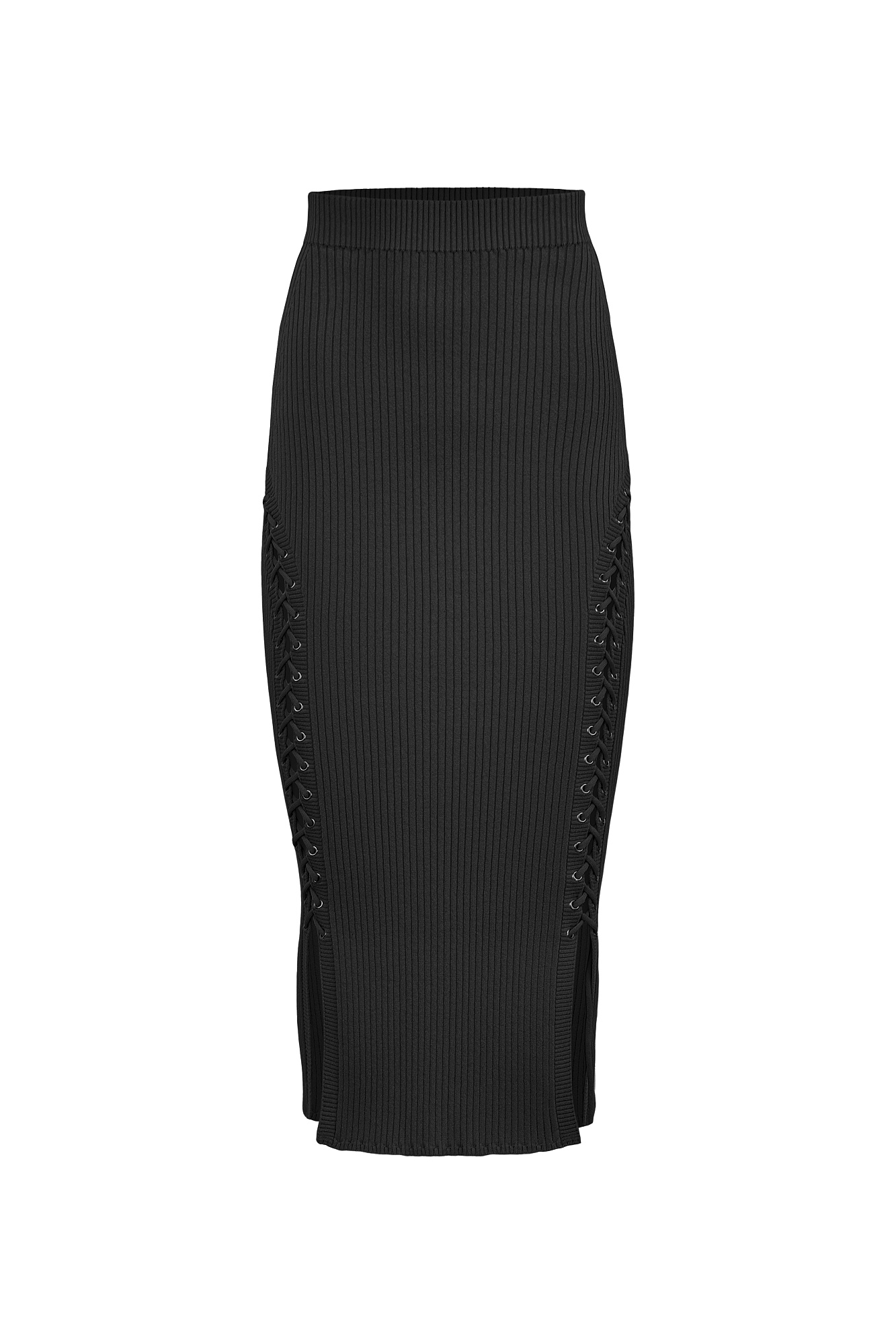 Трикотажная юбка длины миди из вискозы. Модель приталенного силуэта с эластичным поясом. Симметричная шнуровка по бокам. Дополнить образ можно топом в таком же стиле.