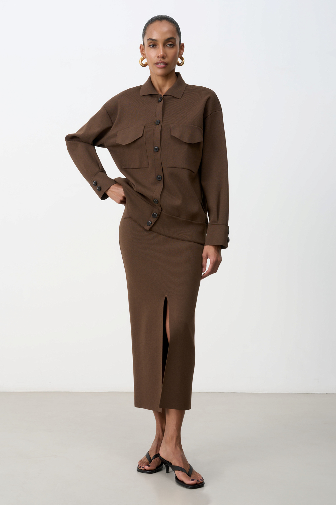 Трикотажная юбка-карандаш длины миди из вискозы. Модель приталенного силуэта с разрезом спереди, задними карманами и широким эластичным поясом.