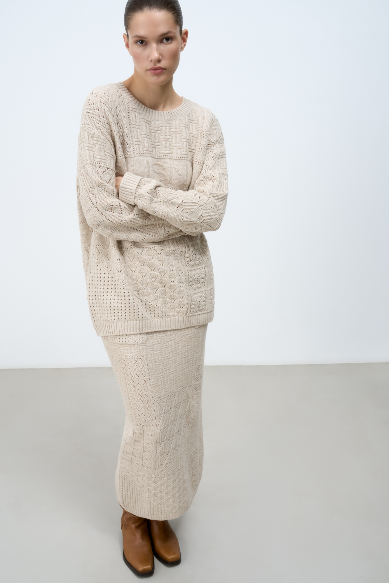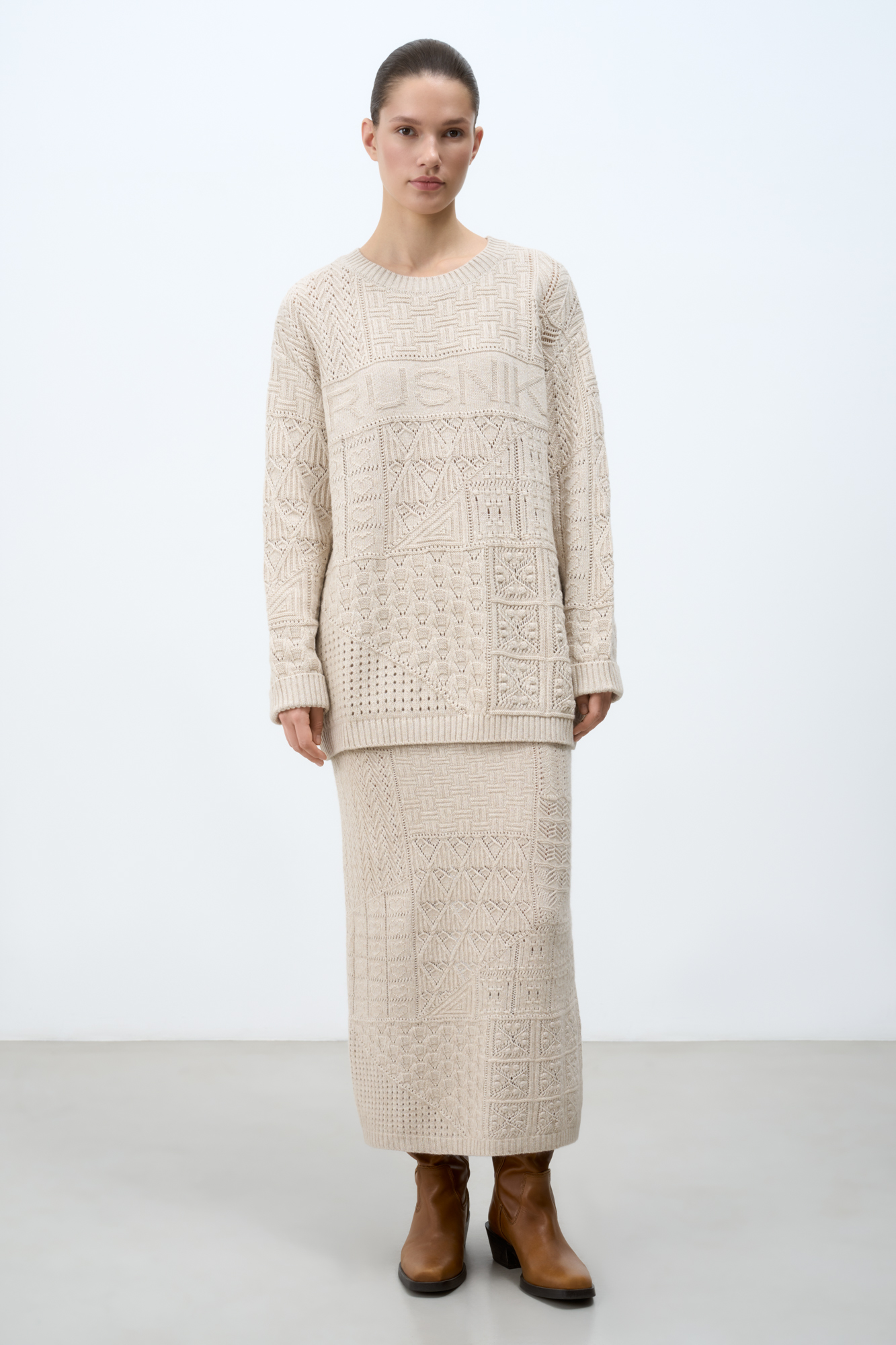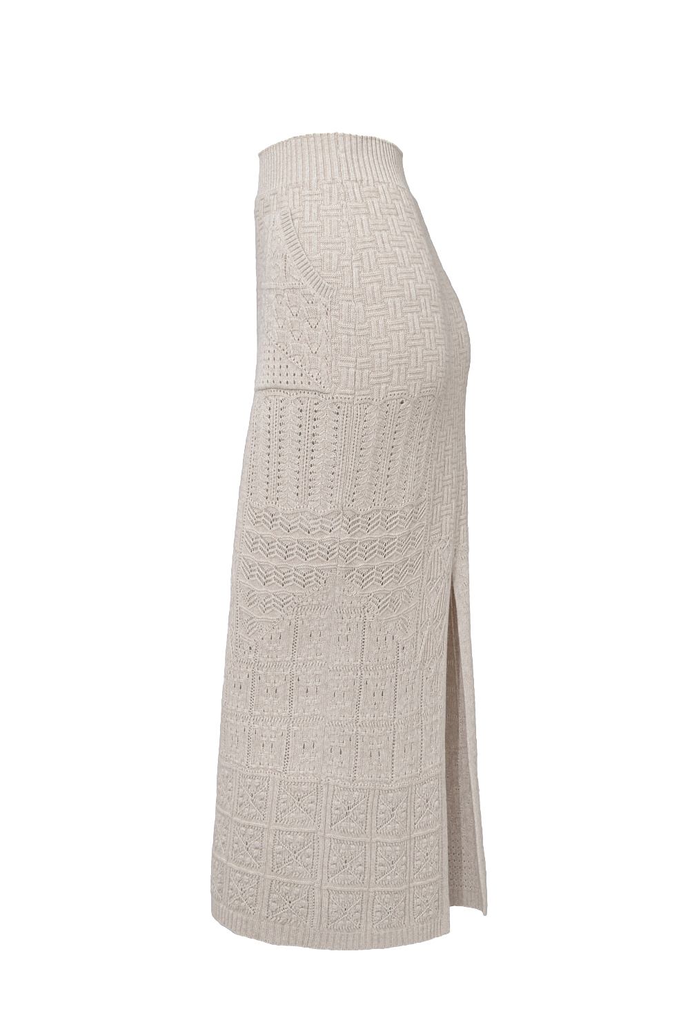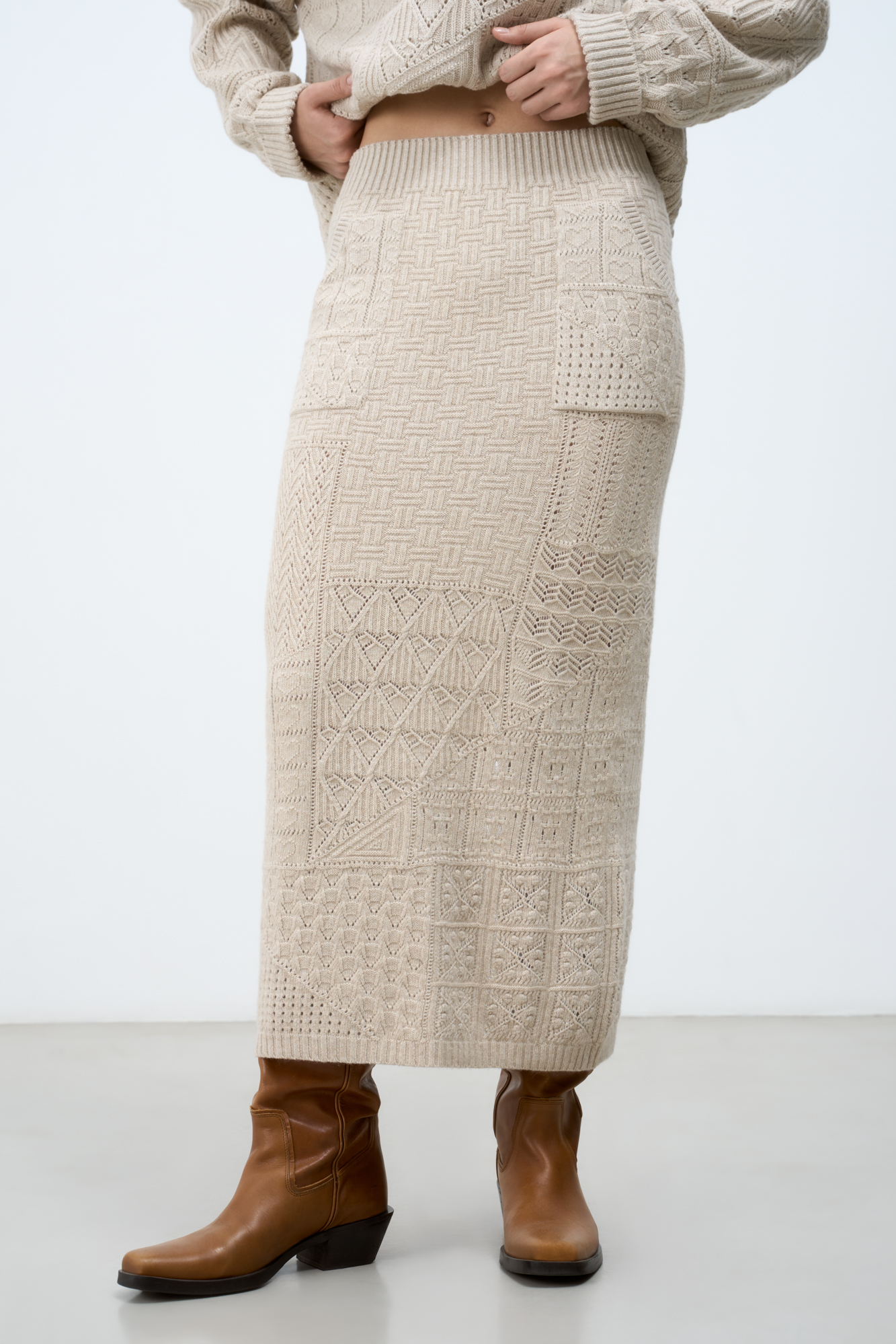 Трикотажная юбка длины миди из кашемира и шерсти. Модель приталенного силуэта с разрезом сзади и накладными карманами. Дополнить образ можно джемпером в таком же стиле.